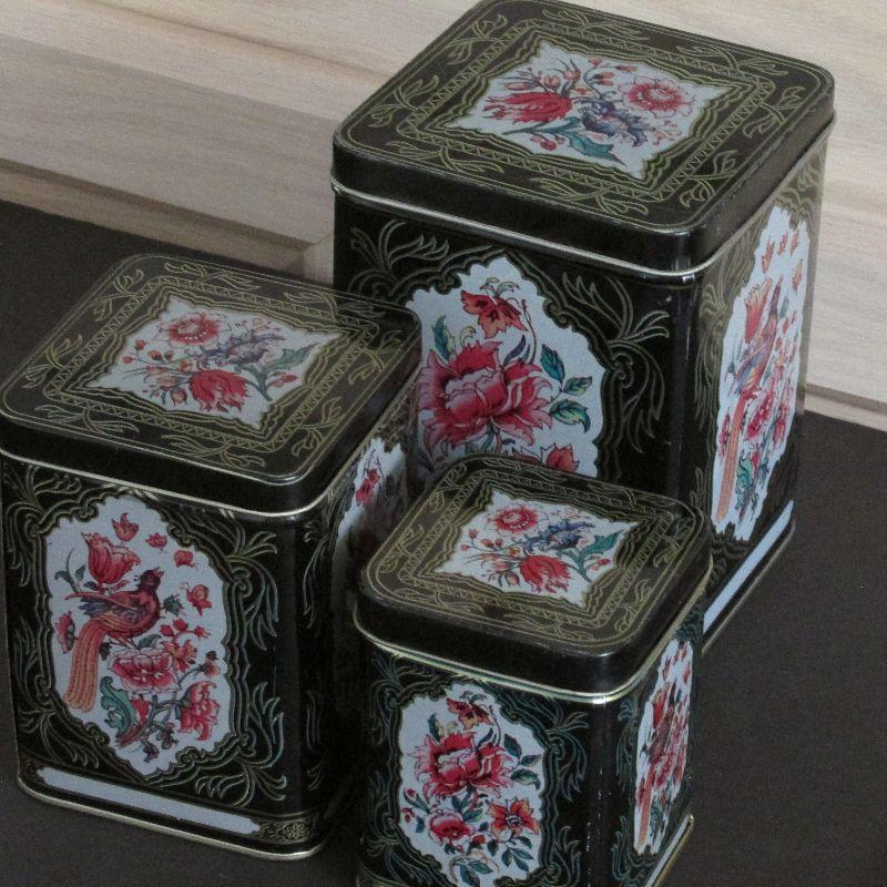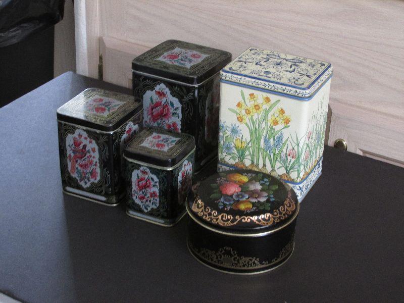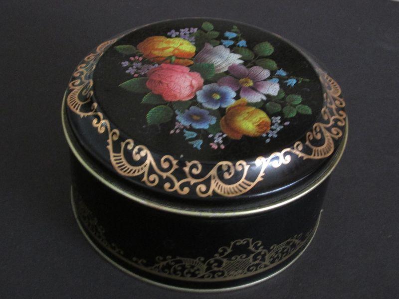 3 Tins MIC with floral décor differing sizes, a hallmark tin, and a circular made in england tin.