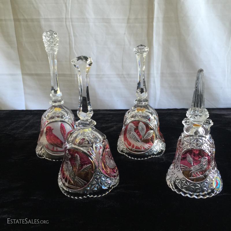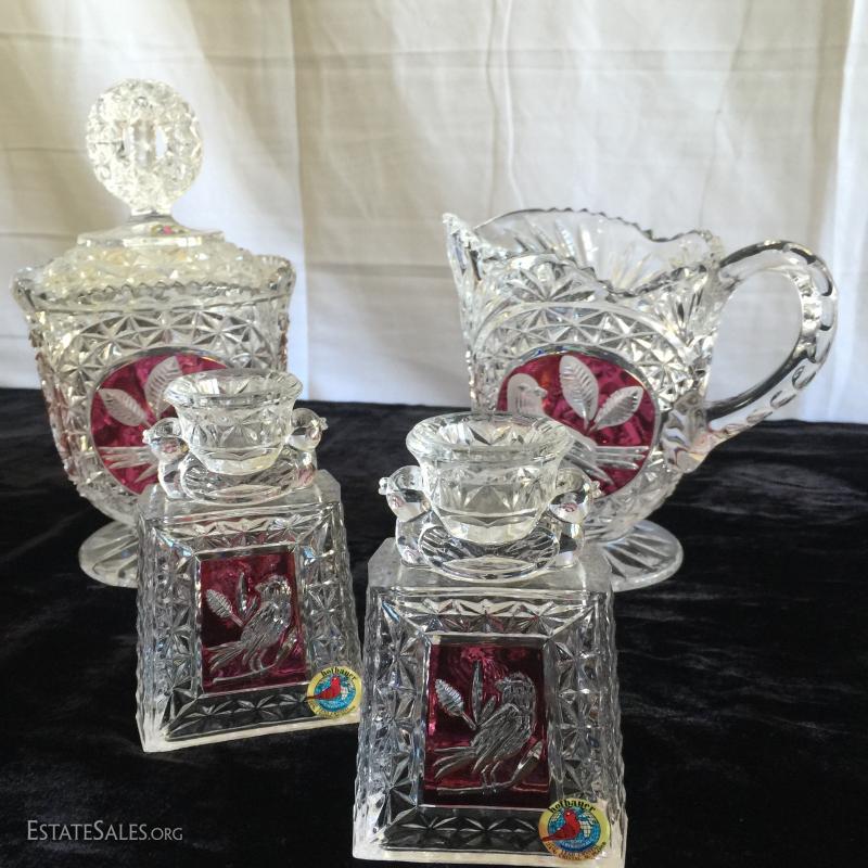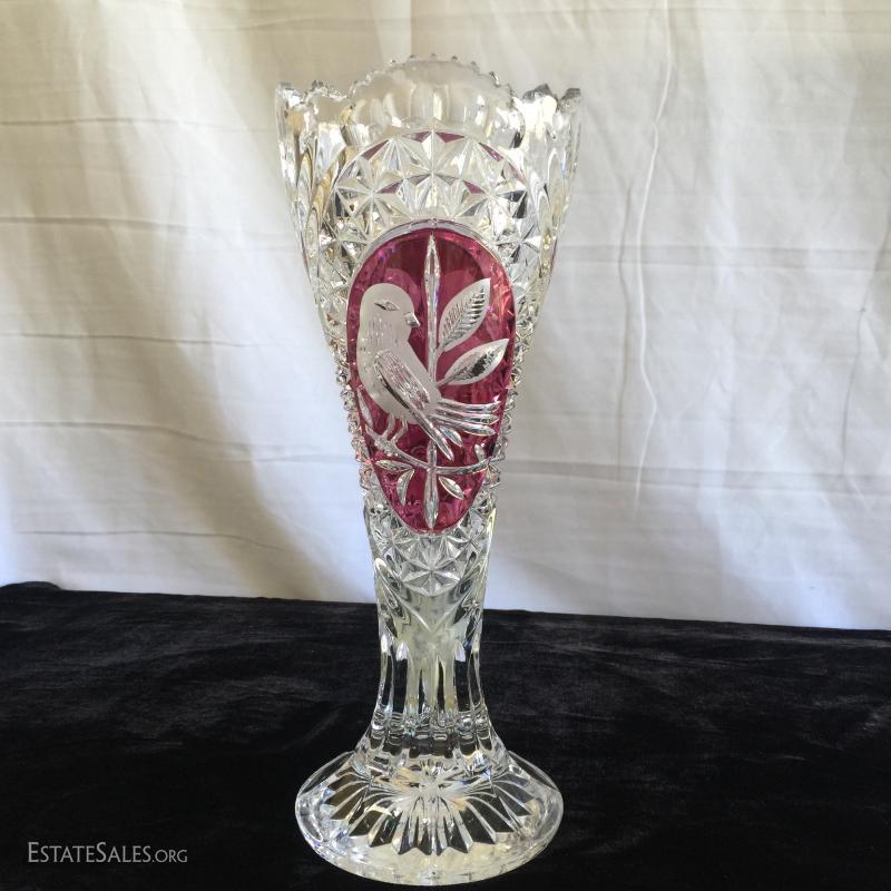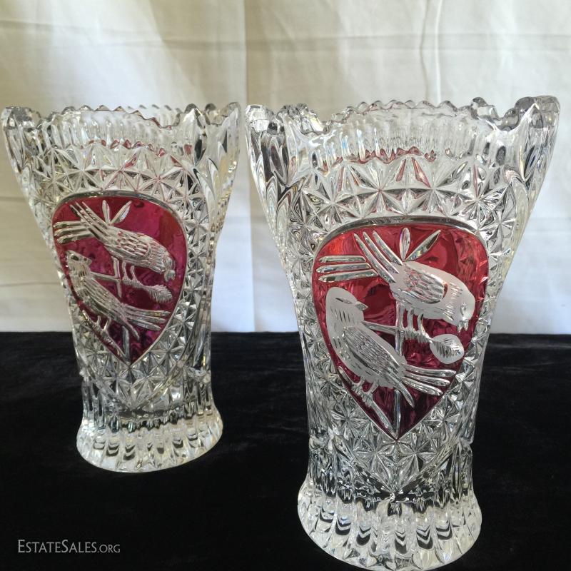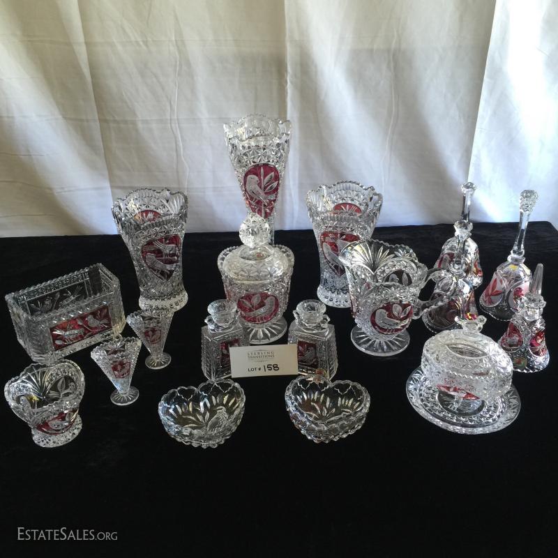 19 Pieces and 2 lids of red cut Hofbauer lead crystal. Sizes range from 2" - 12" H.