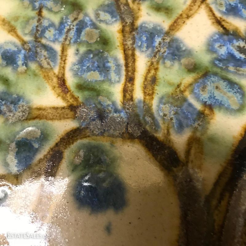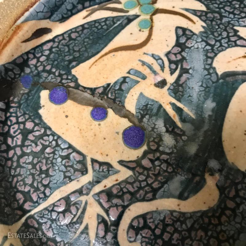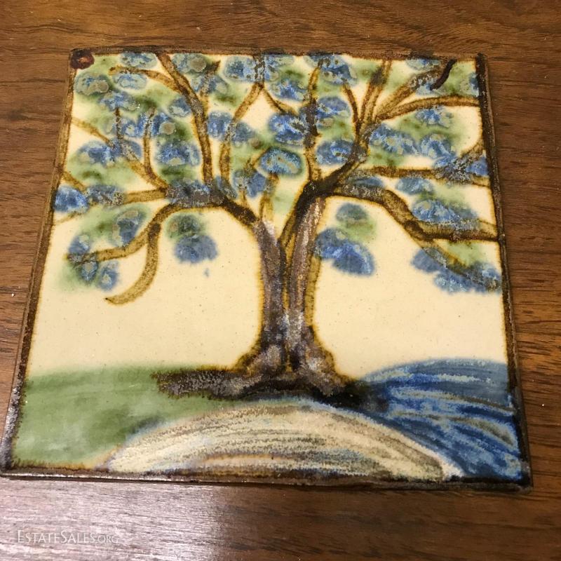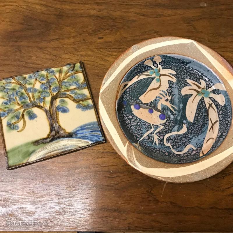 This lot includes a beautiful handmade and hand-painted plate (11” in diameter) and a decorative hand-painted tile (7” square). Cannot verify whether or not plate is food safe. And signatures and markings are illegible.
