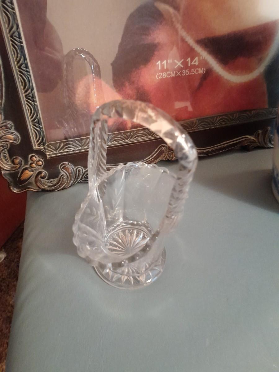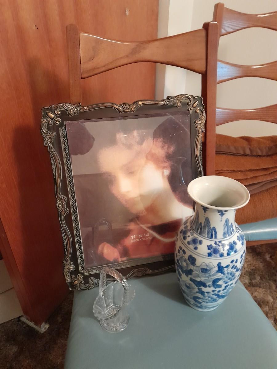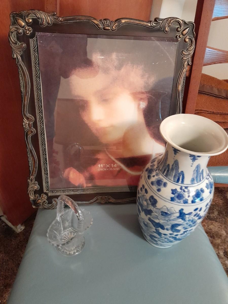 12" DECORATIVE VASE WITH A 11" X 14" PICTURE FRAME AND GLASS BASKET