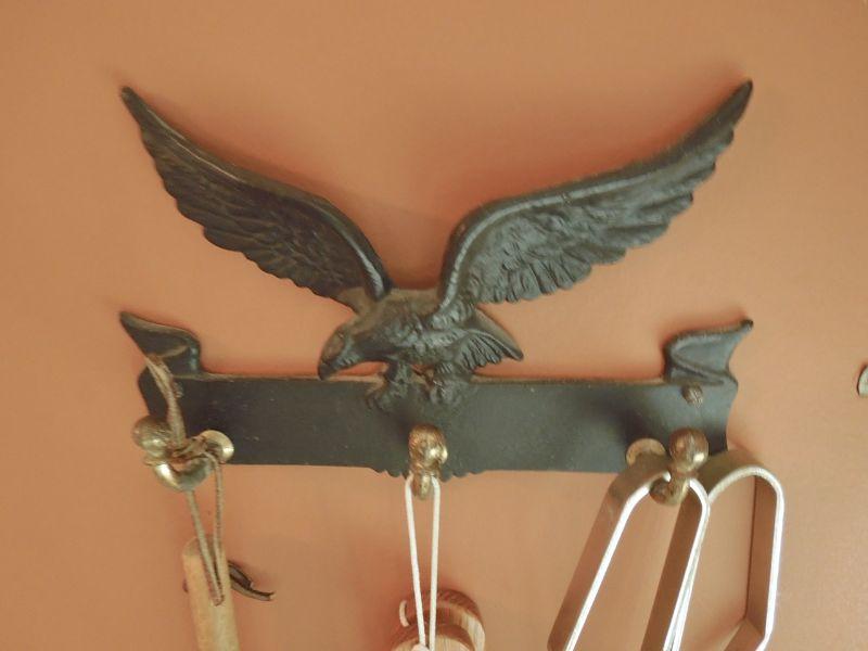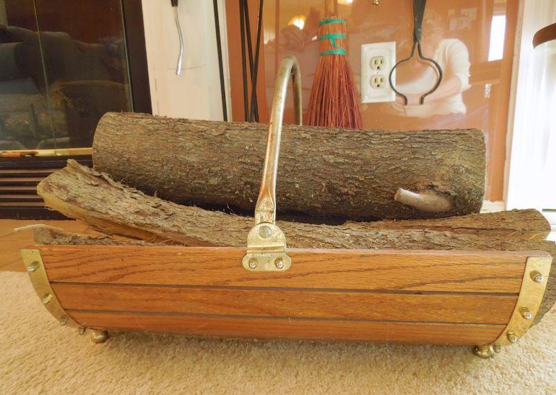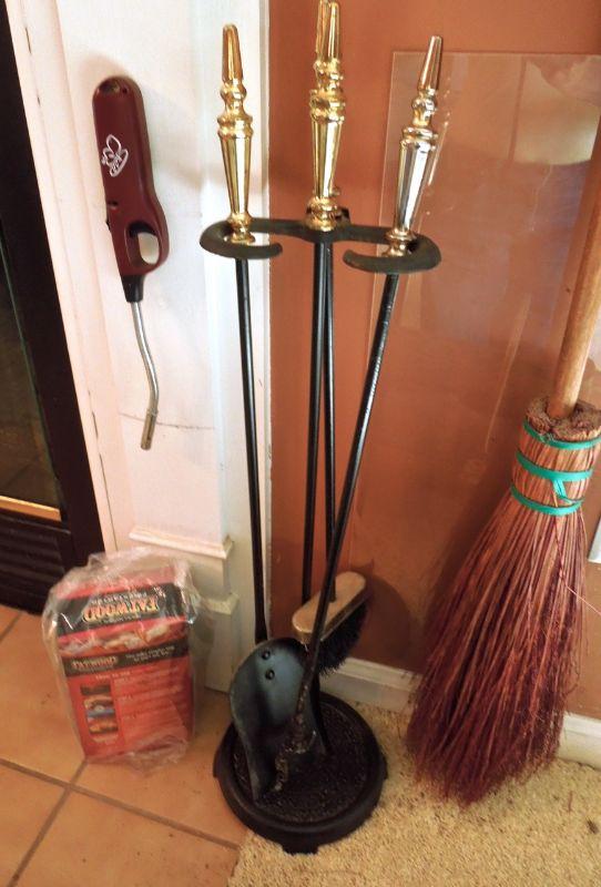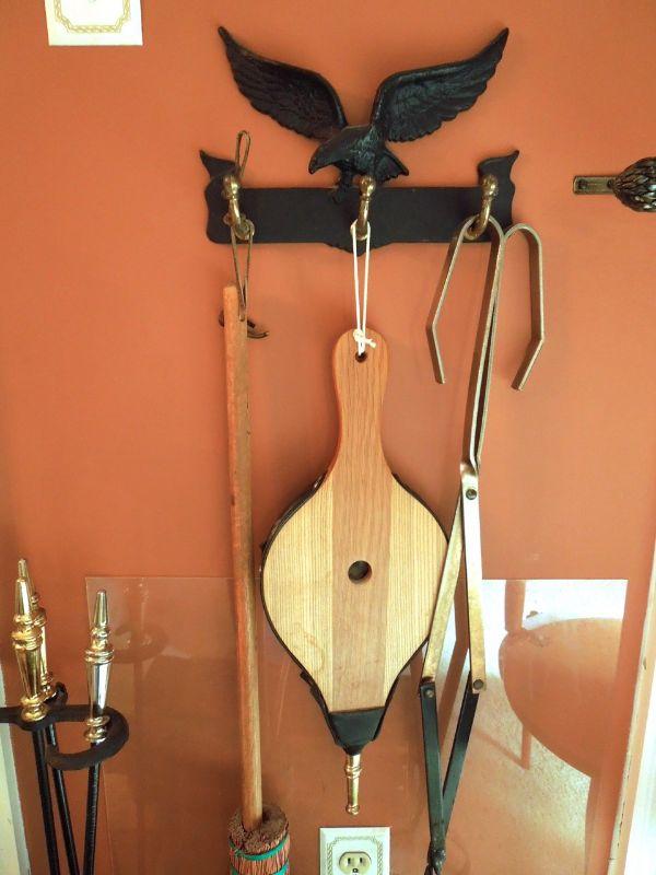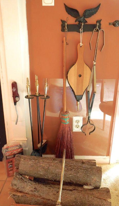 Wrought iron fireplace set with brass handles, a hand made fireplace broom, a wood forge bellows, a pair of log tongs, a box of fat wood; an American Eagle cast iron tool hanger and a brass and wood log carrier with logs.