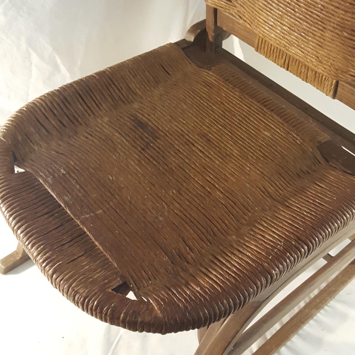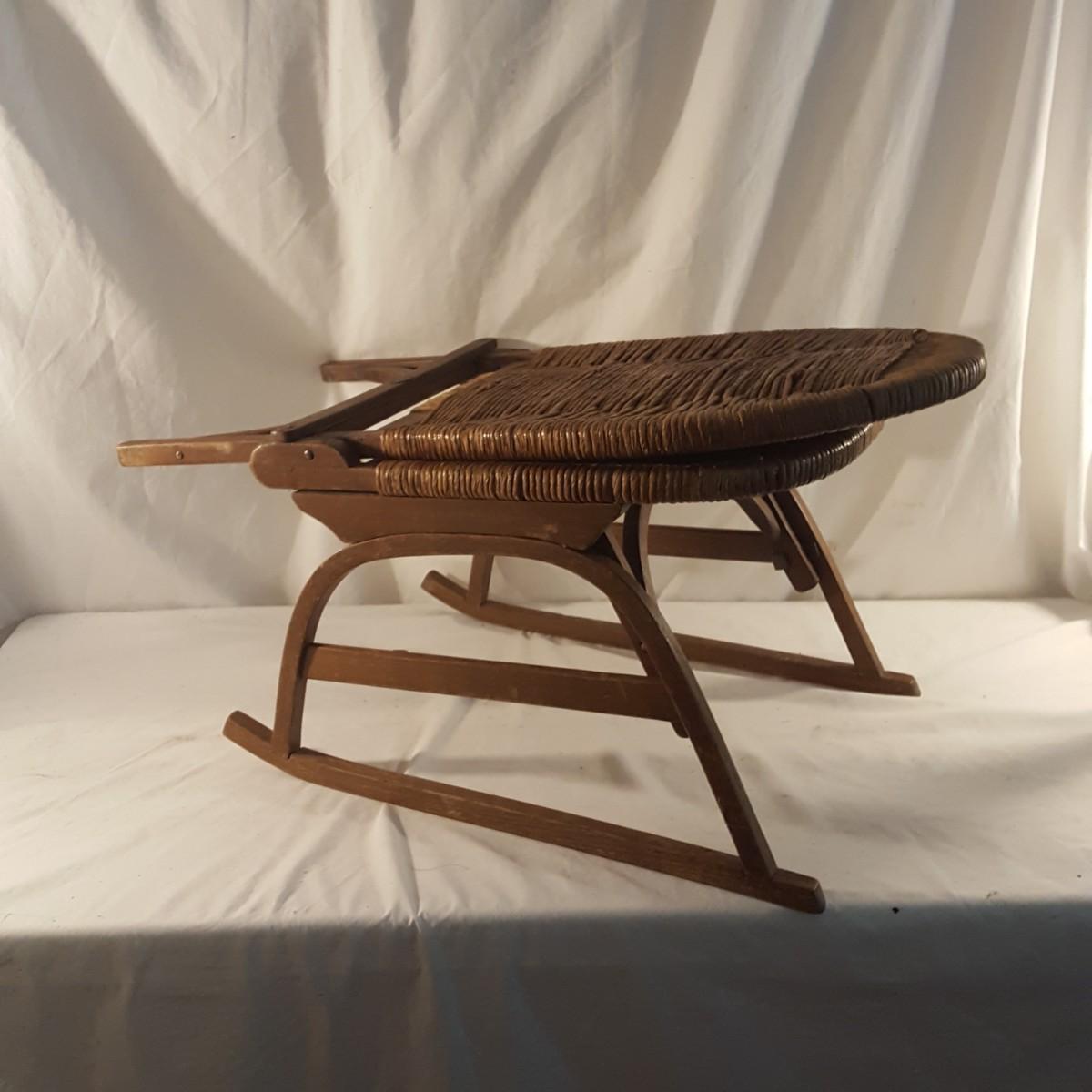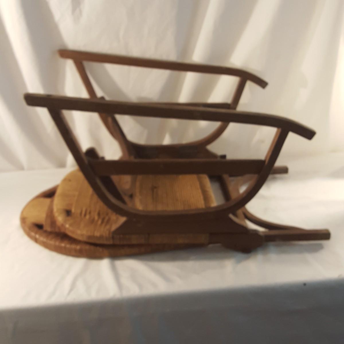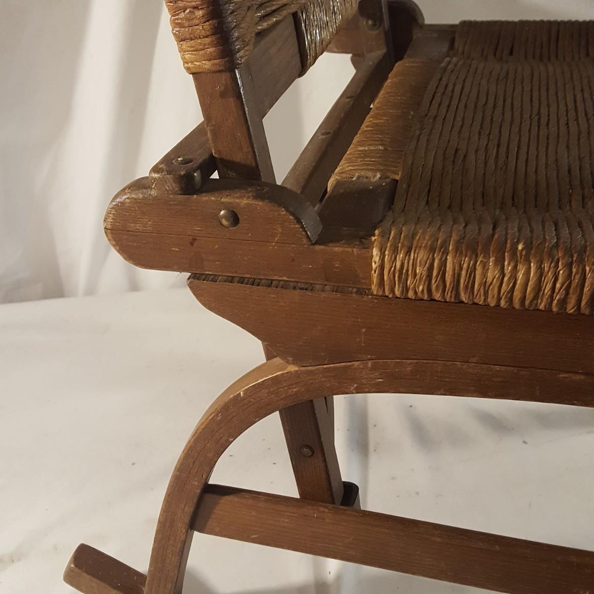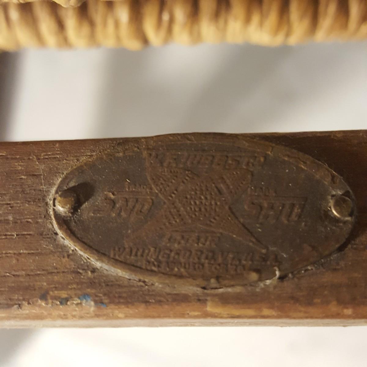 Such a unique piece of furniture! This antique rocker appears to be in good condition. The back folds down for easy movability. We were wondering if it was a "fishing chair?" You'll have to let us know! Made of wood and woven wicker. The rocker measures 32”x18”x13”. It appears to be child-sized due to its height. The metal label on the back reads: “W. F. Tubbs Co. Sno Shu Chair Wallingford, VT USA”. Shipping available. Please call UPS for quote prior to bidding. 828-252-6930