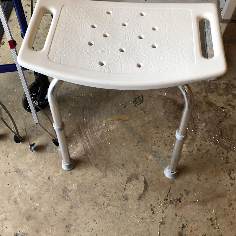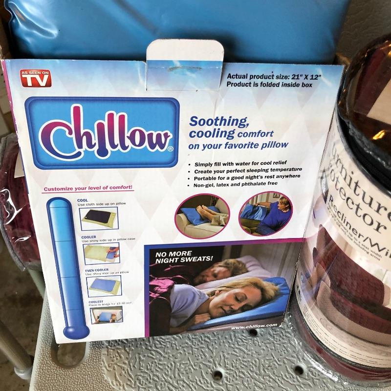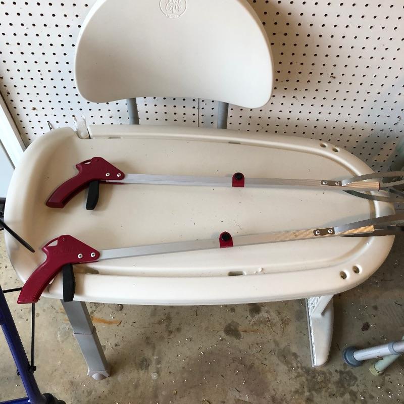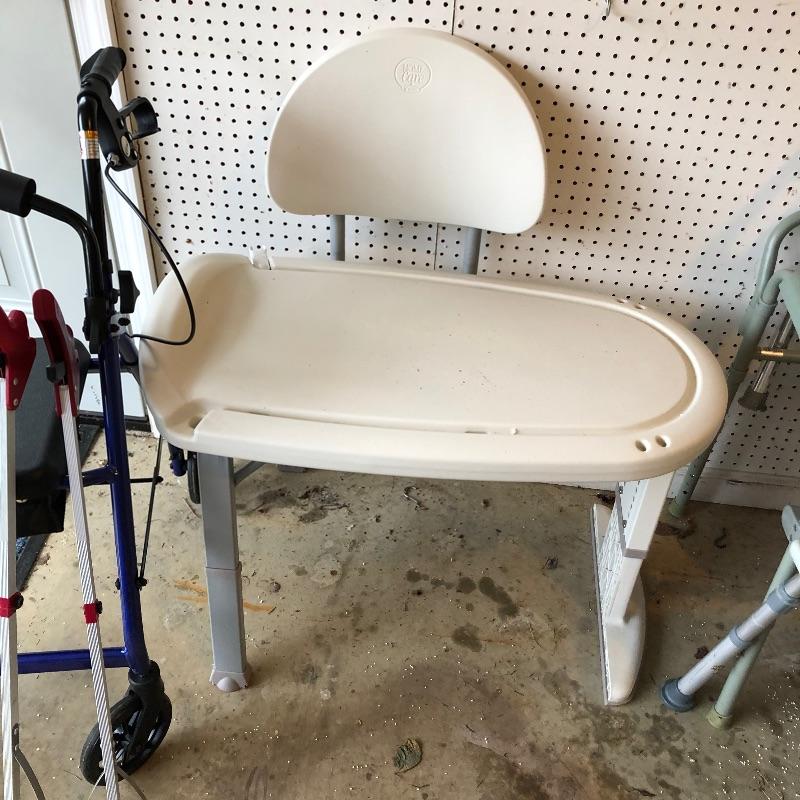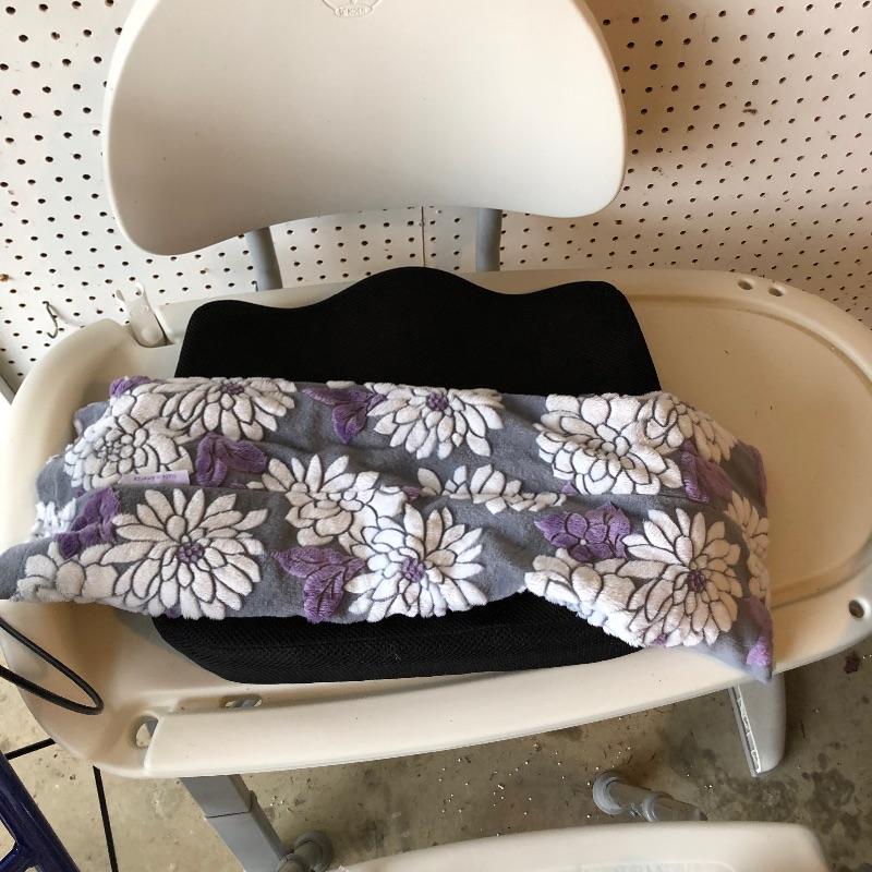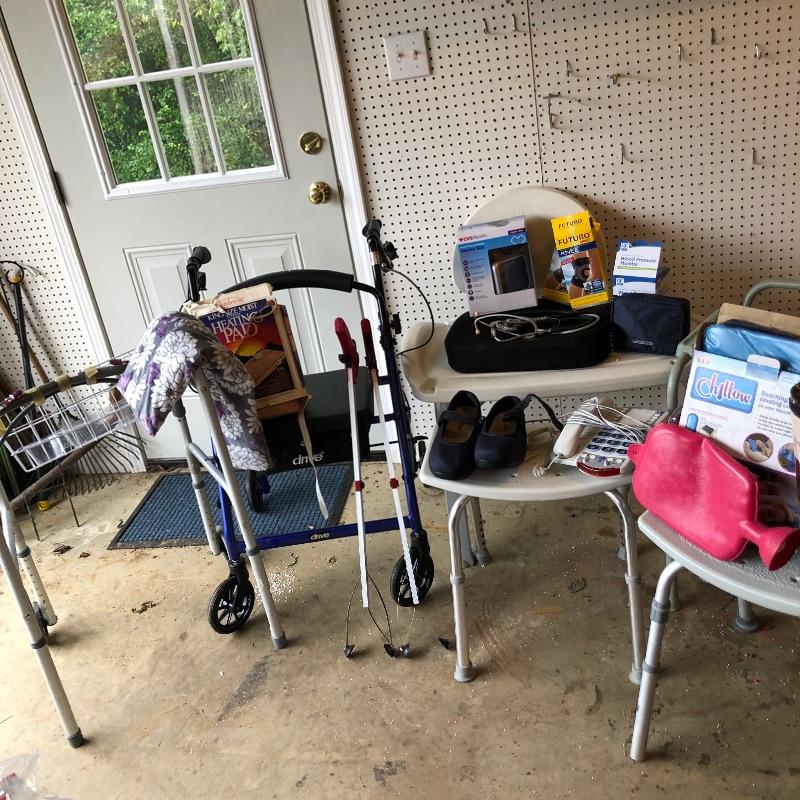 This large lot of health and medical aids contains so much, it’s easiest if you look at our images, but to name a few of the items, there are two walkers, two shower chairs and a stool, two Gopher reaching tools, pair of Ortho Feet shoes size 9.5 and much more. The floral pillow is a microwaveable heating pad, probably filled with rice or the like.