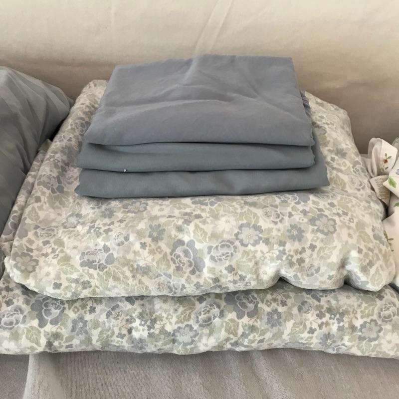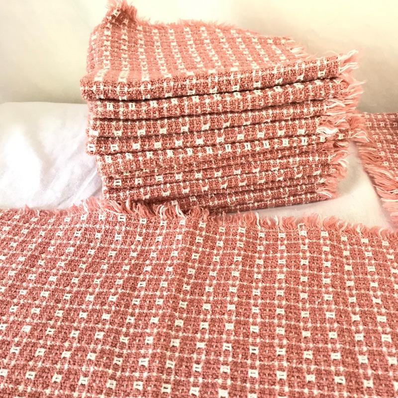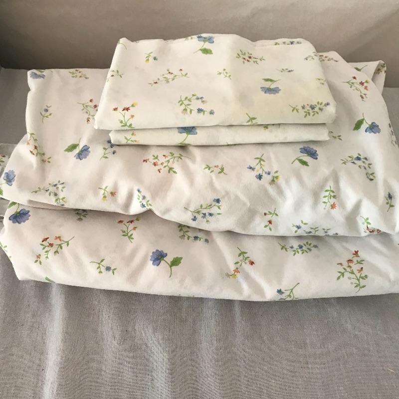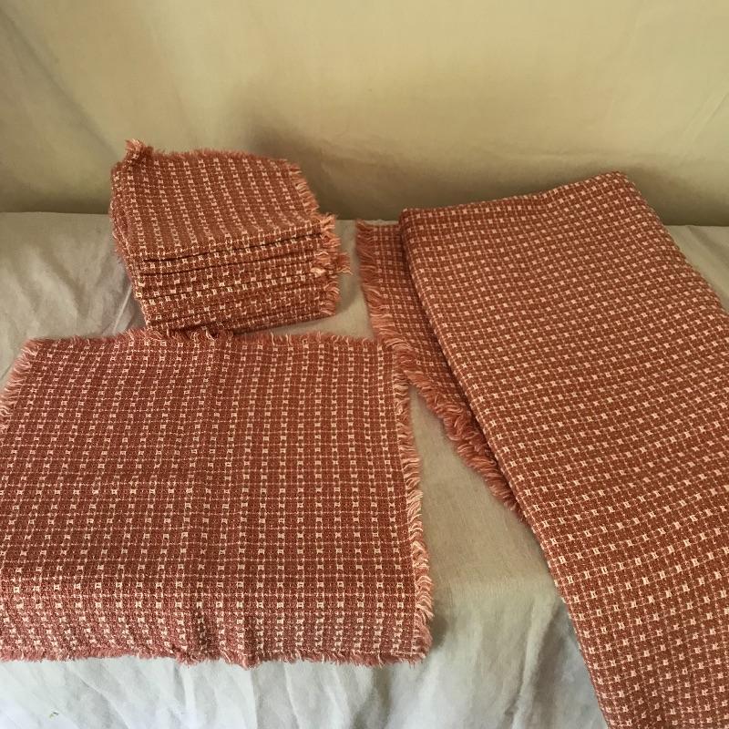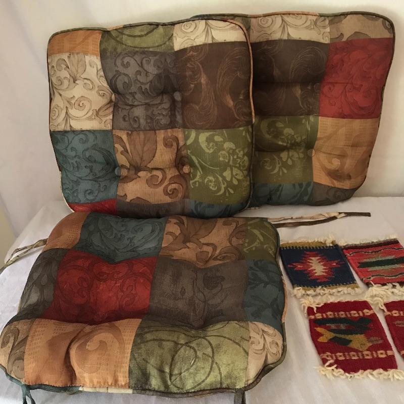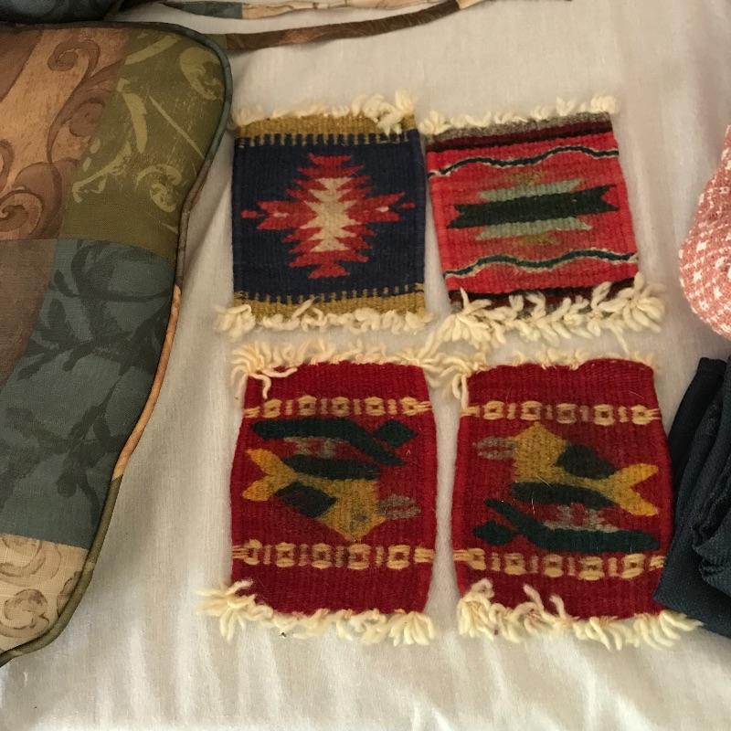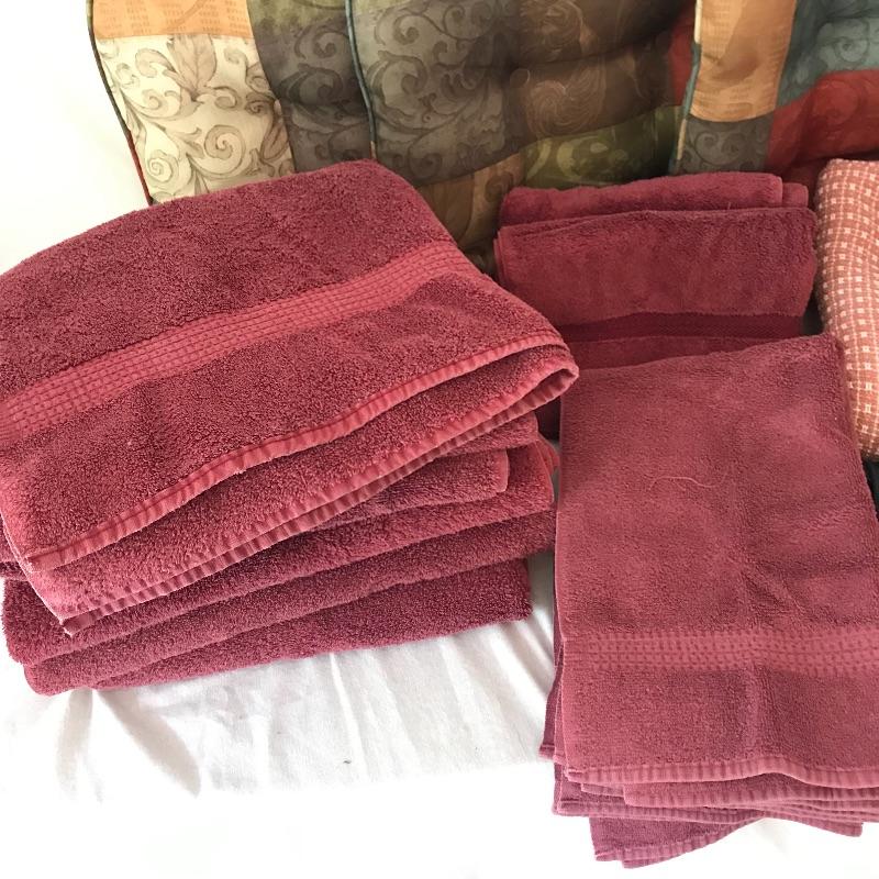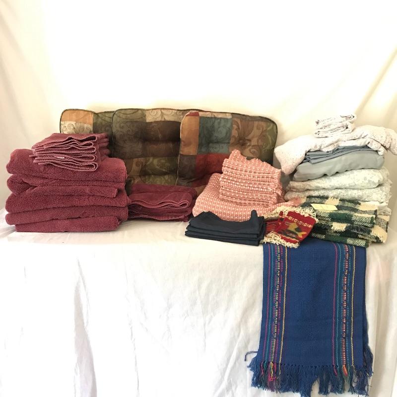 Here is a nice selection of necessary and decorative linens. Five standard sized bath towels with six hand towels, four of which are from the same line of towels. Four thick woven coasters and three colorful chair tie cushions. Four midnight blue dining napkins and eight plaid woven placemats. Twelve pink thick napkins with a large oval tablecloth measuring approximately 92” x 52”. Lot also contains some Better Home and Garden and Martha Stewart Everyday Full sheets and pillow cases. Lastly, a brightly colored 5’ table runner. See photos for everything that is included.