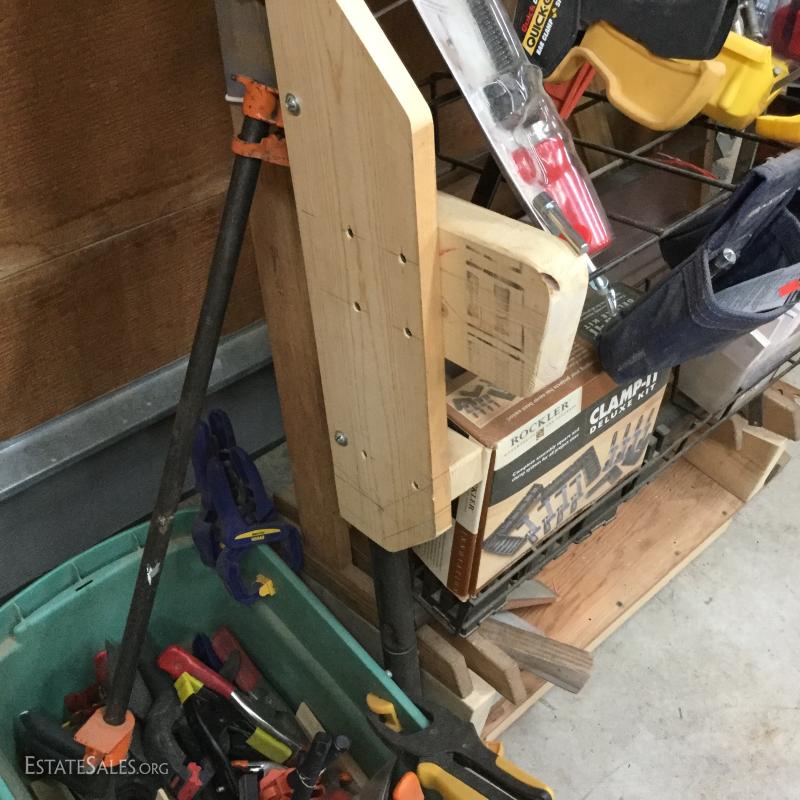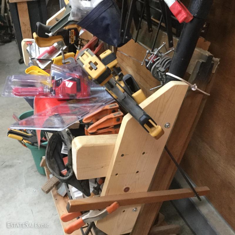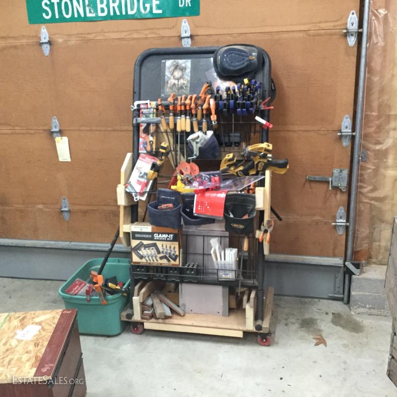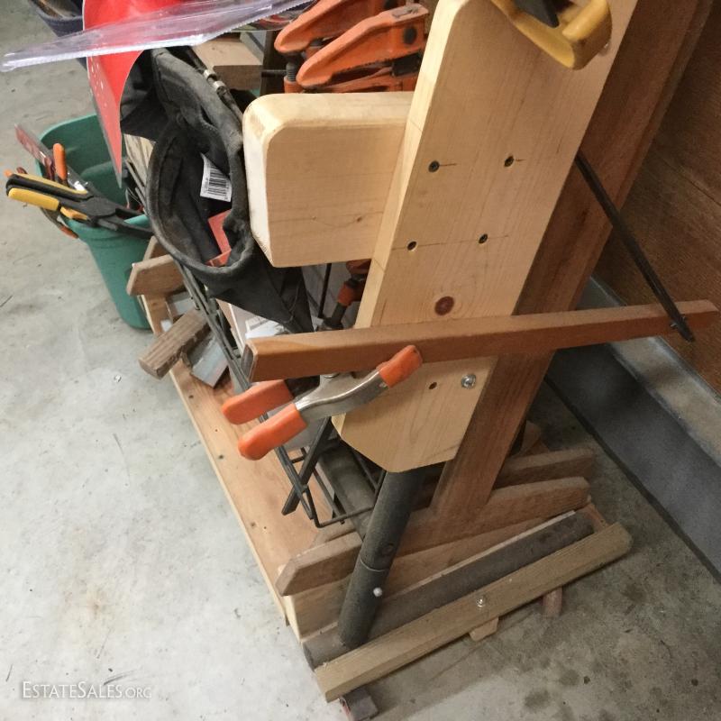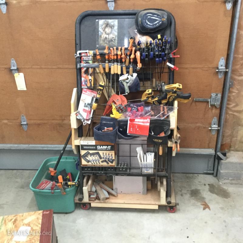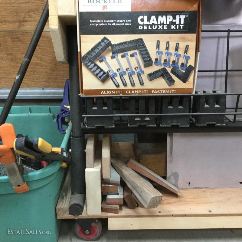 This large lot of all sizes of clamps made of plastic, metal and wood also has a great rolling storage cart. If it needs clamping, you've got options! Cart is 81" tall and 34" wide. This lot is available for local pick up in Hendersonville, NC only.