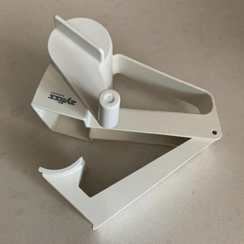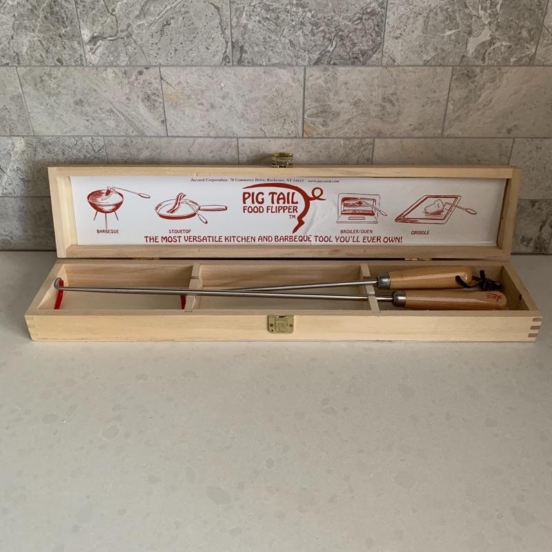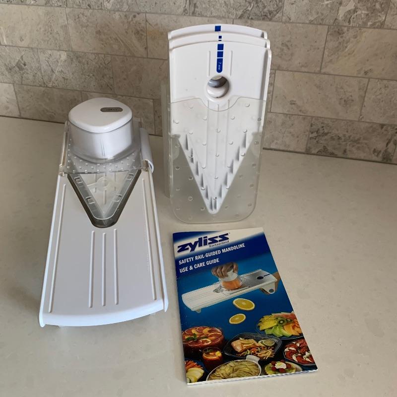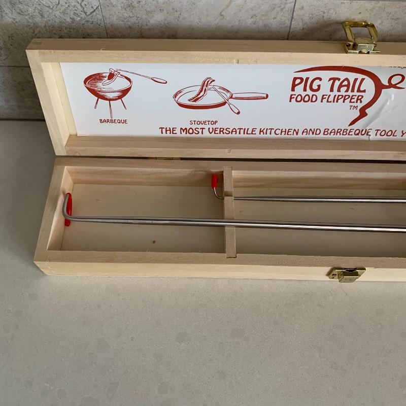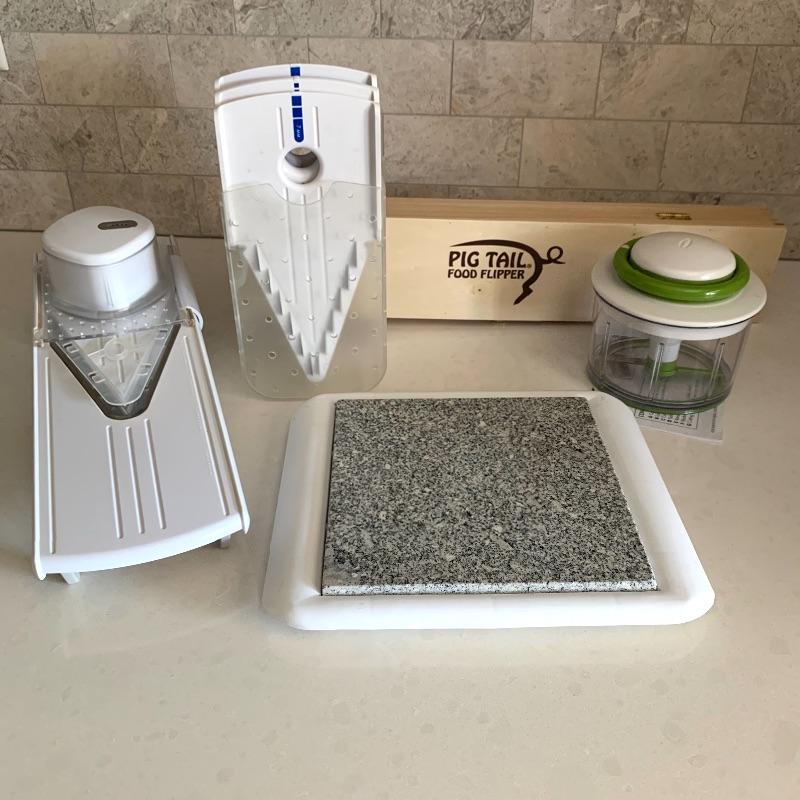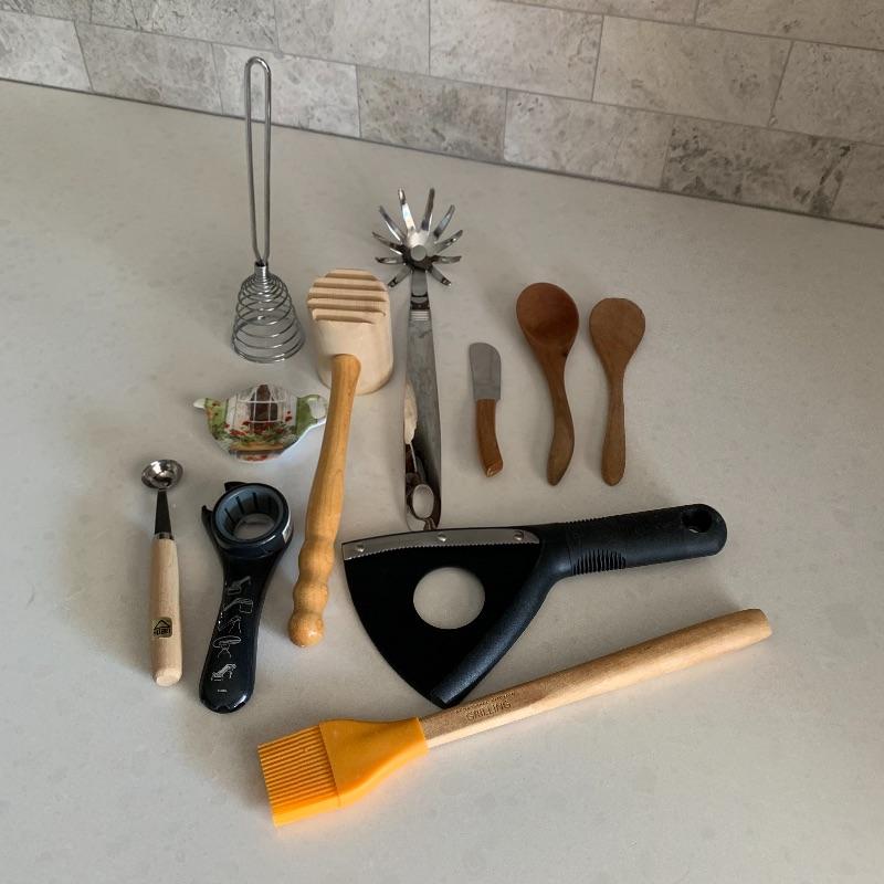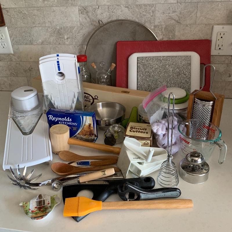Many kitchen accessories are included in this lot. There is a Zyliss Safety Rail-Guided Mandoline, a VeggiChop, and a Pig Tail Food Flipper. There is also a Rocky Wave hot pad, a cutting board, measuring cups, a cheese grater, a sauce jar, corn on the cob holders, biscuit cutters, and more! Local pickup only.