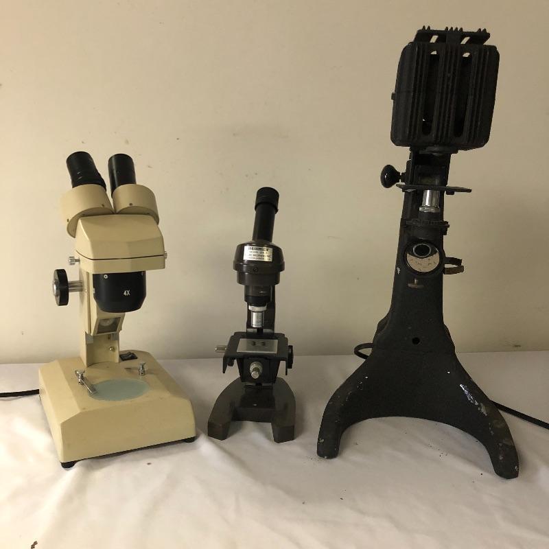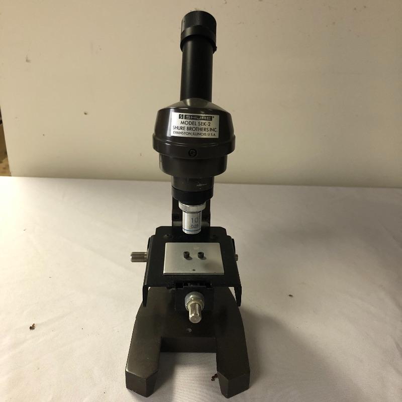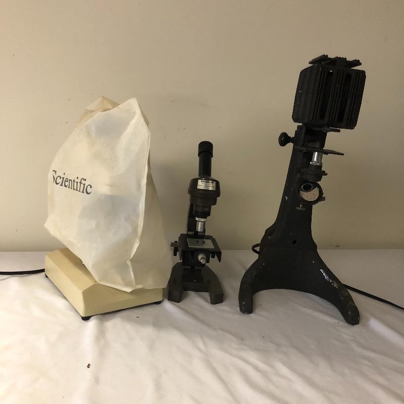 You will see things more clearly with these three microscopes. Lot includes The Triple-X Scope projector microscope, LW Scientific microscope and Shure Modrl SEK - 2 microscope. Triple -X scope measures 9” x 10” x 19.5”.