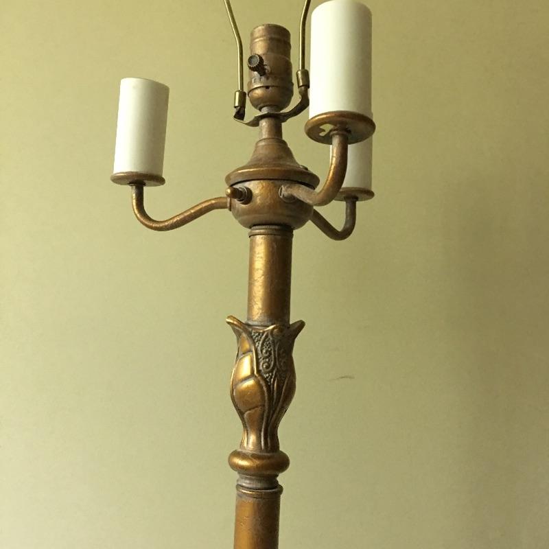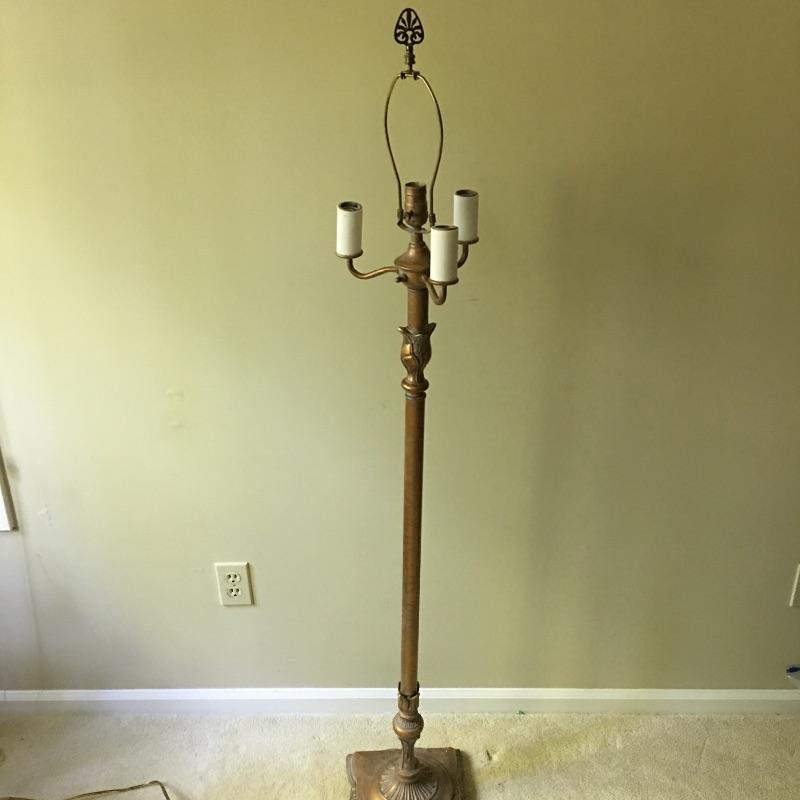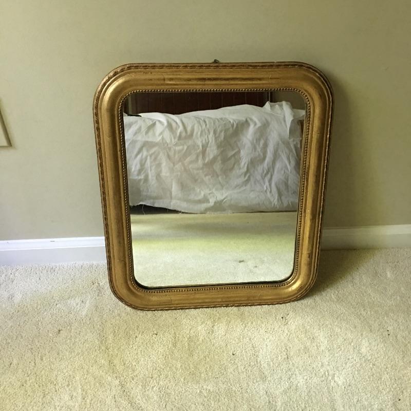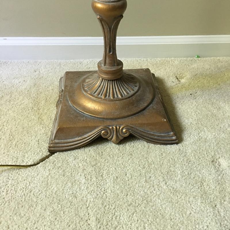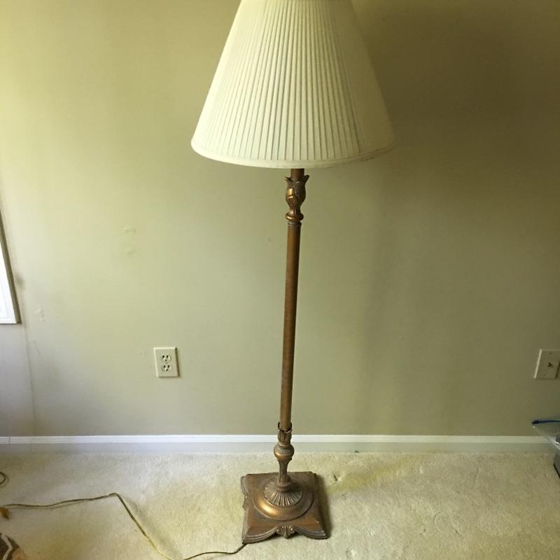 Mirror and floor lamp. Beautiful mirror with gold painted wooden frame and a gold finish metal floor lamp. Pictures don’t do this pair justice. Lamp shade has some wear on inside - see pictures. Lamp measures 60” tall with a 9.75” x 9.75” base and mirror measures 17” x 20”.
