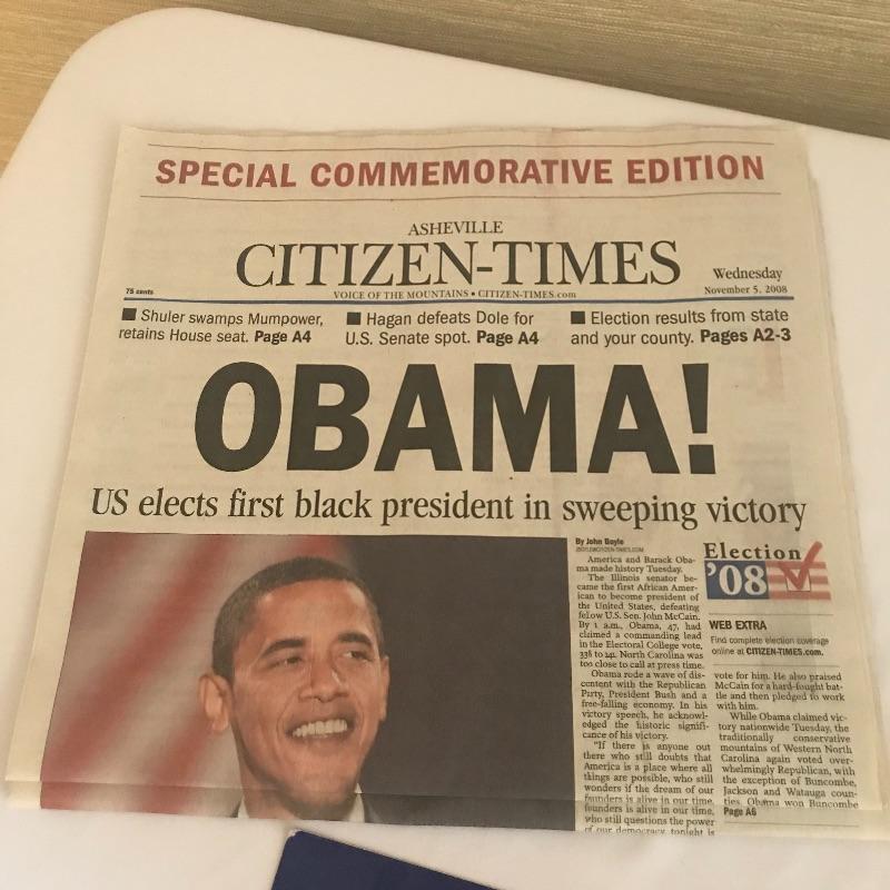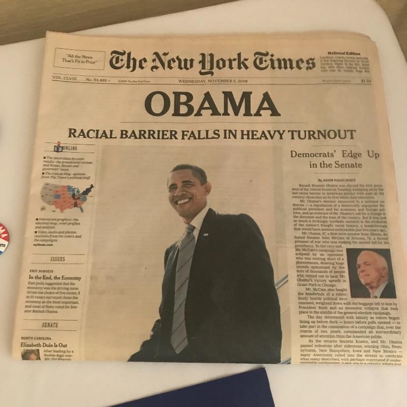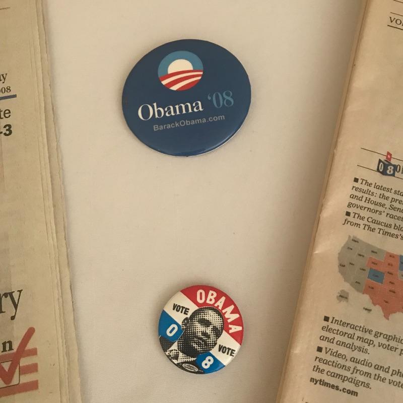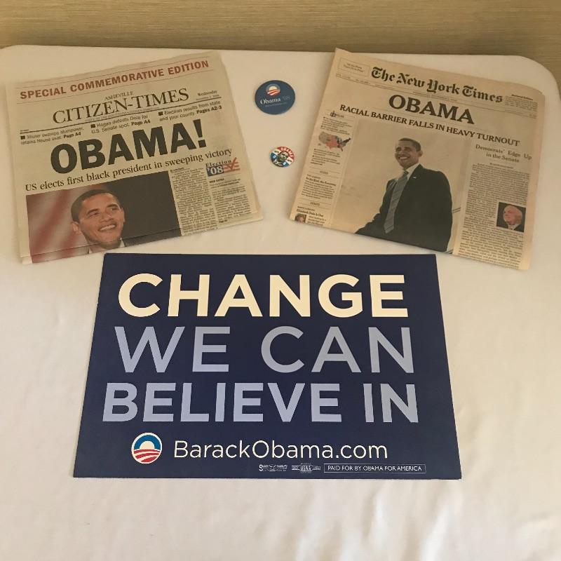 Poster, buttons and newspapers from 2008 presidential election of President Obama. Shipping available.