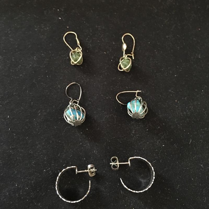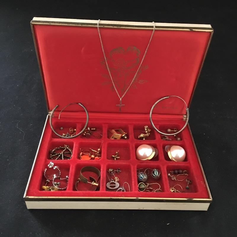 Jazz up for looks, just in time to start seeing friends again! Lot includes plenty of pierced earrings in a variety of sizes, shapes, materials and colors. Also includes necklace with cross marked sterling and box that measures 4.75” x 7” x 1.5”. You can never have too much jewelry.