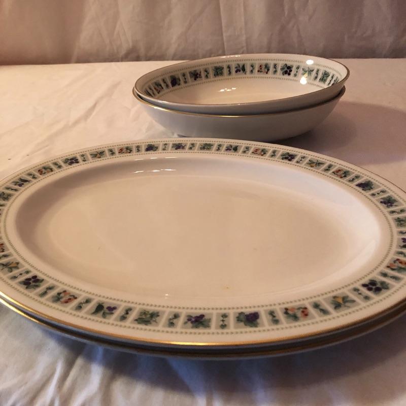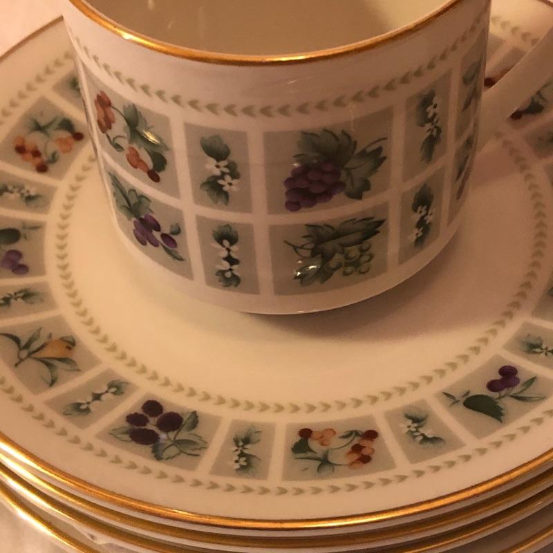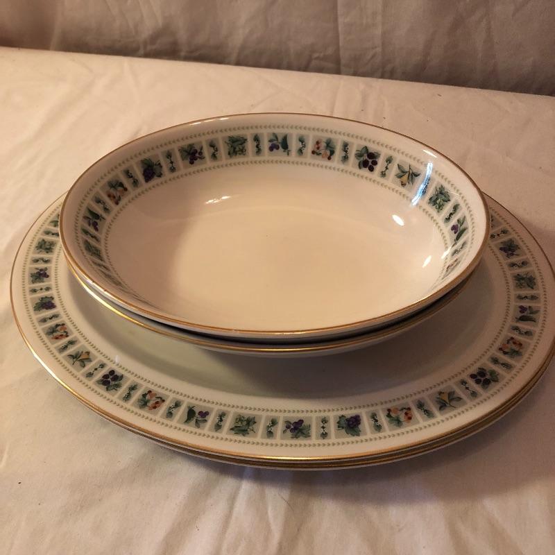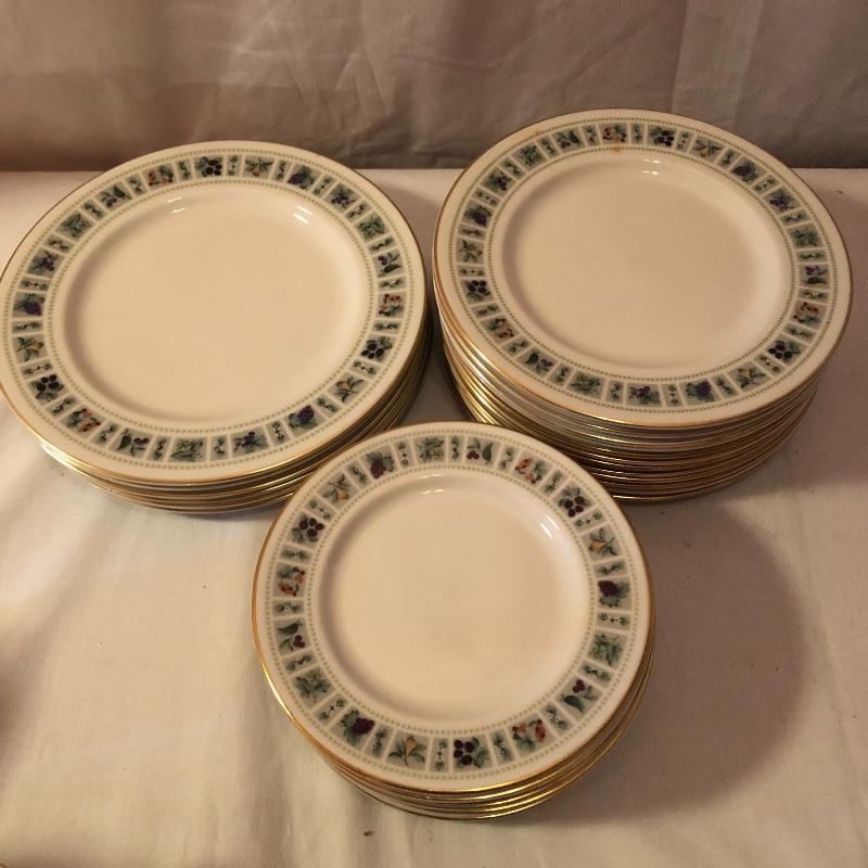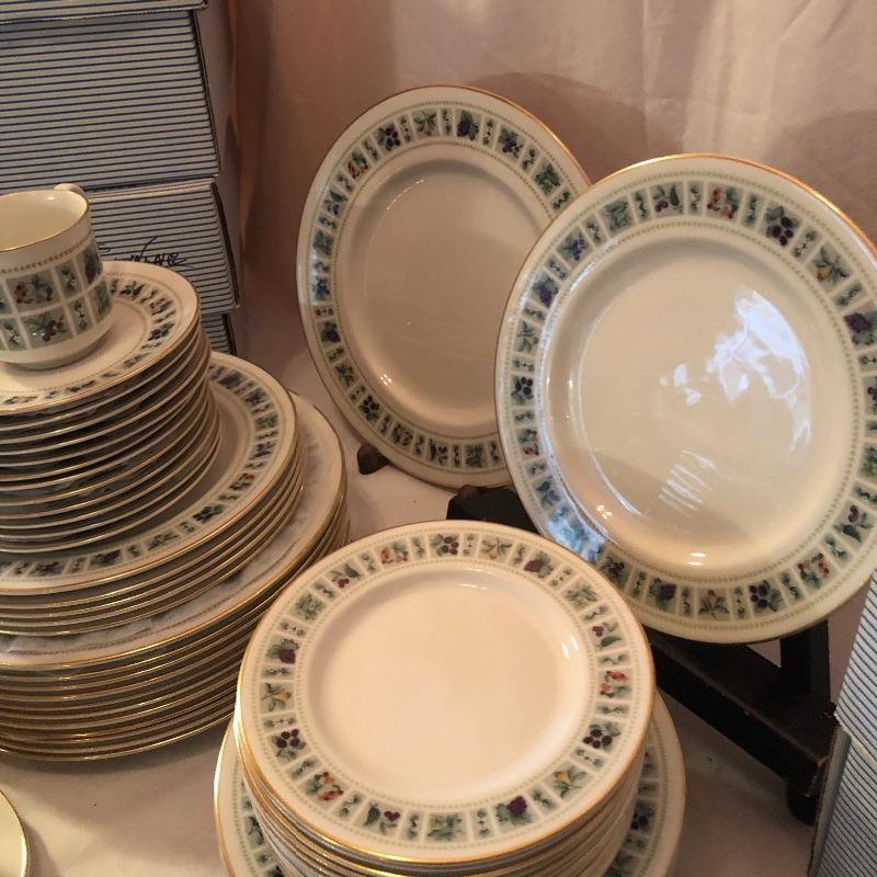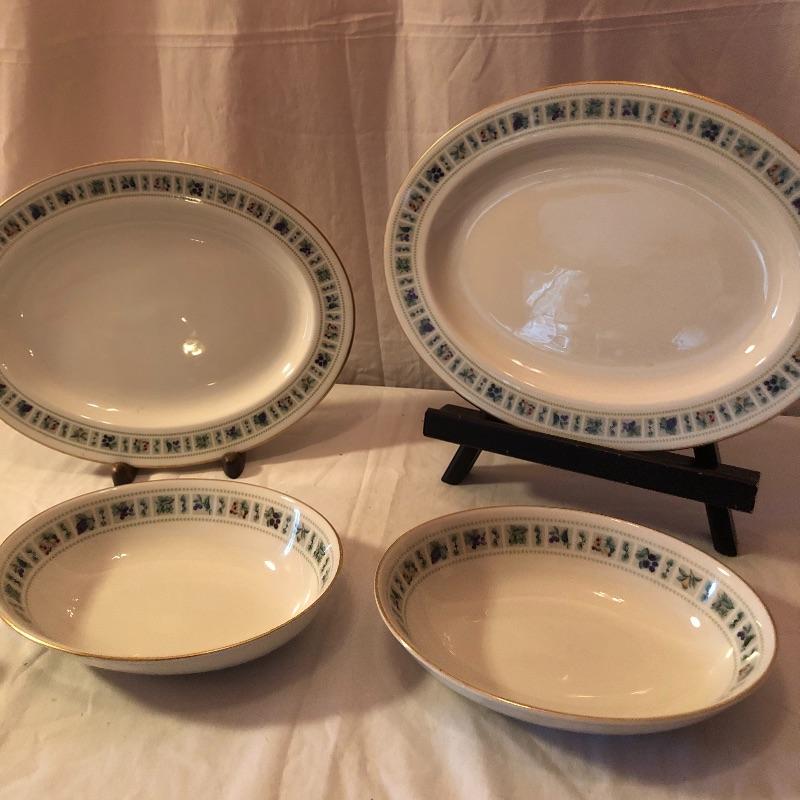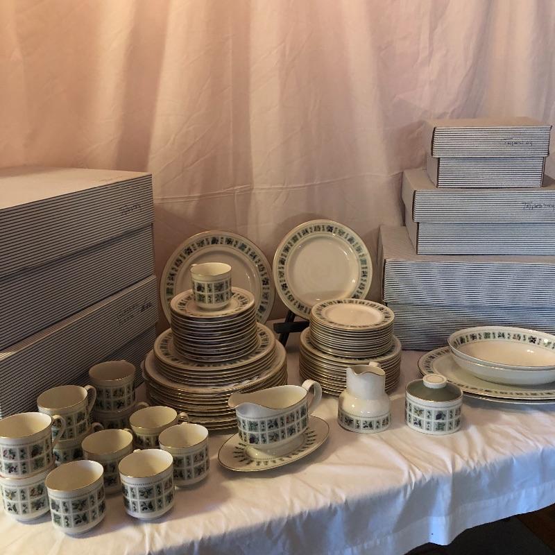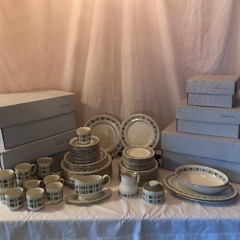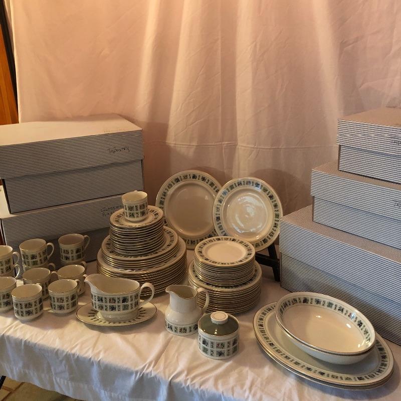 This beautiful set includes twelve dinner plates, six smaller dinner plates, twelve salad plates and thirteen bread plates. There are twelve saucers with twelve cups. The set also includes a sugar and creamer set, gravy boat, two serving bowls and two serving platters. Shipping Available.