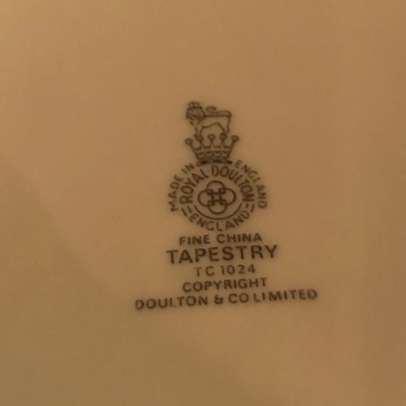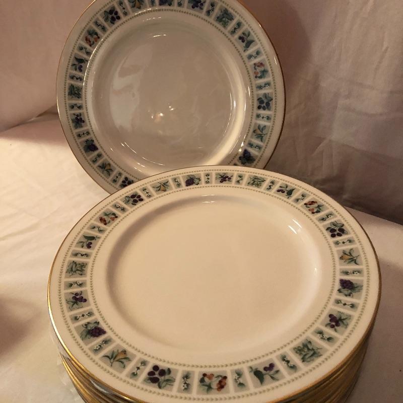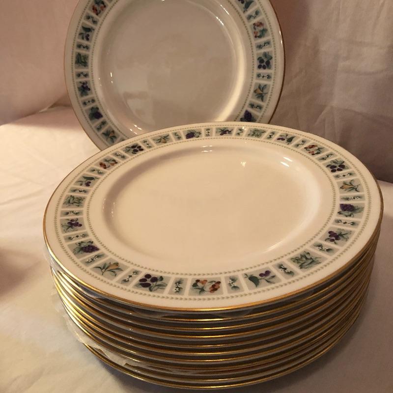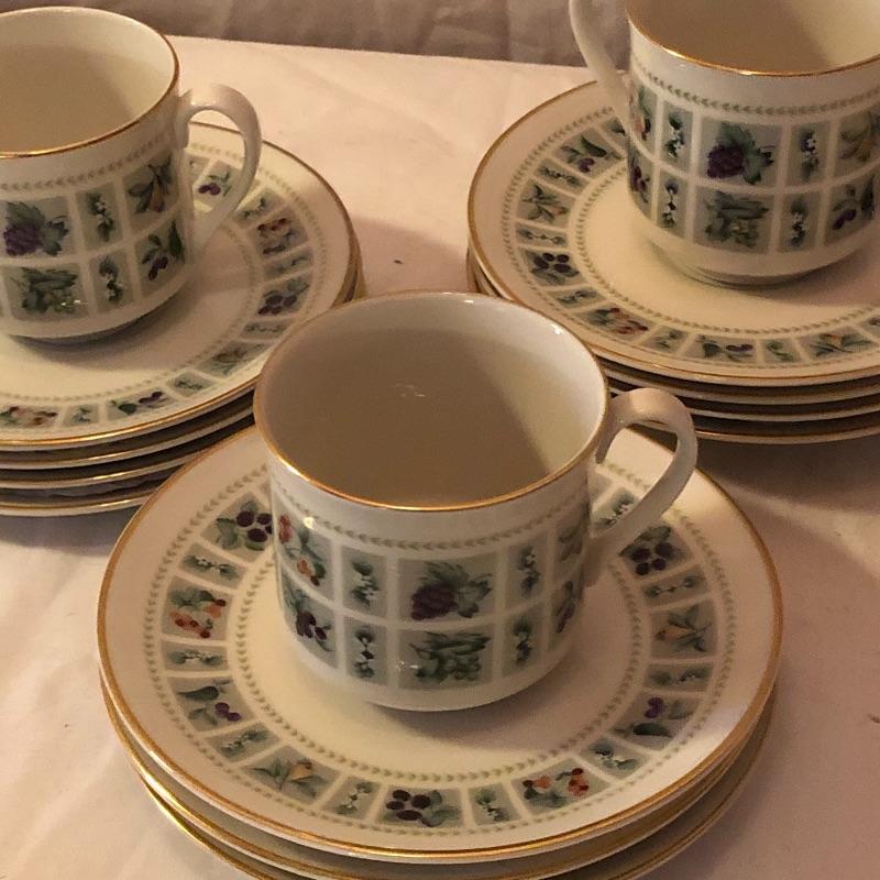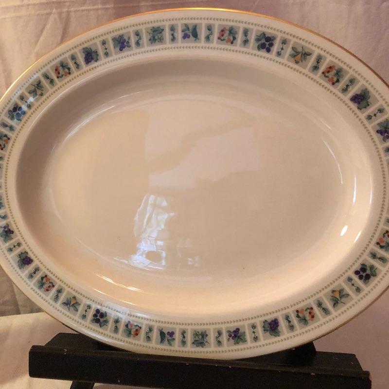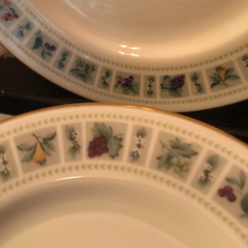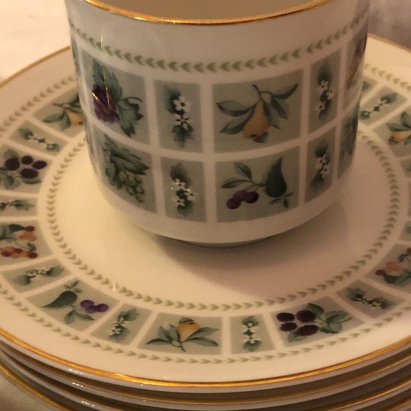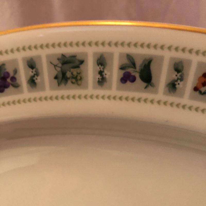 This beautiful set includes twelve dinner plates, six smaller dinner plates, twelve salad plates and thirteen bread plates. There are twelve saucers with twelve cups. The set also includes a sugar and creamer set, gravy boat, two serving bowls and two serving platters. Shipping Available.