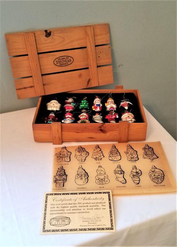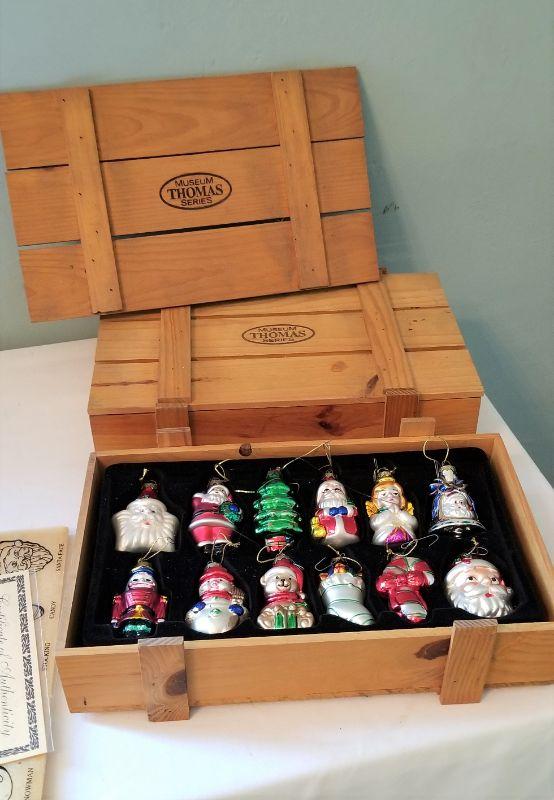You are getting TWO identical crates of Thomas Paccione antique-style Christmas ornaments - 24 in all. Complete. Circa 2000.