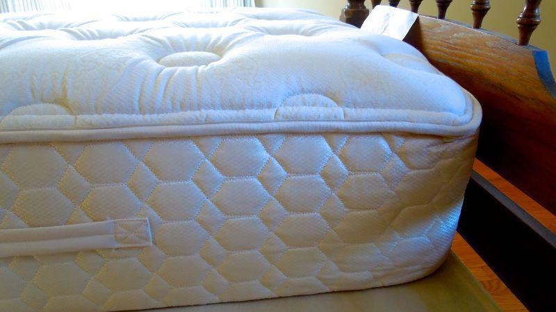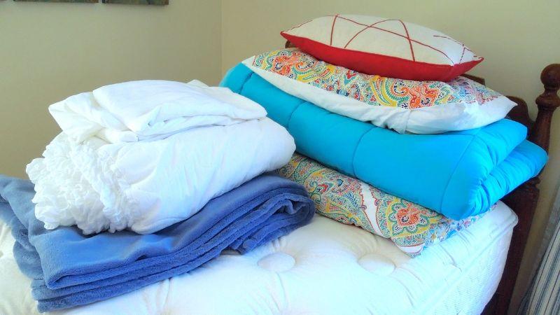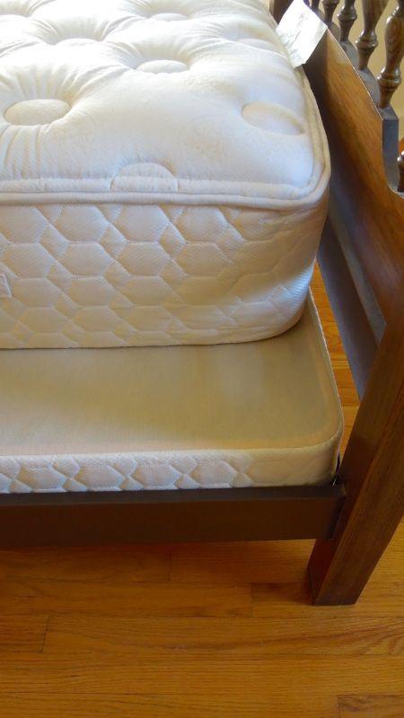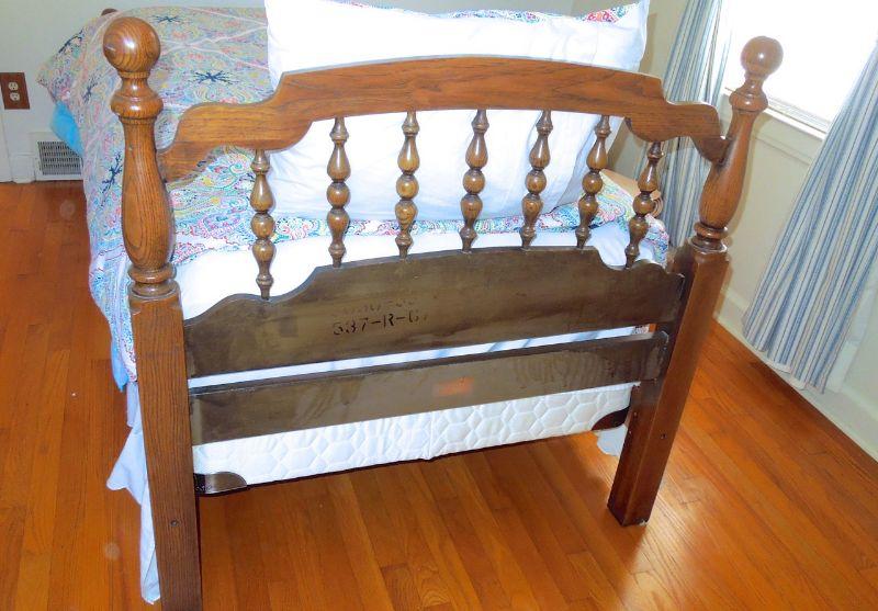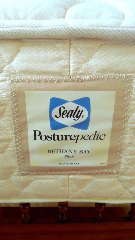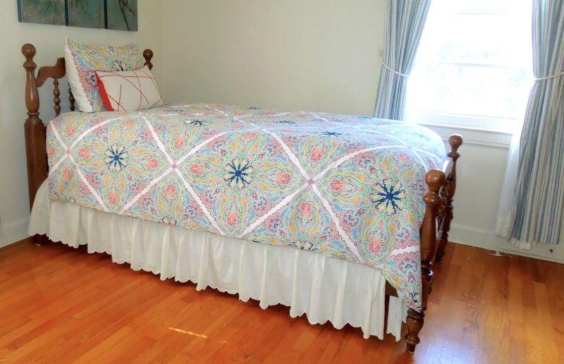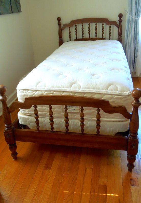 Very nice wood frame twin bed with super clean Sealy Posturepedic pillowtop mattress and springs. Add to that the duvet covered down comforter and matching pillow sham; a pillow; coordinating lined curtains; a small red accent pillow; a blue fleece blanket. a poly comforter; a complete twin set of microfiber white sheets; a dust ruffle and a very clean mattress protector.