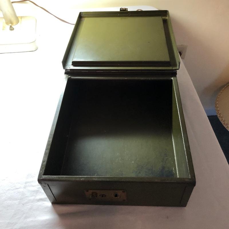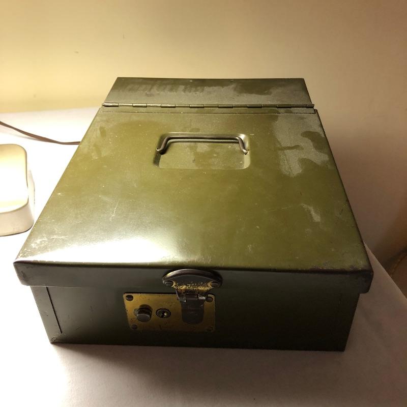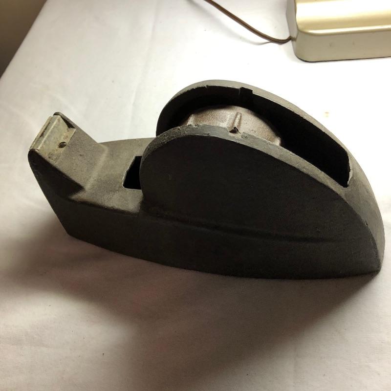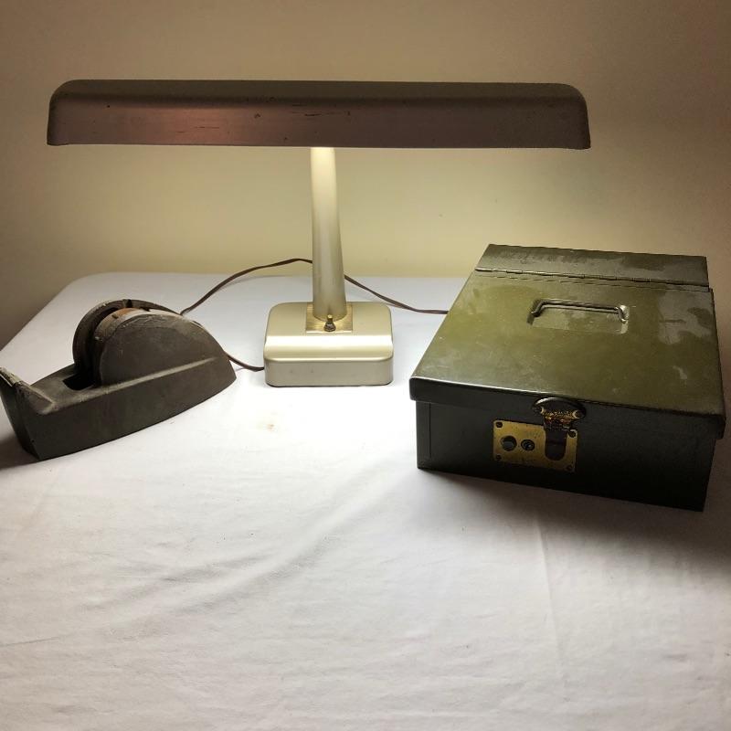 We have three equally awesome vintage items in this lot starting with what has to be the heaviest tape dispenser we have ever come across, this thing must weigh over 7 pounds! The desk lamp is grey and works great. Lastly we have a super heavy metal box that measures 9.5” x 13.5” x 3.75.