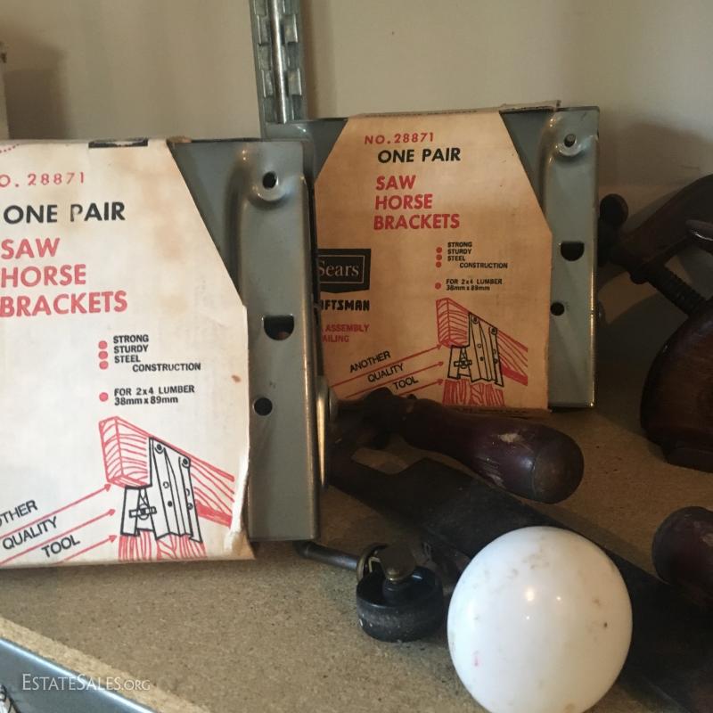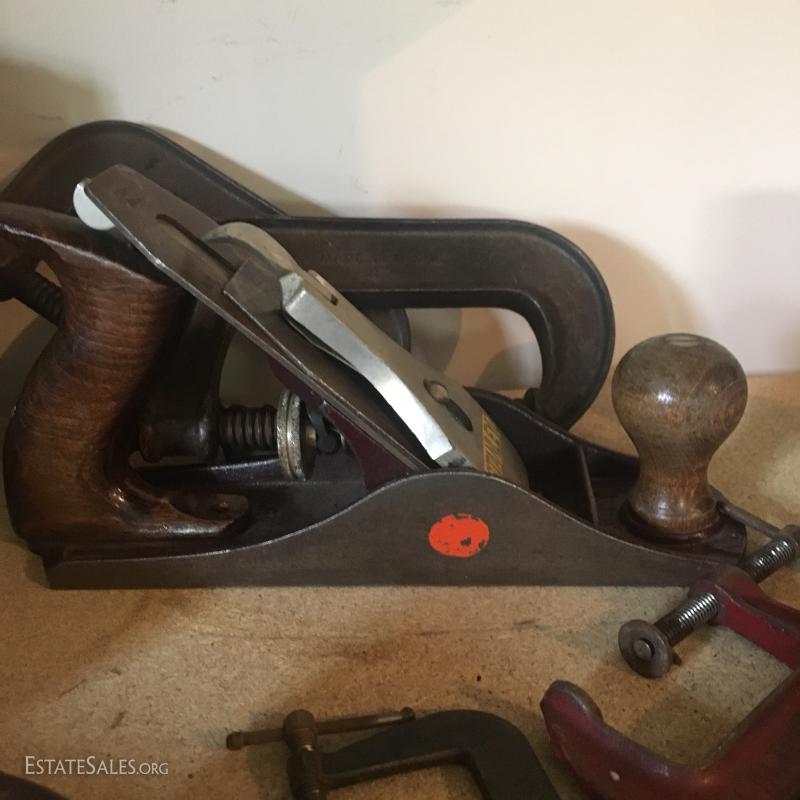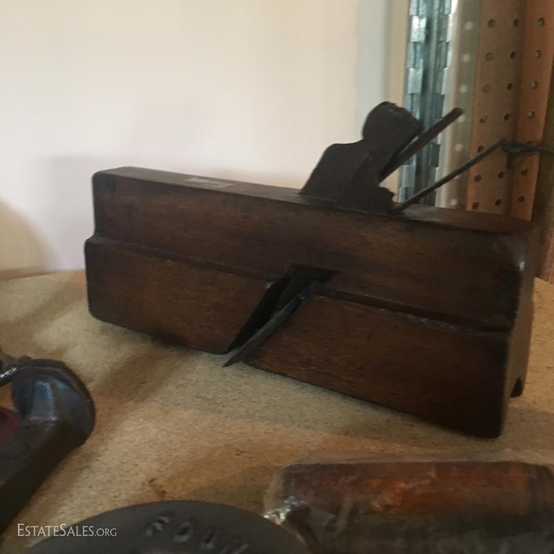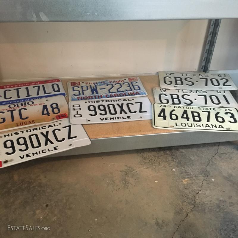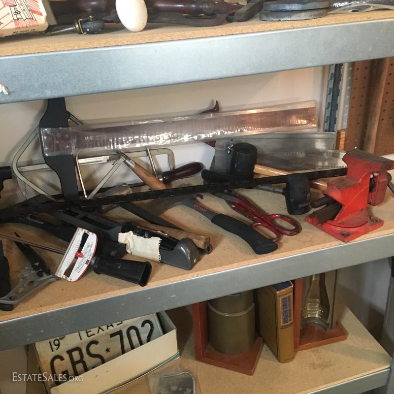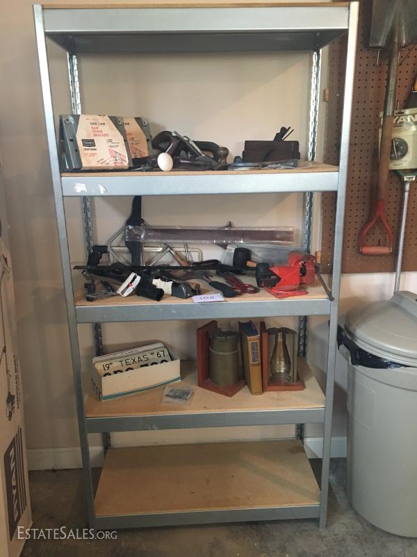 Large lot of vintage tools, vintage car license plate and even the shelf.