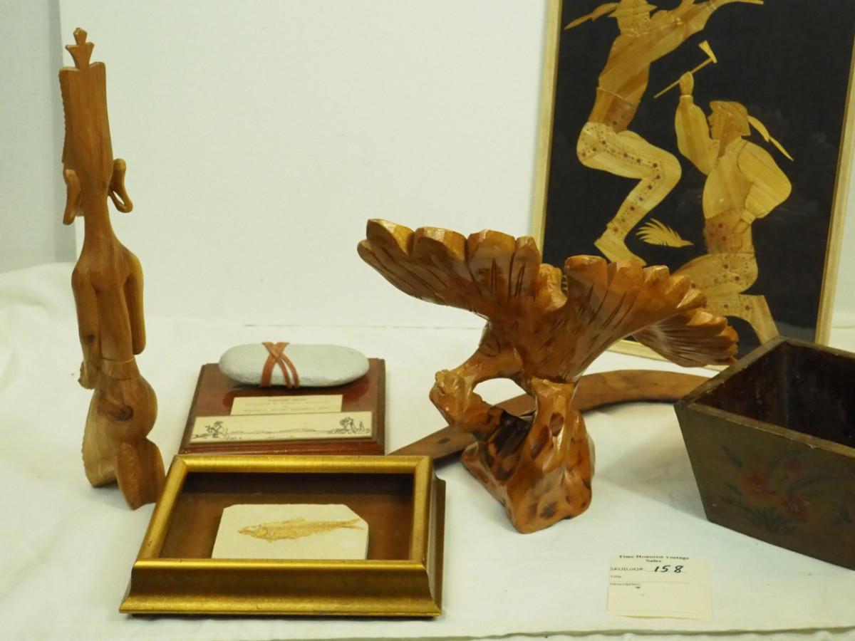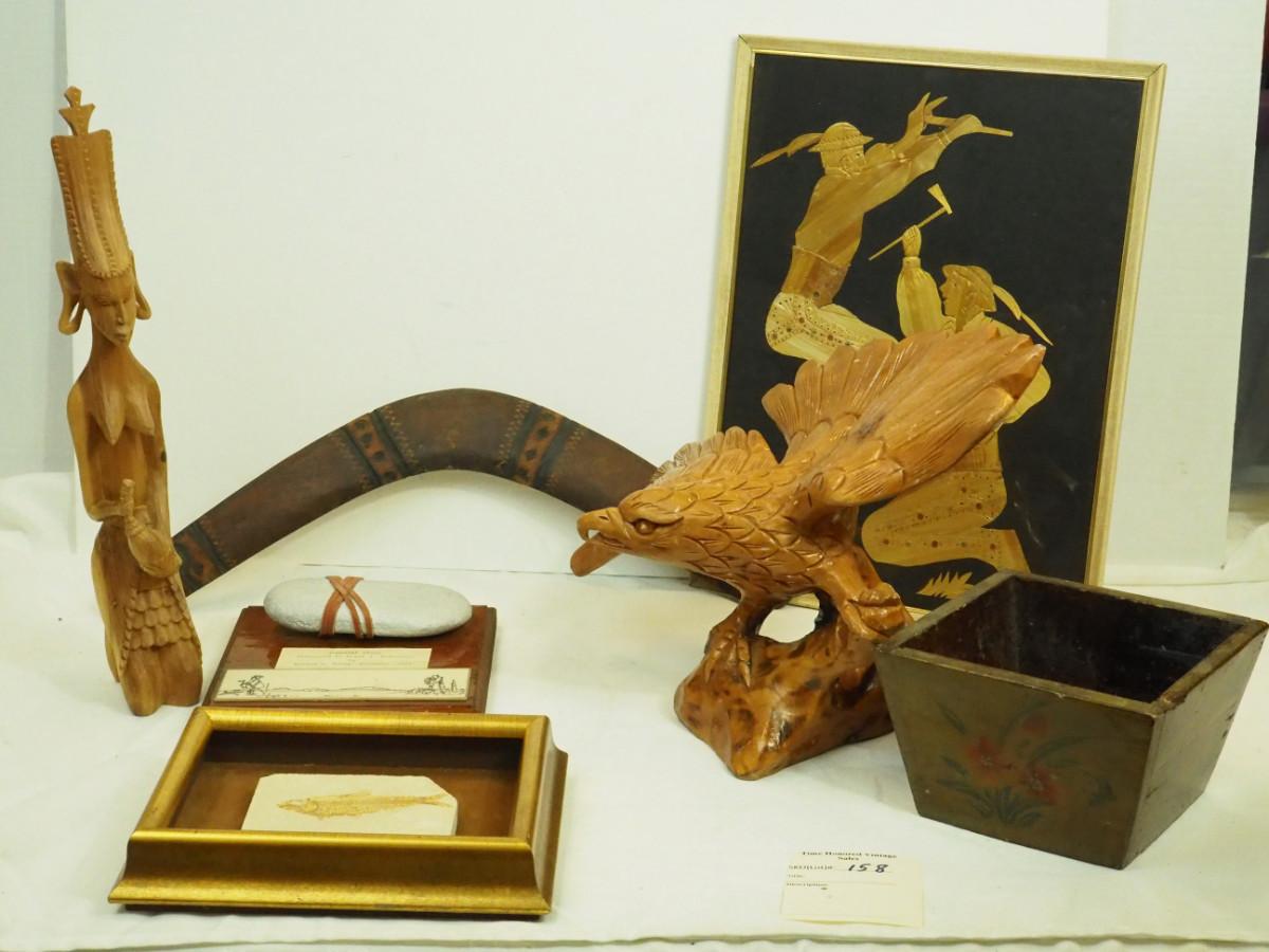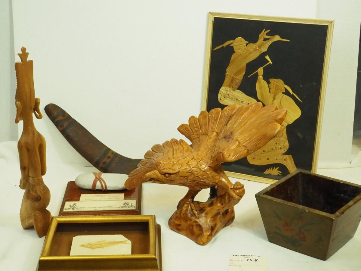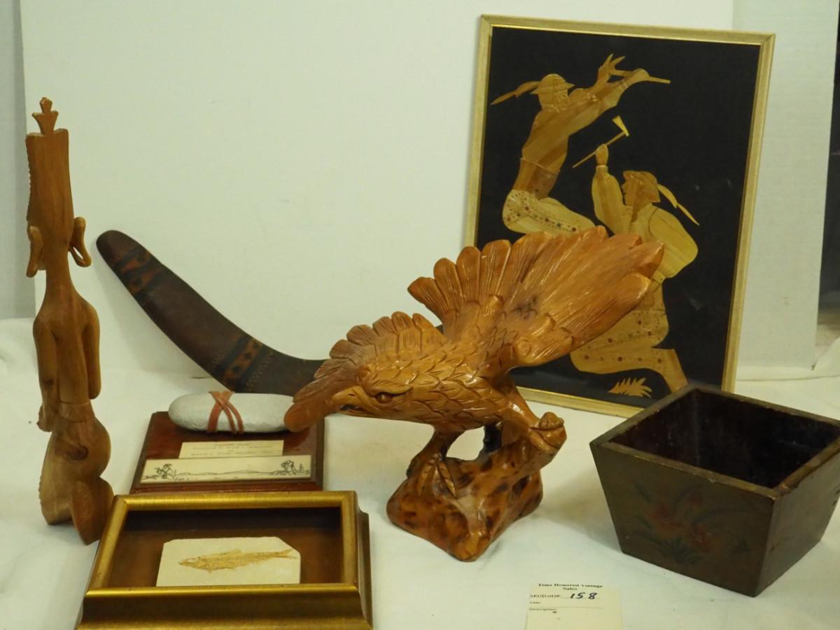 Lot 158- Wooden Statues and collectibles- Boomerang, Marquetry straw Russian dancers framed picture, eagle figurine, Framed Tomahawk, framed fossil fish , painted box, Bali carved figurine.