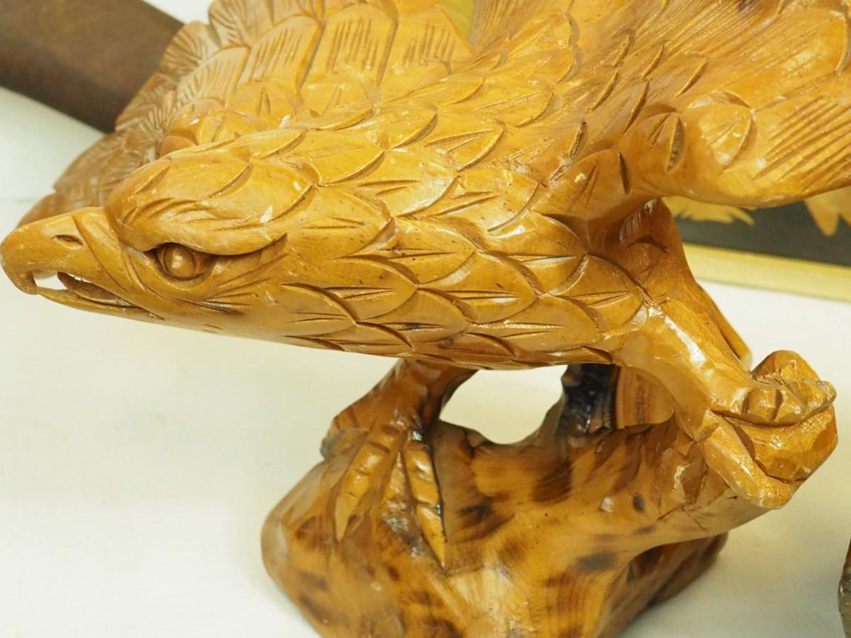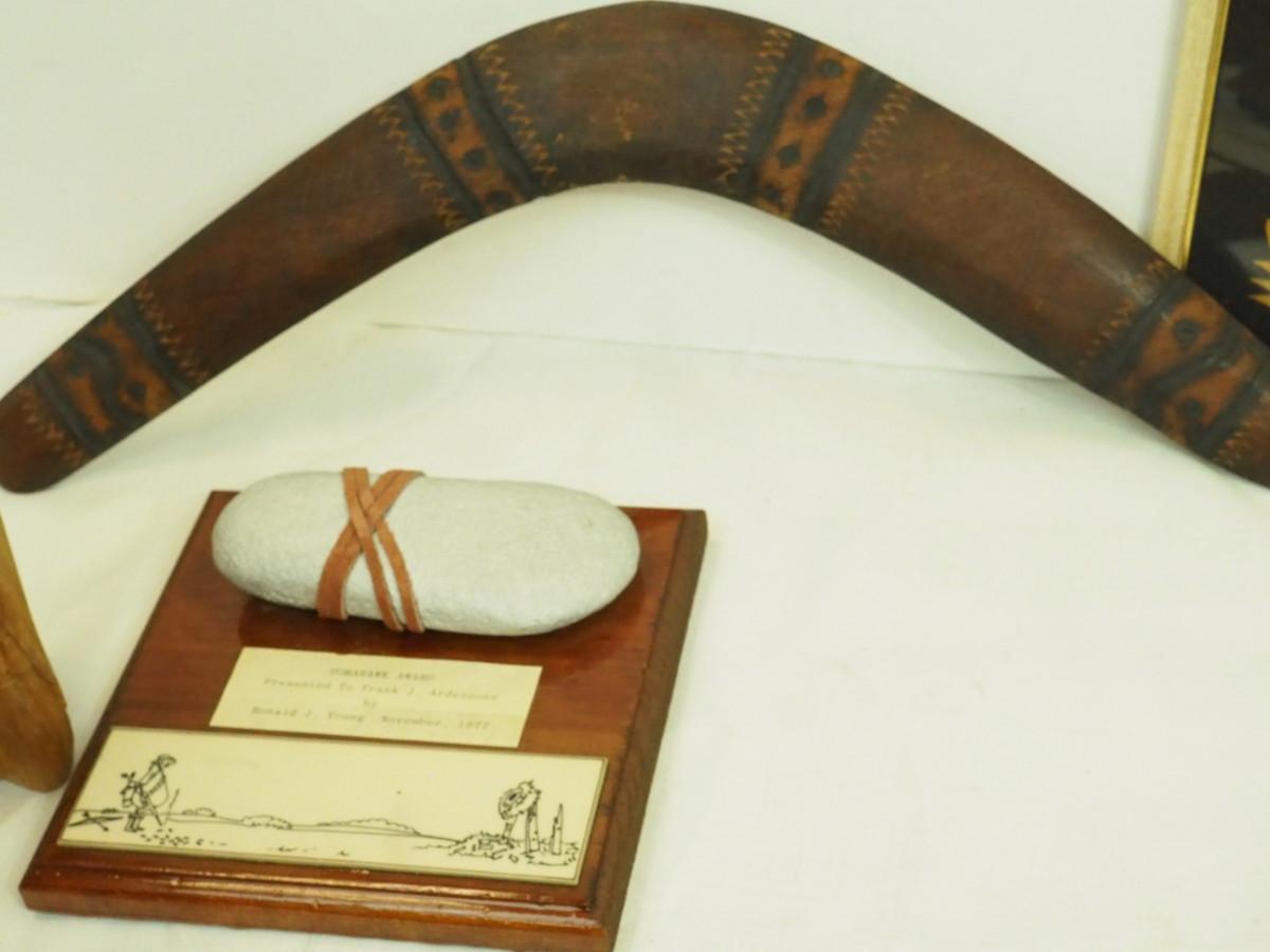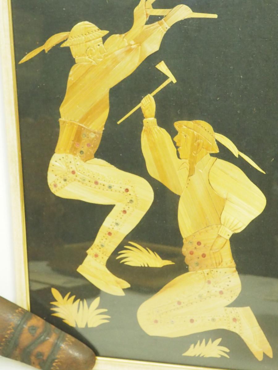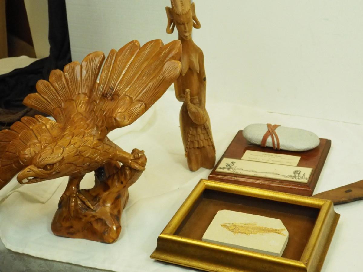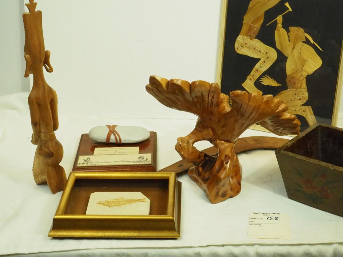 Lot 158- Wooden Statues and collectibles- Boomerang, Marquetry straw Russian dancers framed picture, eagle figurine, Framed Tomahawk, framed fossil fish , painted box, Bali carved figurine.