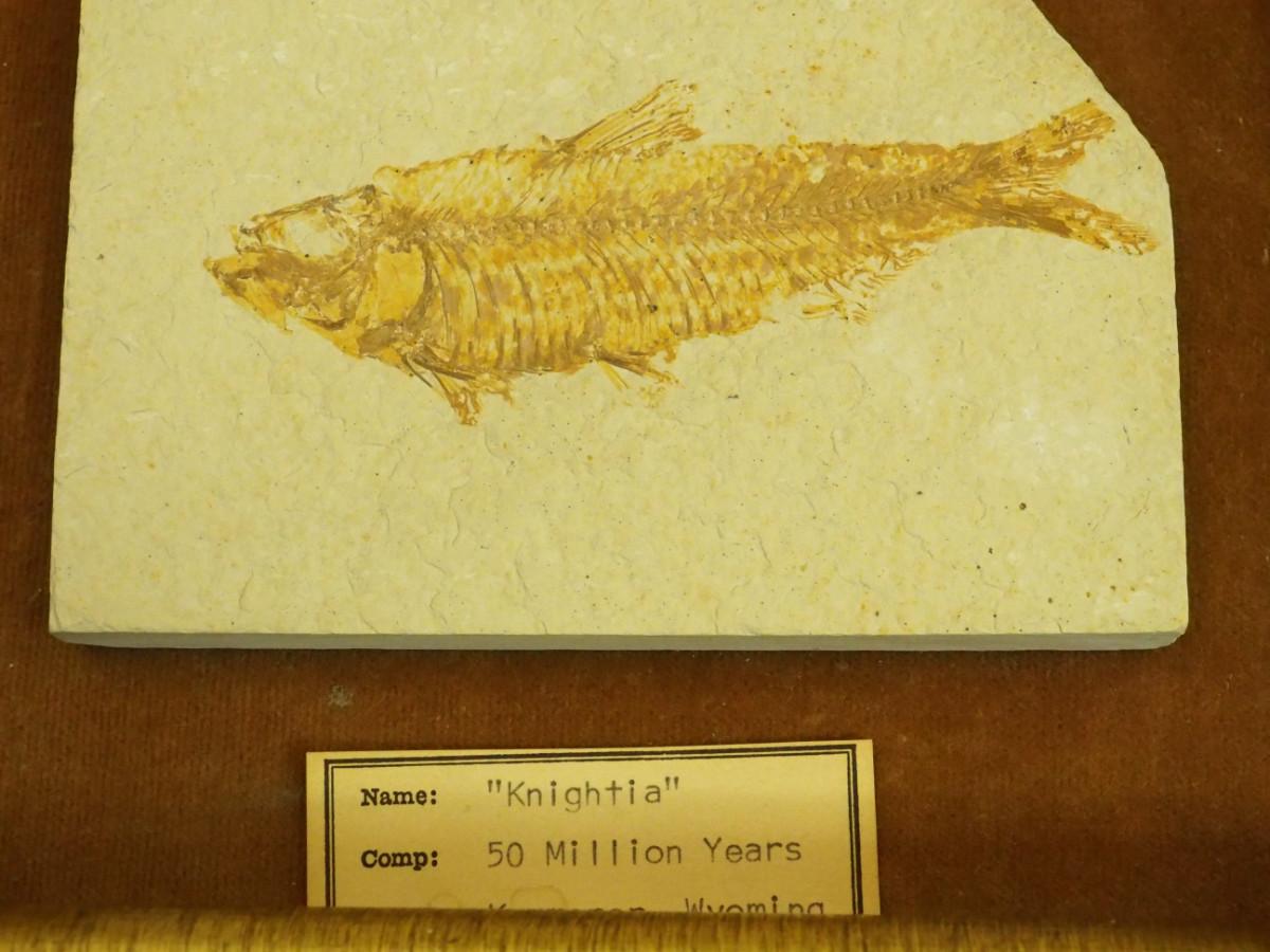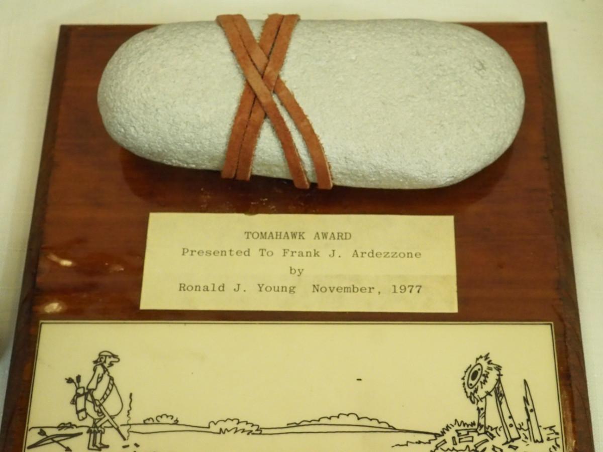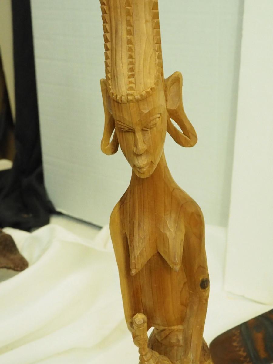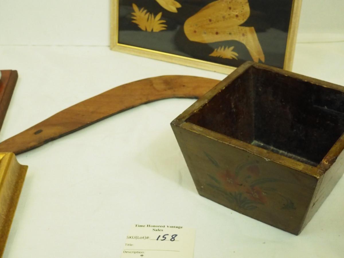 Lot 158- Wooden Statues and collectibles- Boomerang, Marquetry straw Russian dancers framed picture, eagle figurine, Framed Tomahawk, framed fossil fish , painted box, Bali carved figurine.