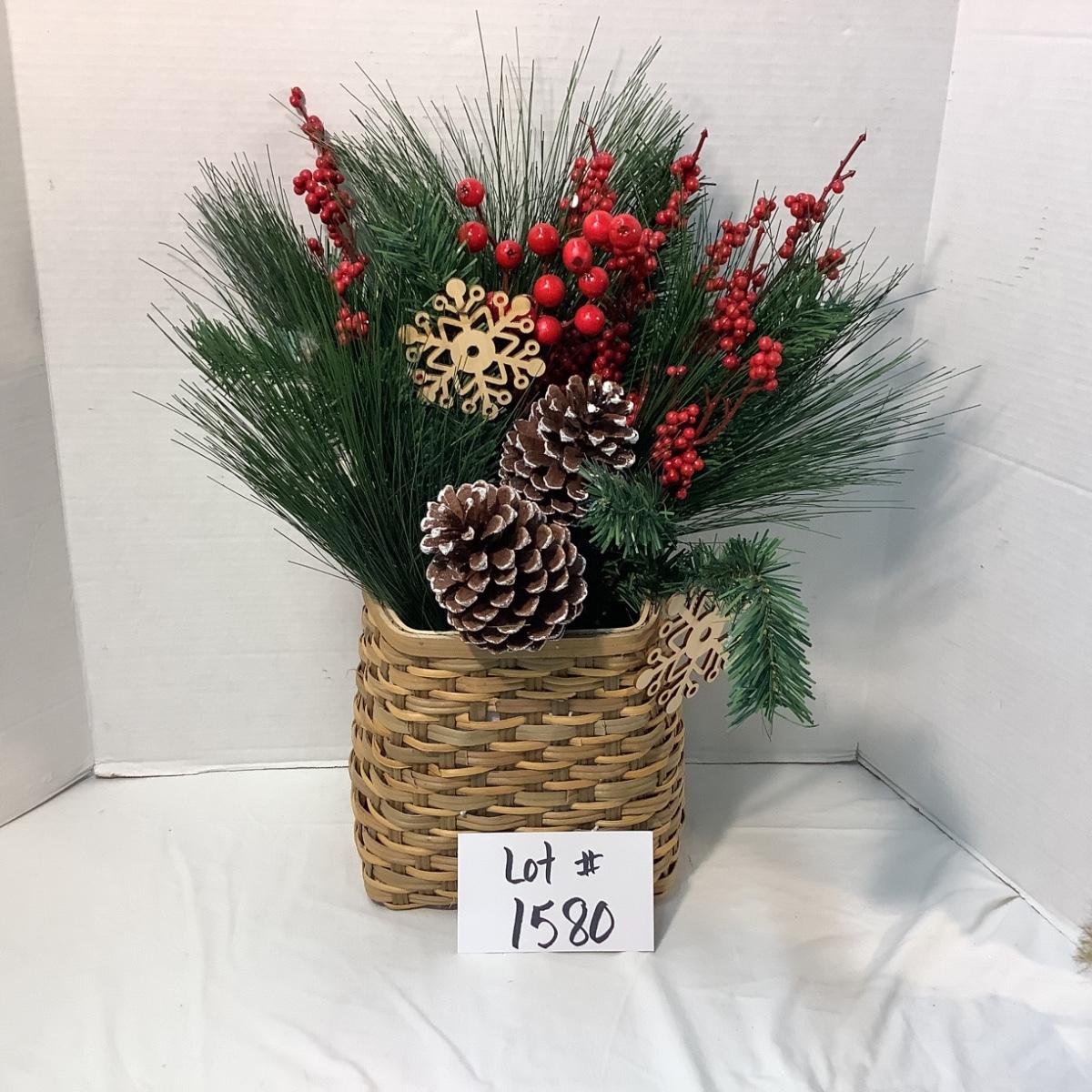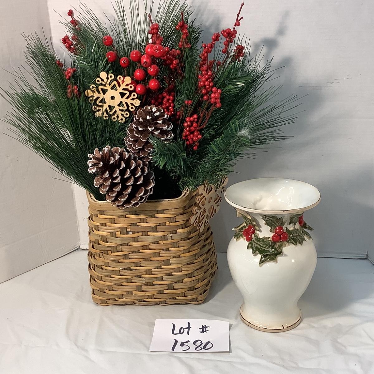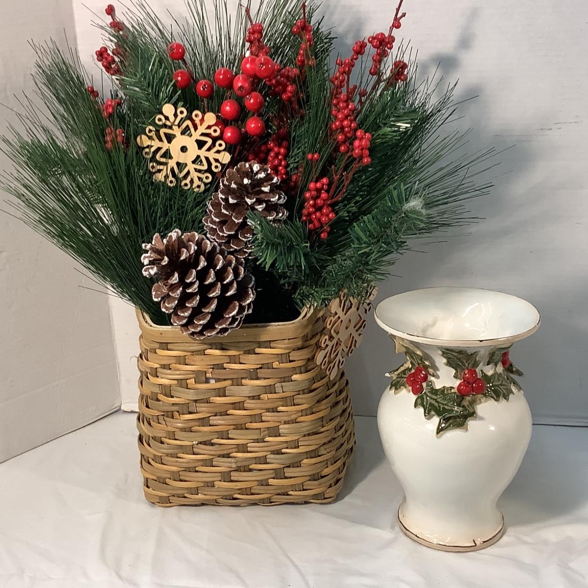 Lot 1580. Beautiful Holiday Basket Arrangement & Holly Trimmed Vase
