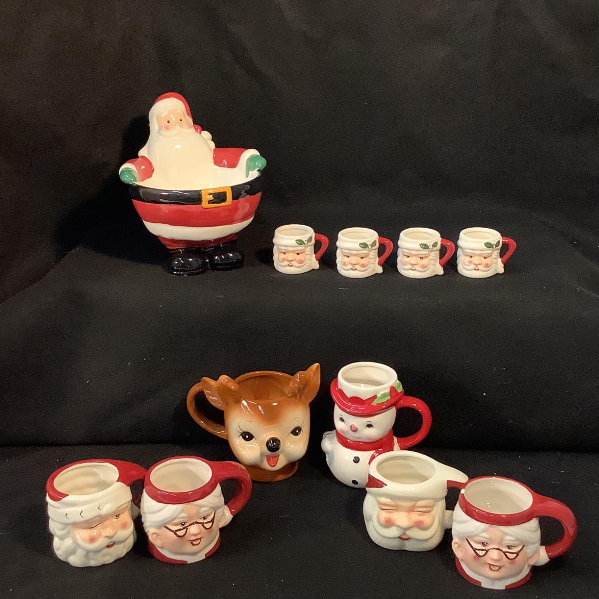 Lot 1586 Miniature Santa Punch Bowl with Four Miniature Santa Mugs/Two Sets Of Mr. & Mrs Claus Mugs/Reindeer Mug/Snowman Mug