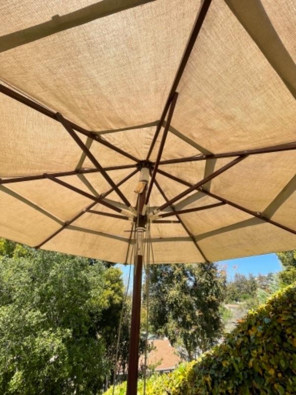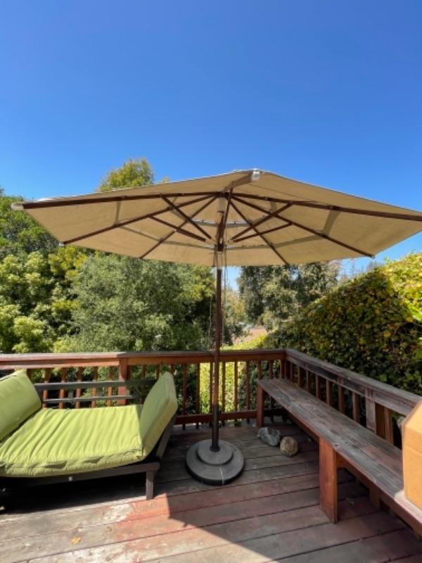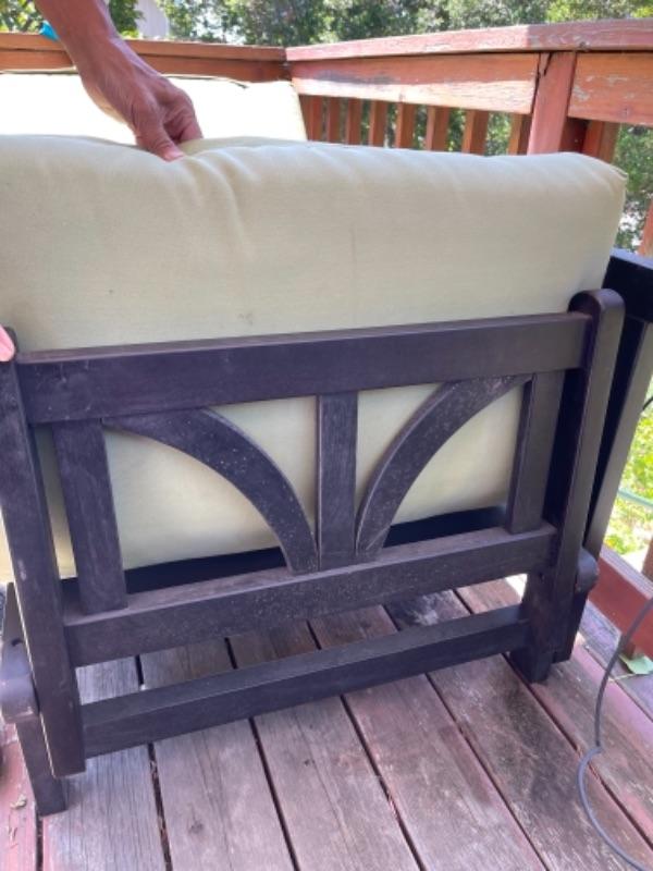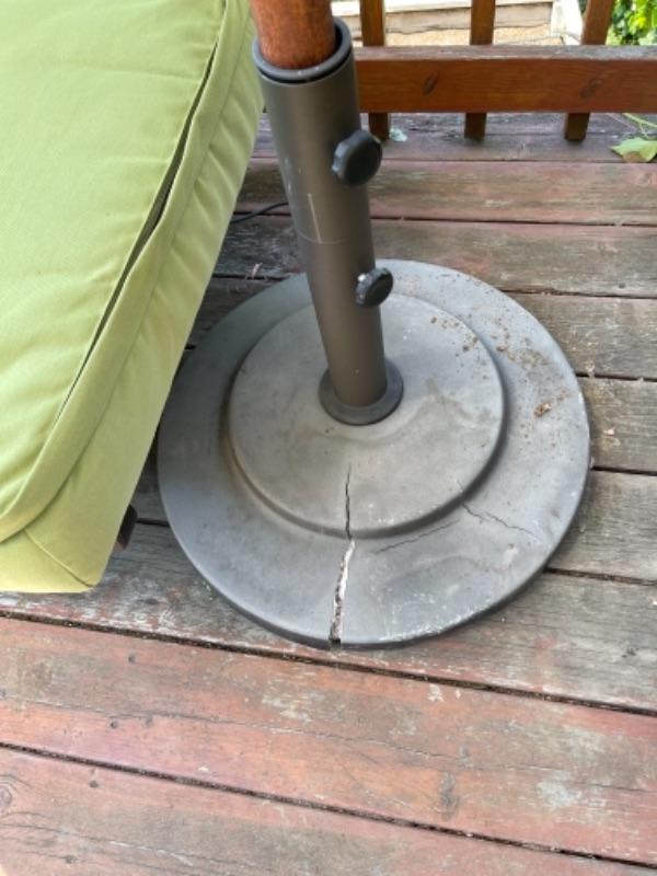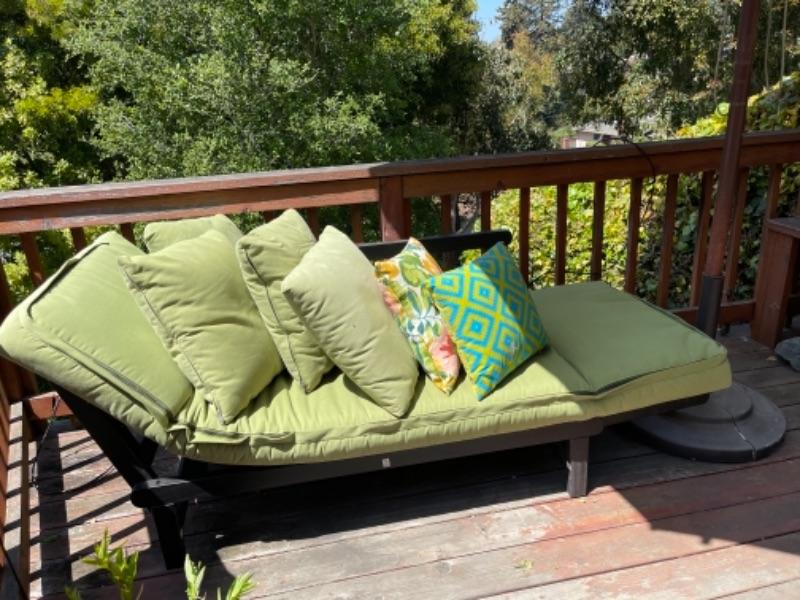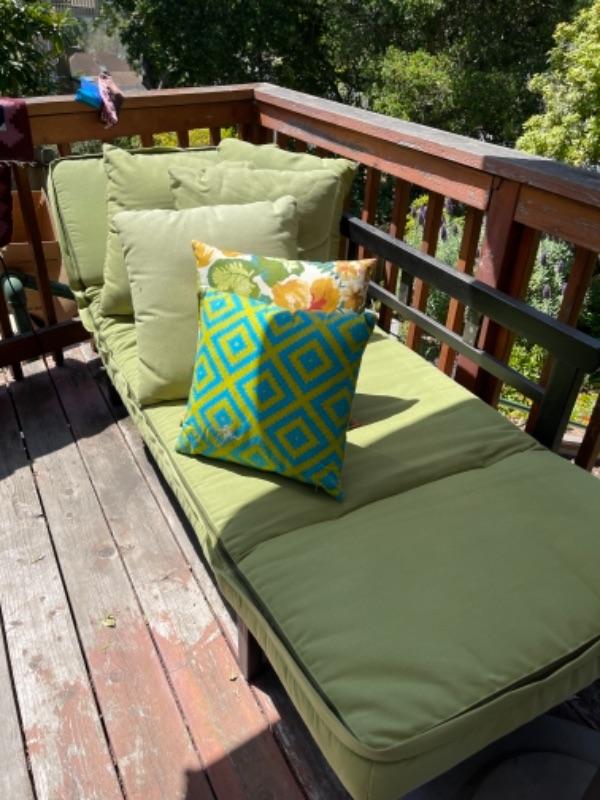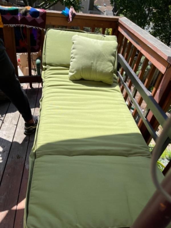 Lot 158G. Garden chaise with cushion and pillows, umbrella with stand (stand cracked)--$125