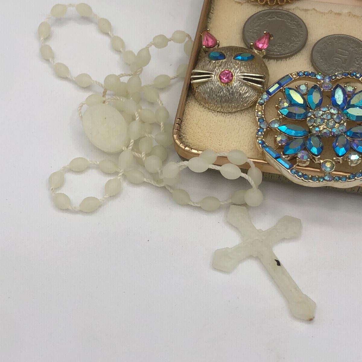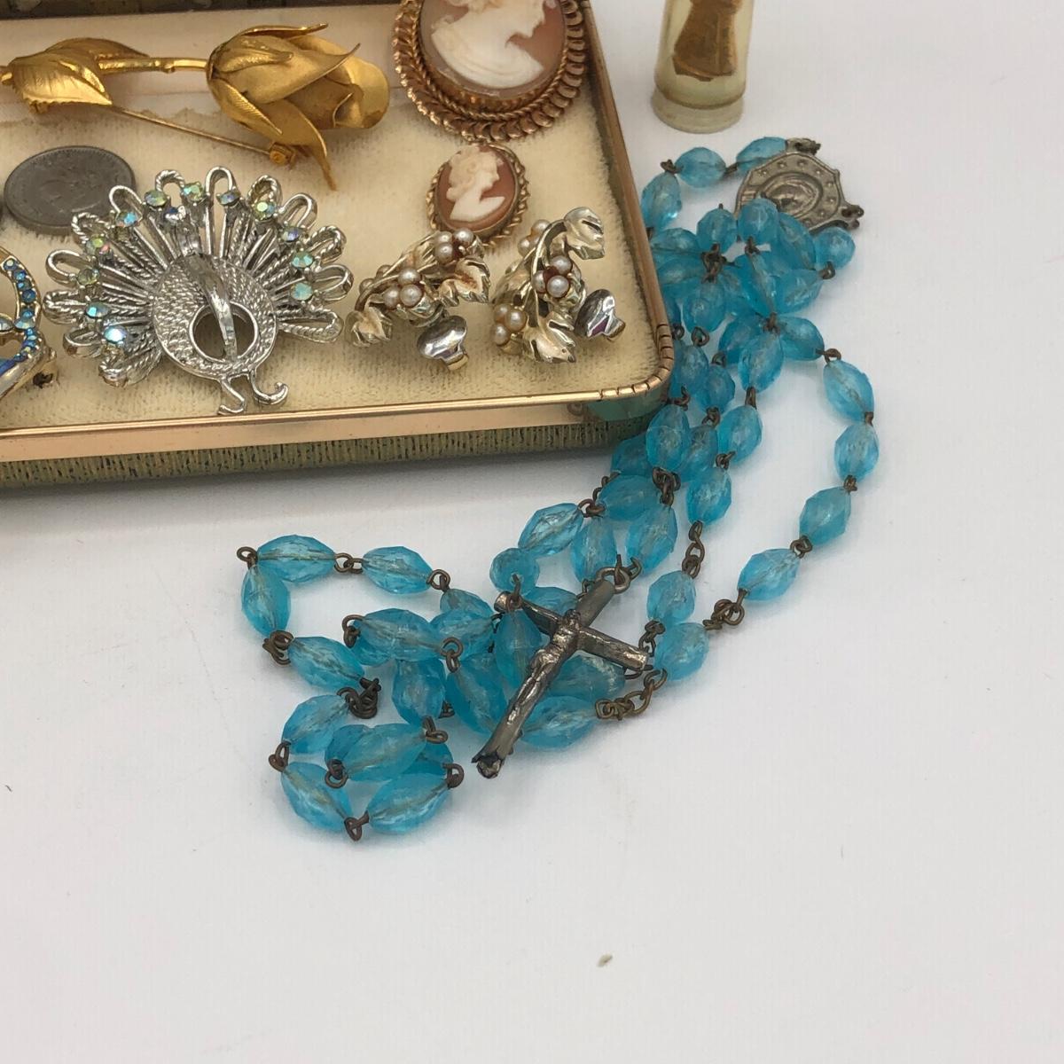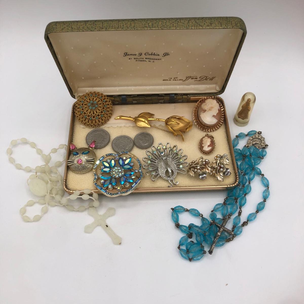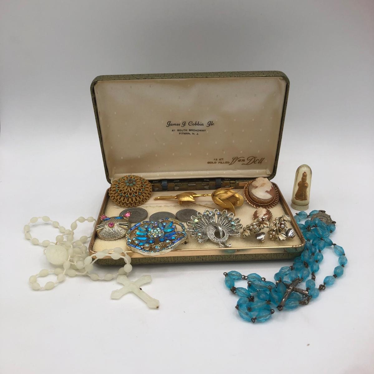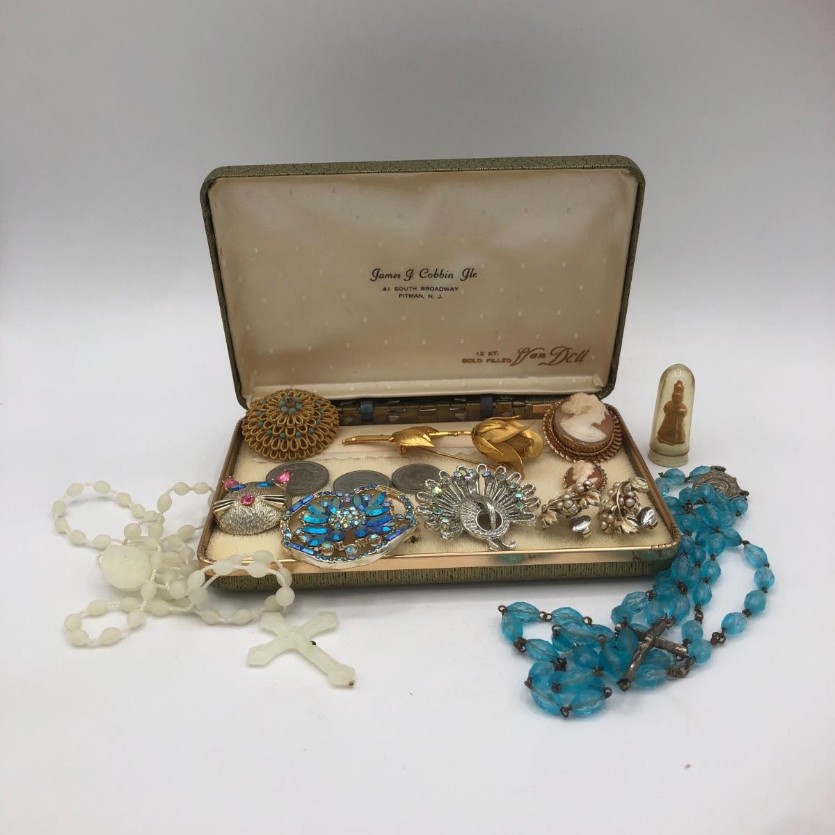 LOT 158J: Vintage Jewelry in Vintage Van Dell Case - Vintage Dodds- W. 30th ST - Textured Silver Tone Cat Head Brooch/Pin, Beaded Rosaries, Cameo Pendant, Brooches & More
