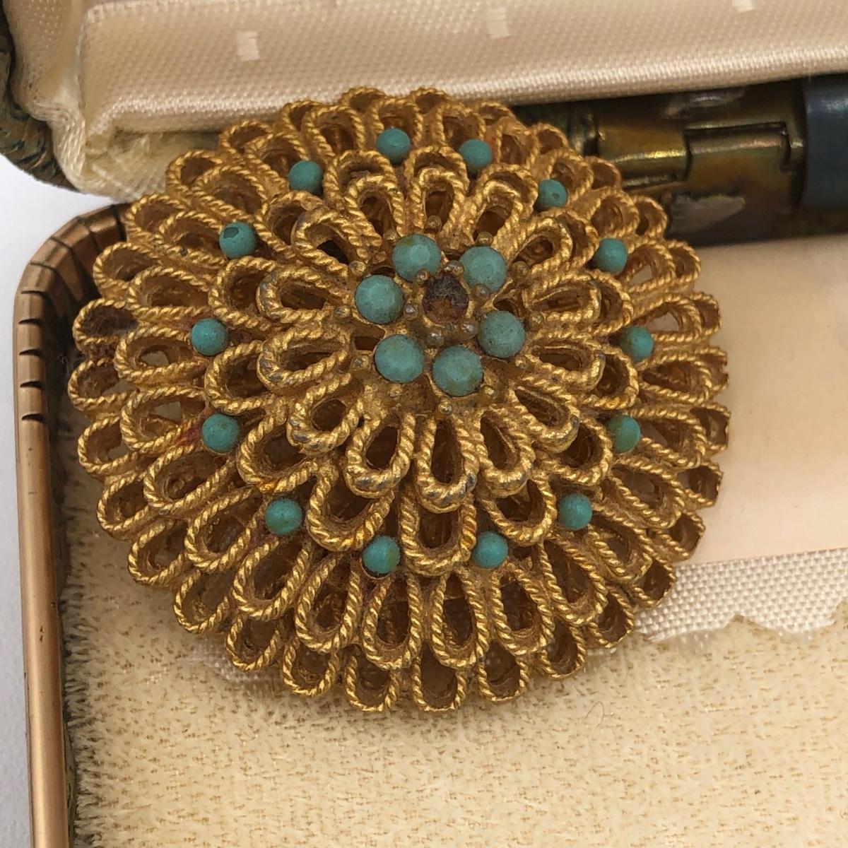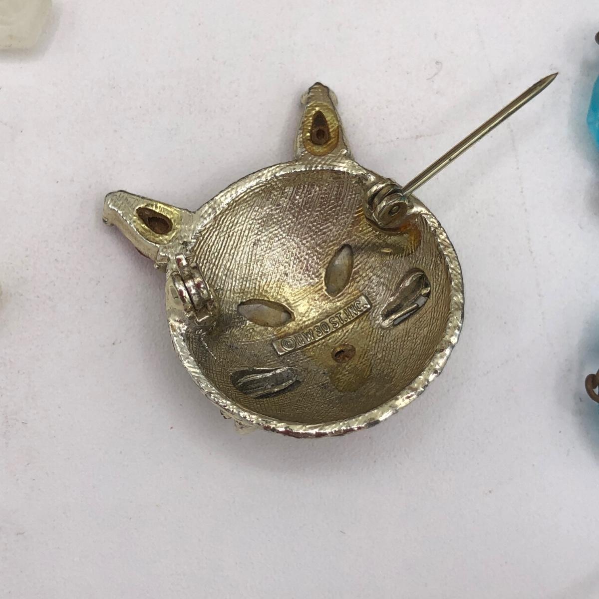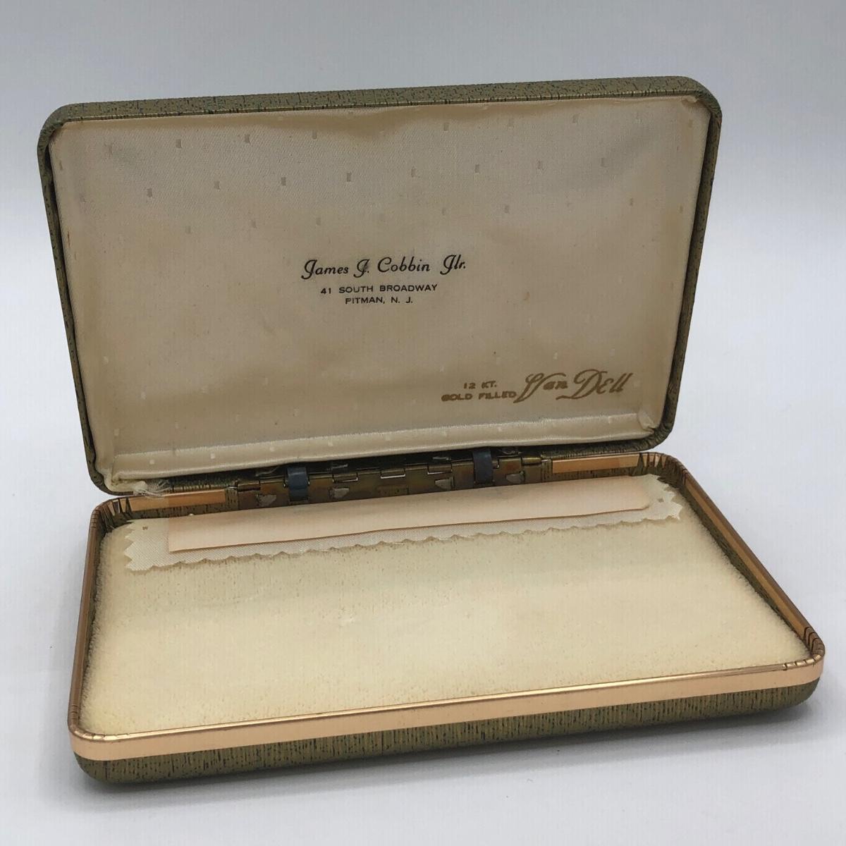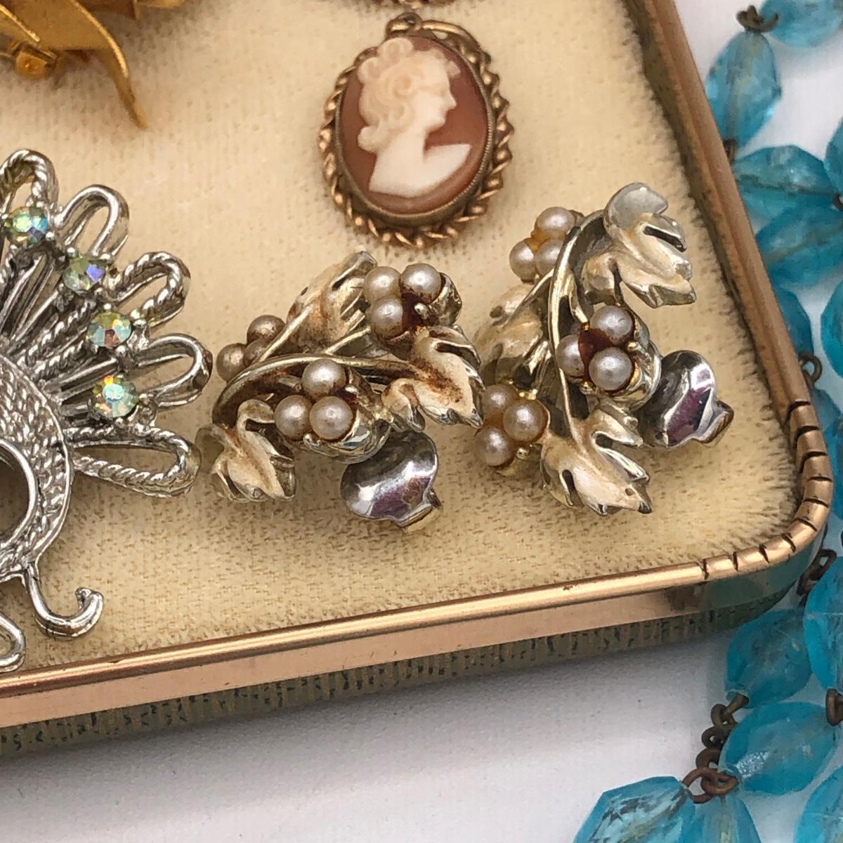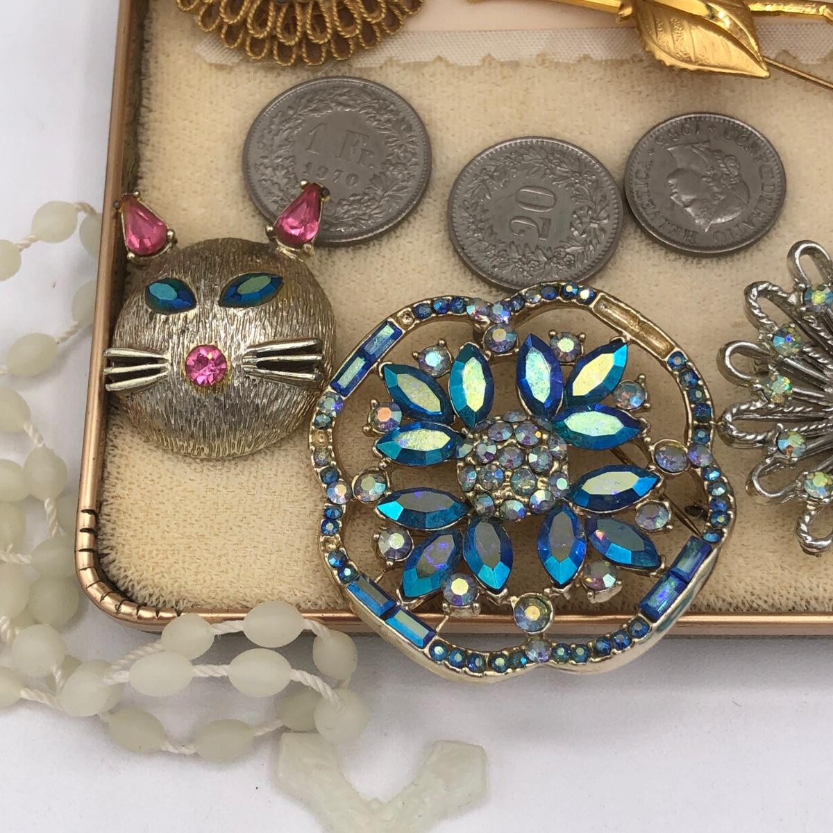 LOT 158J: Vintage Jewelry in Vintage Van Dell Case - Vintage Dodds- W. 30th ST - Textured Silver Tone Cat Head Brooch/Pin, Beaded Rosaries, Cameo Pendant, Brooches & More