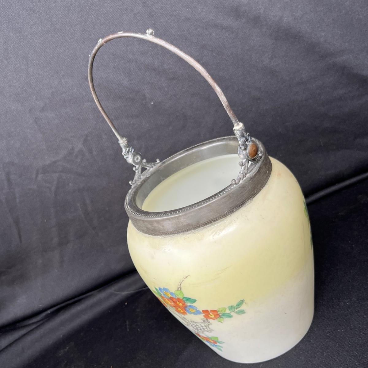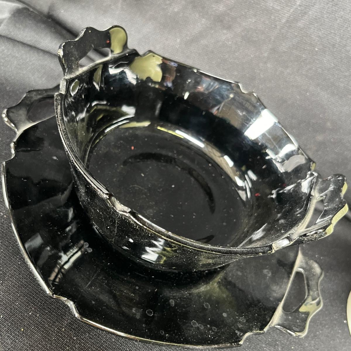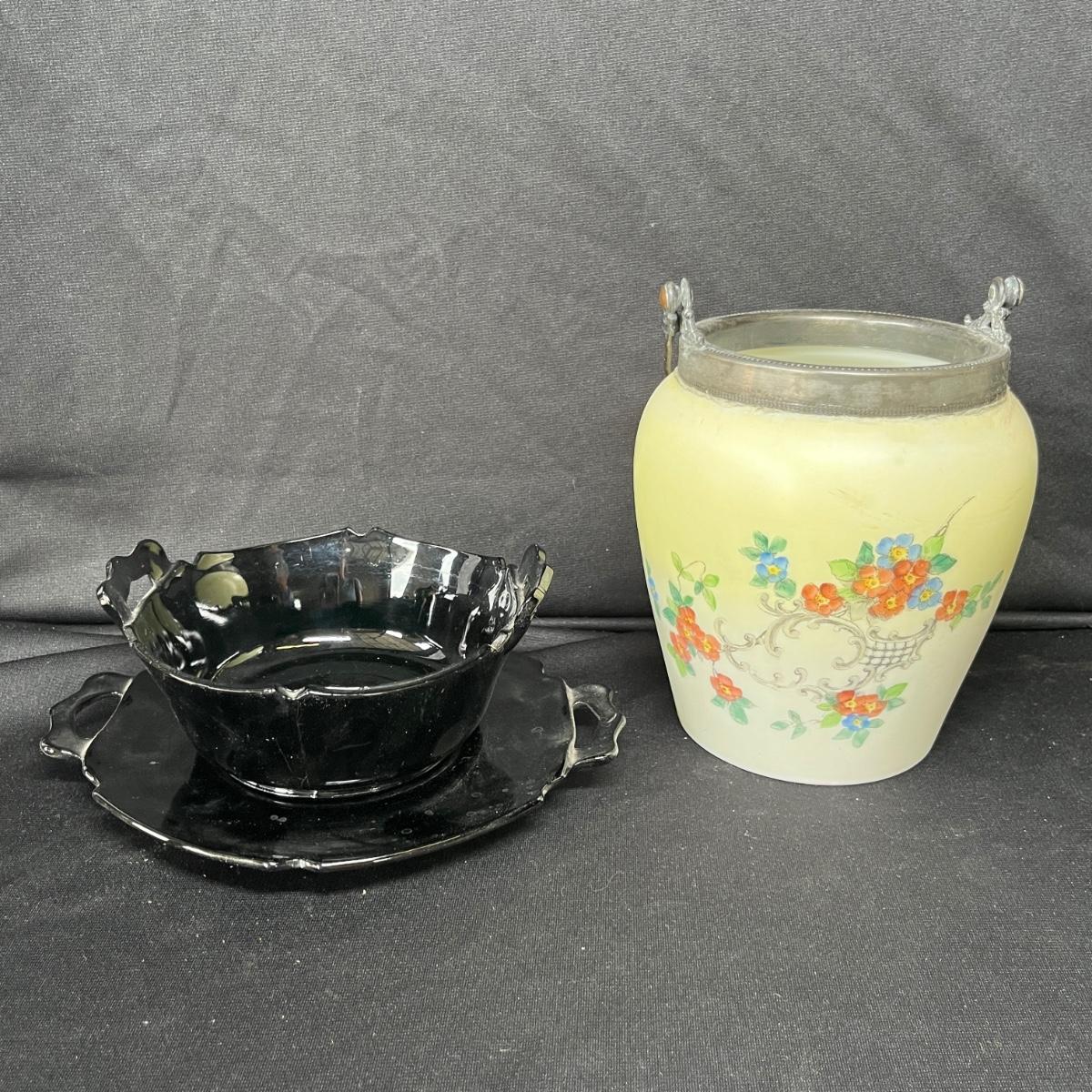The biscuit barrel is missing the lid. The black glass is McKee.