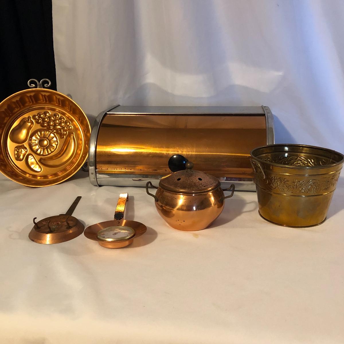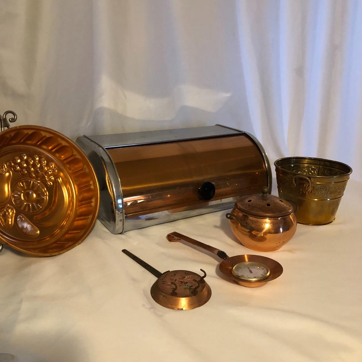 Lot 159 - Copper Kitchen Collection with Vintage Pantry Queen Bread Bin