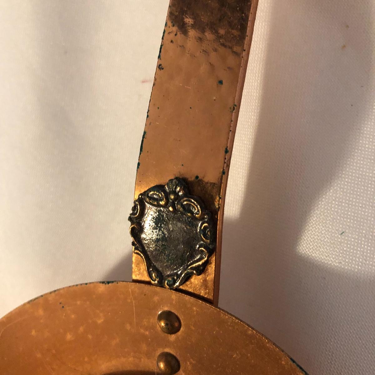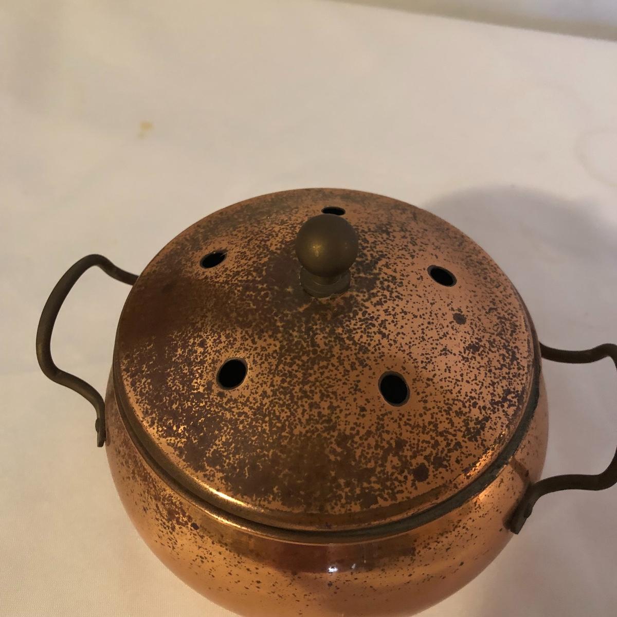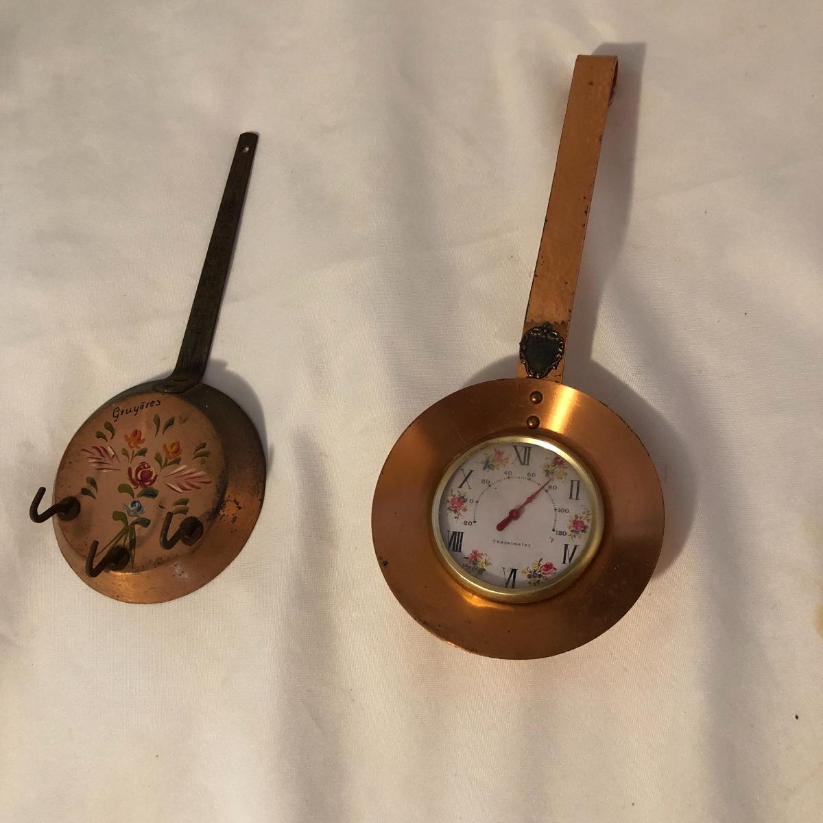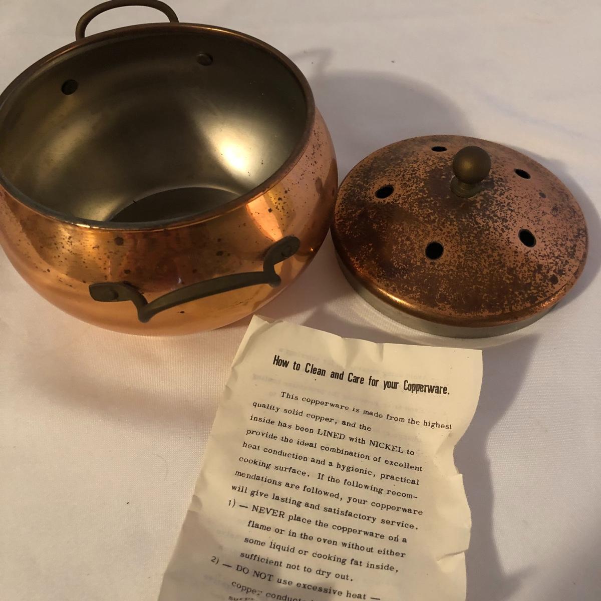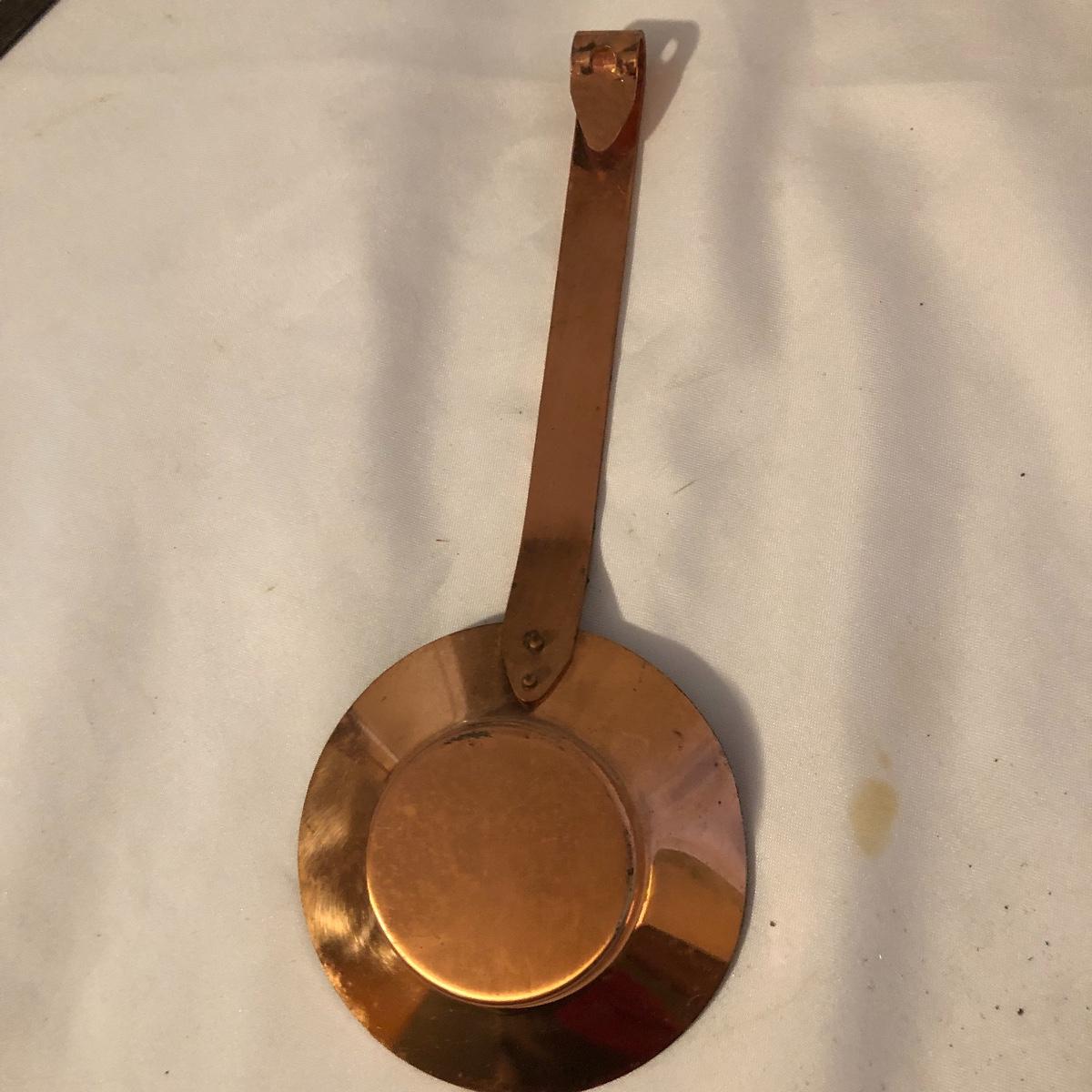 Add a little bling of copper to your kitchen with this lot! It includes a vintage style Pantry Queen bread bin, a lidded container, a bucket, a decorative mold and two wall spoons - one a thermometer and the other to hang keys. The Pantry Queen bread bin measures 17.5” wide x 10” deep x 7” tall. The mold is 10” In diameter. Shipping Available.