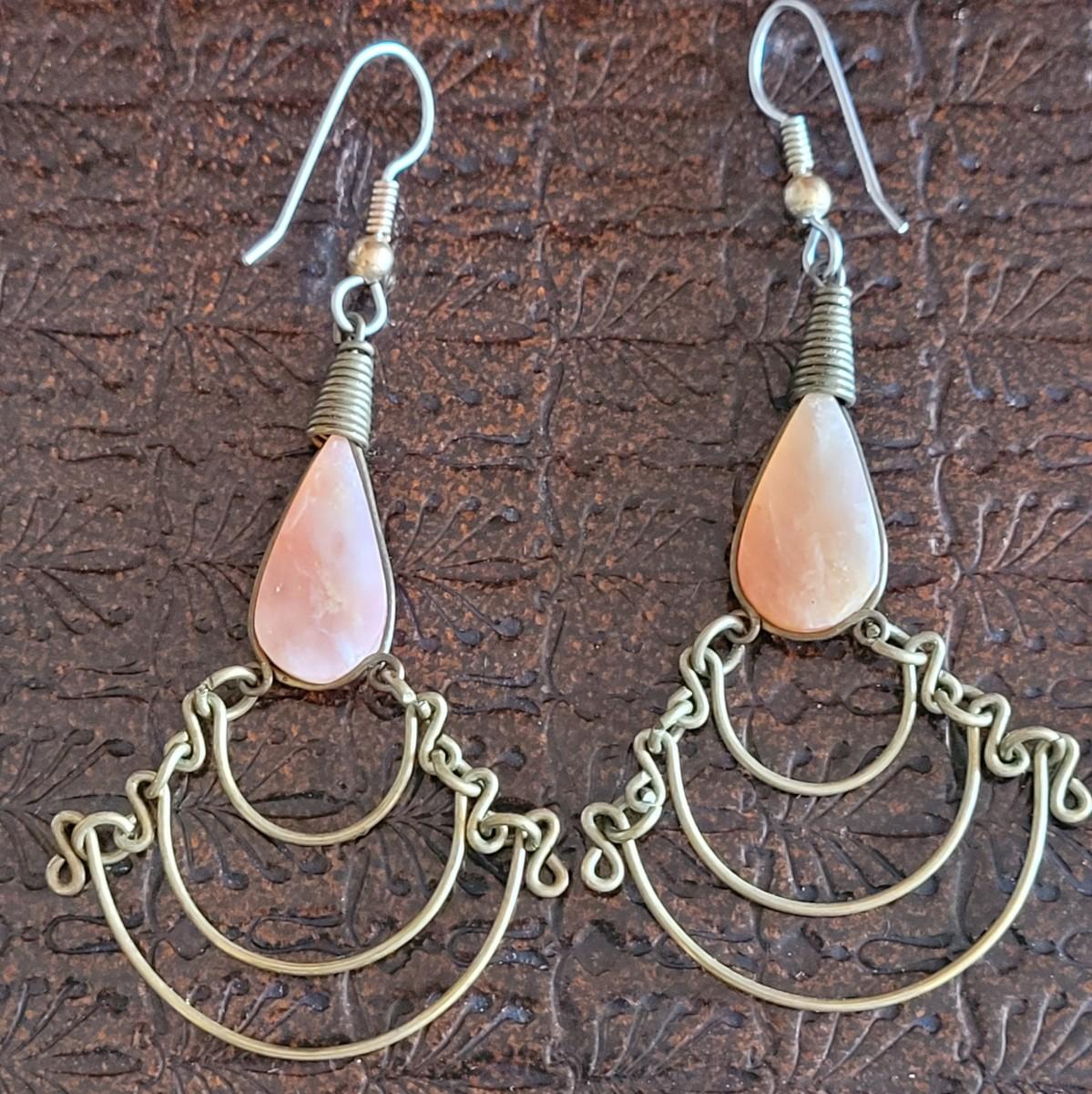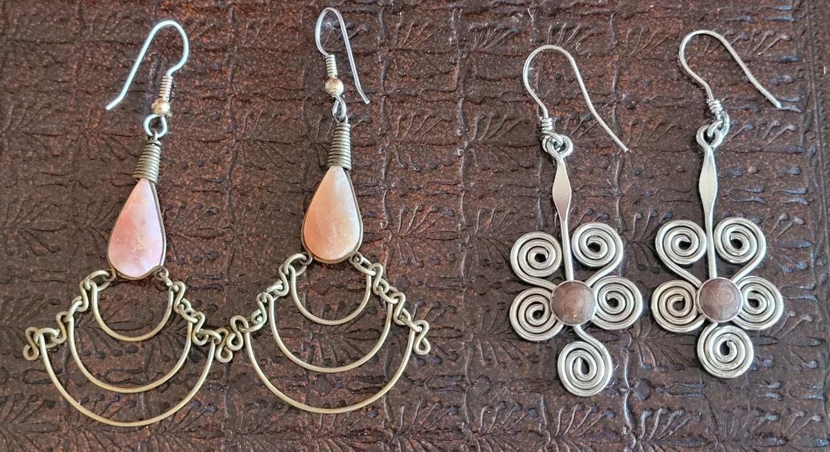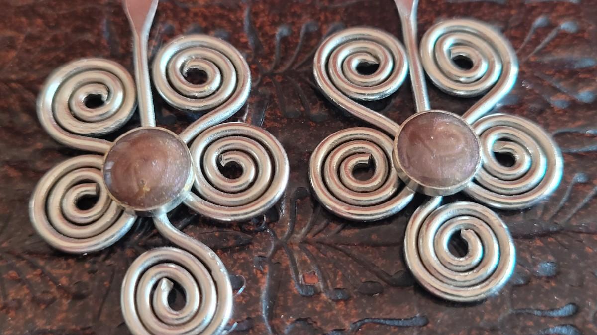 One brass with rose quartz and the other silver with either Enamel or stone center.