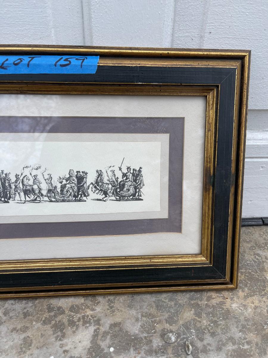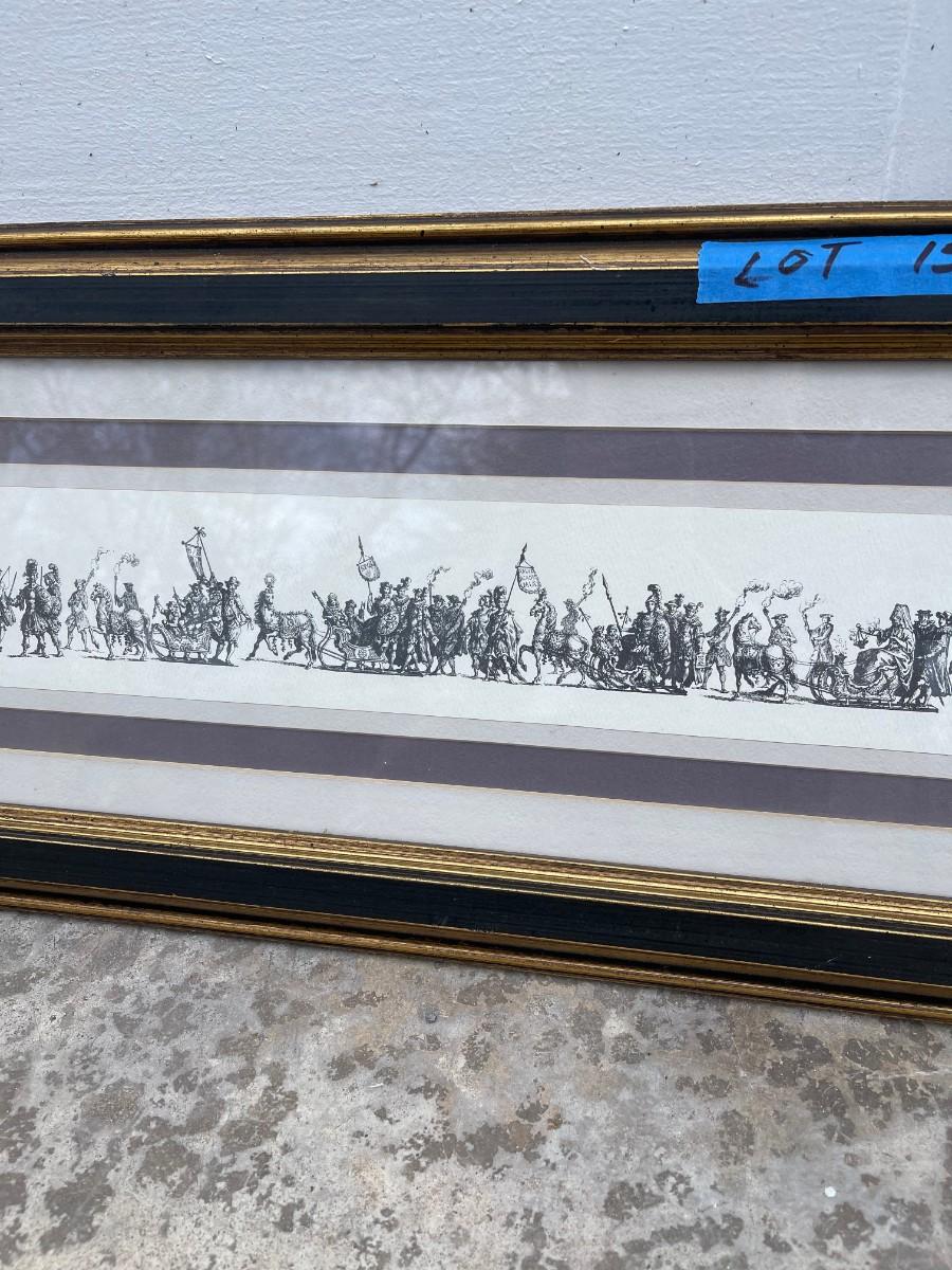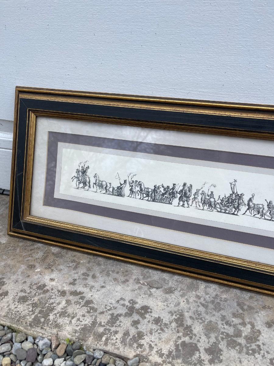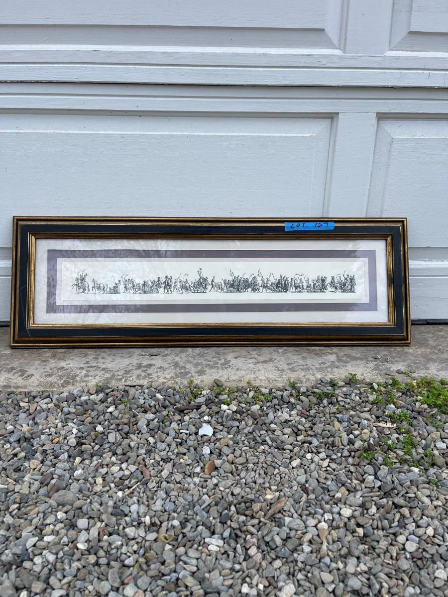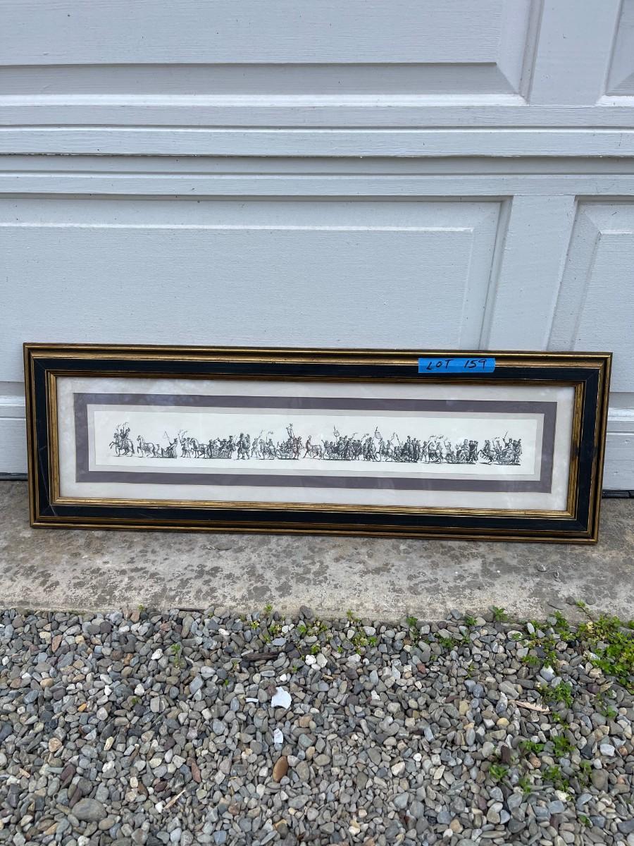 Professionally framed and matted, 31" long and 10-1/2" wide, European procession of horsemen and sleighs.