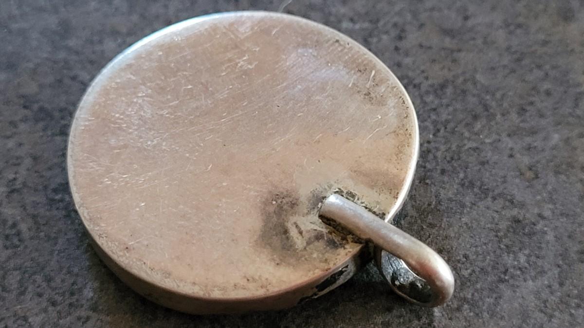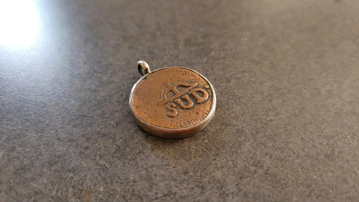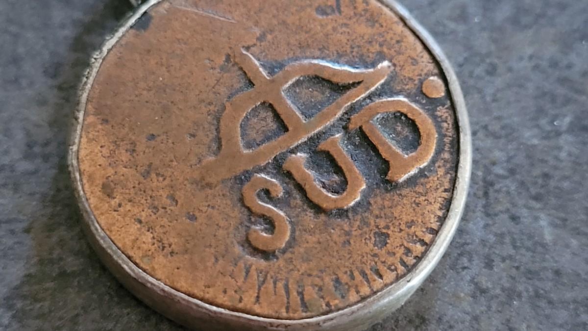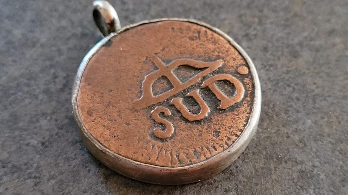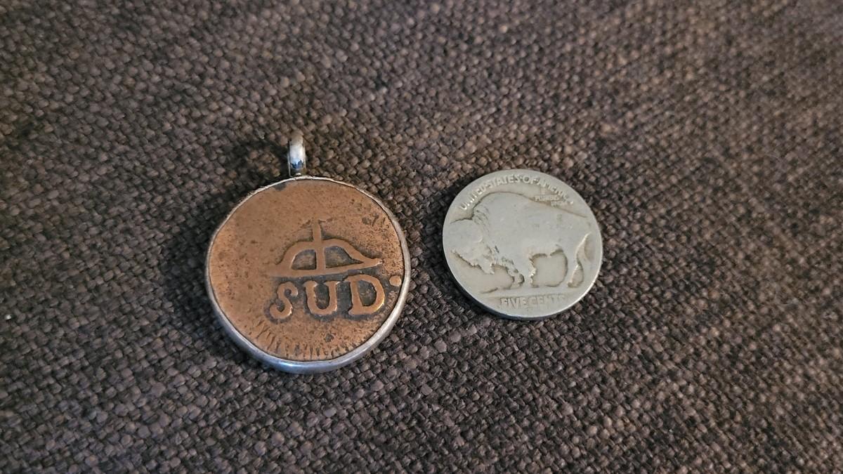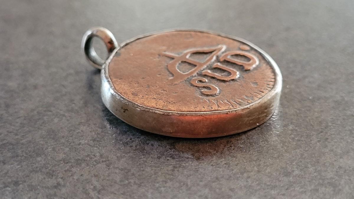 The bow and arrow design is a pretty good give-away that this is a copper coin from the insurgents in Oaxaca province minted during the Mexican War of Independence around 1813. The 'SUD' refers to leader General Morelos. The coin is set inside a pendant case that is Silver Tone.