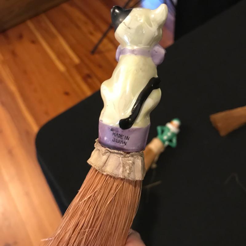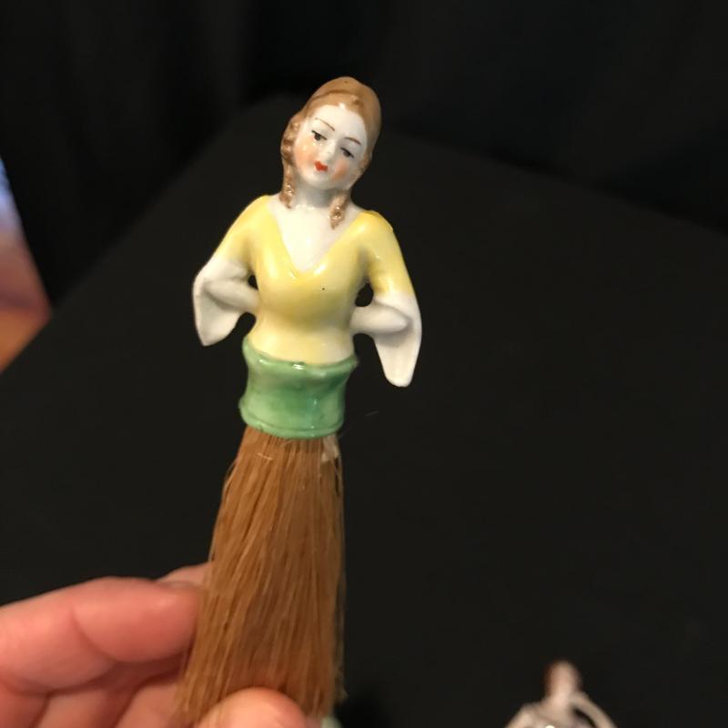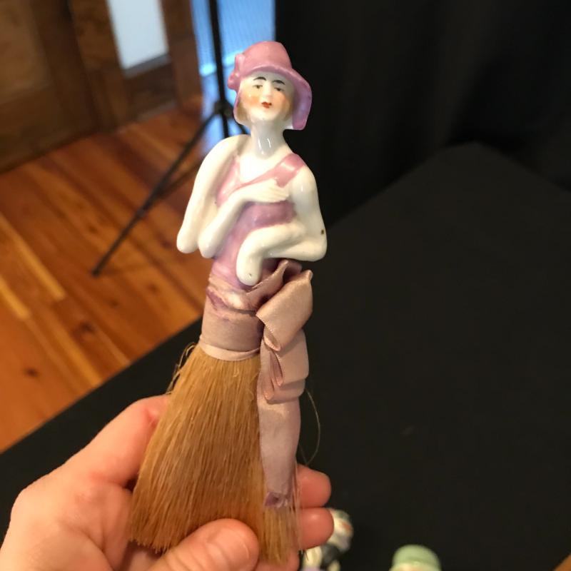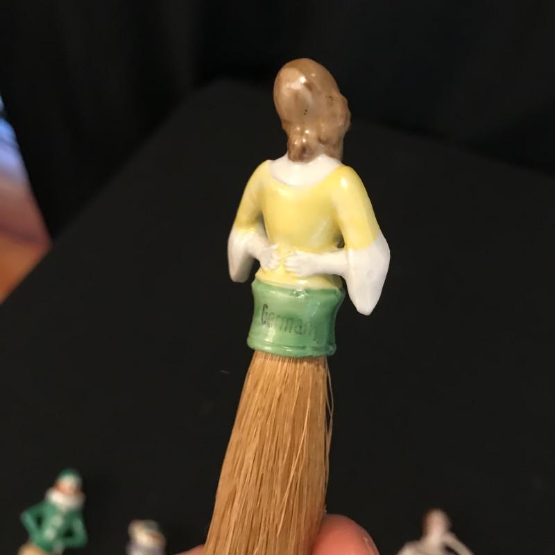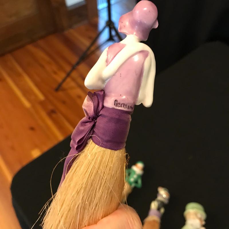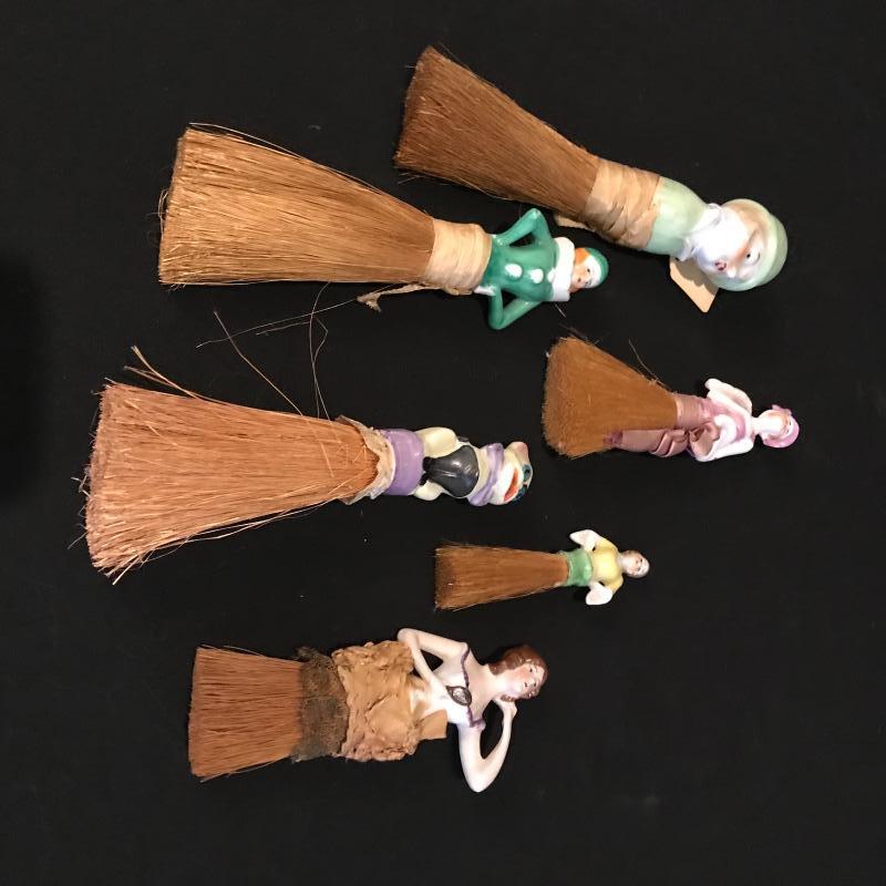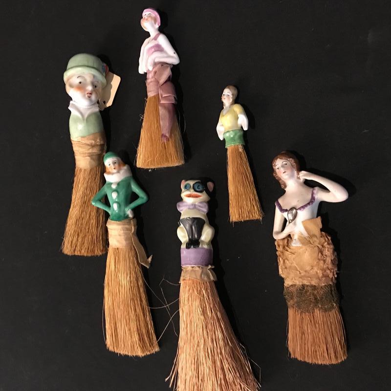 Six antique ceramic broom dolls from Japan and Germany. Tallest measures 8”. Shipping available or local pickup in Asheville, NC.