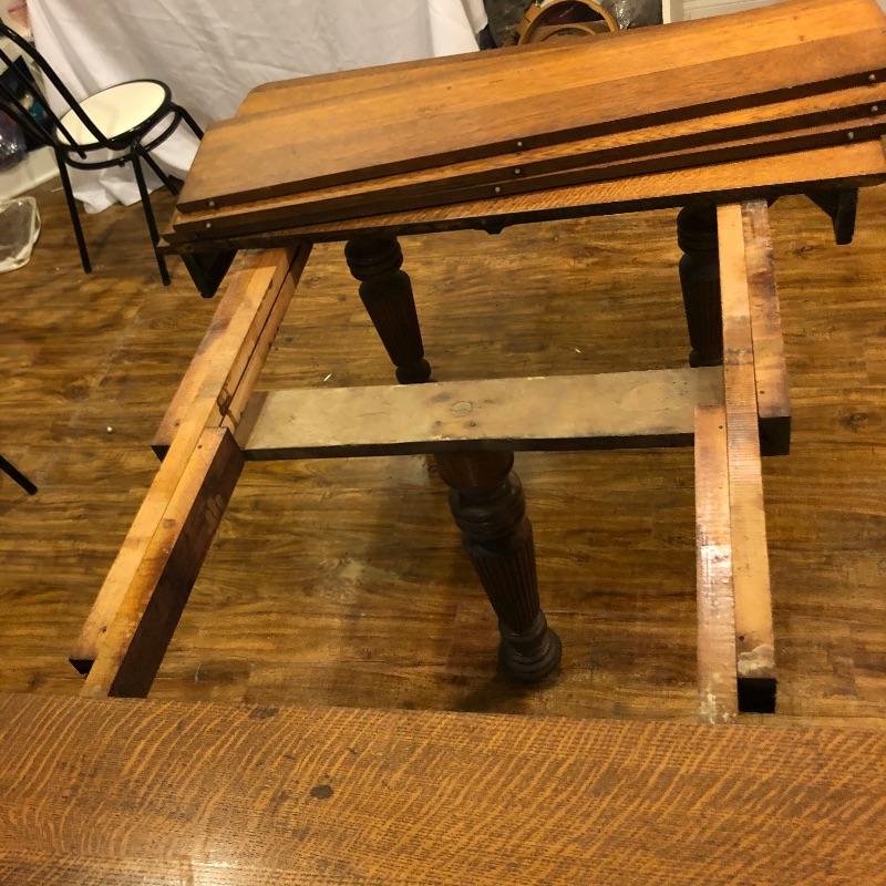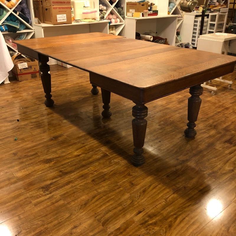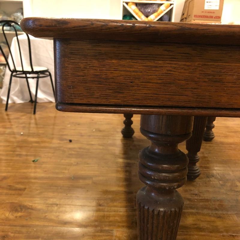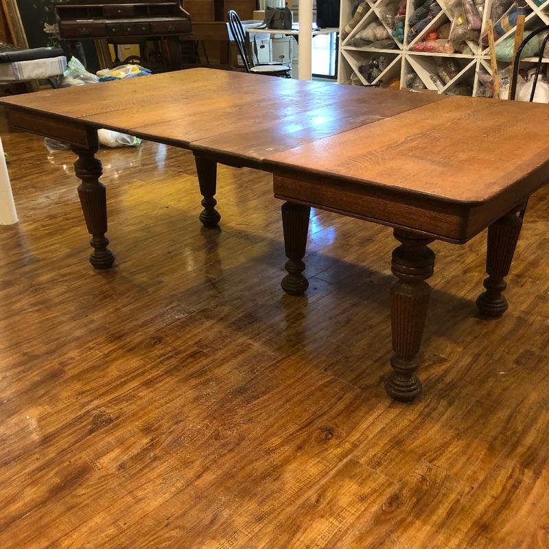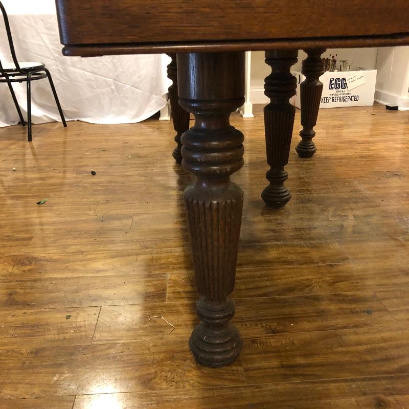 This is a sturdy and attractive antique table with 3 leaves. It appears to be oak and features beautifully crafted carved legs. It does need some restoring on the table surface as there are some blemishes that are shown in an image; it would be well worth a little effort to restore this table to its former glory! The mechanics for adding and taking out the leaves are easy and work well. The chairs in lot 162 go very well with this table.