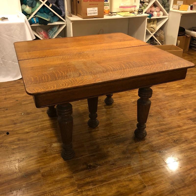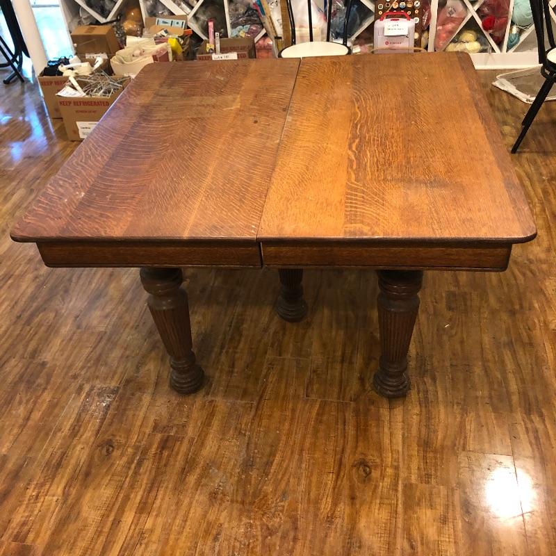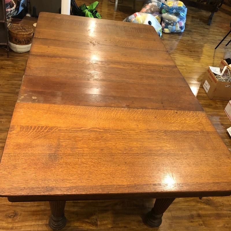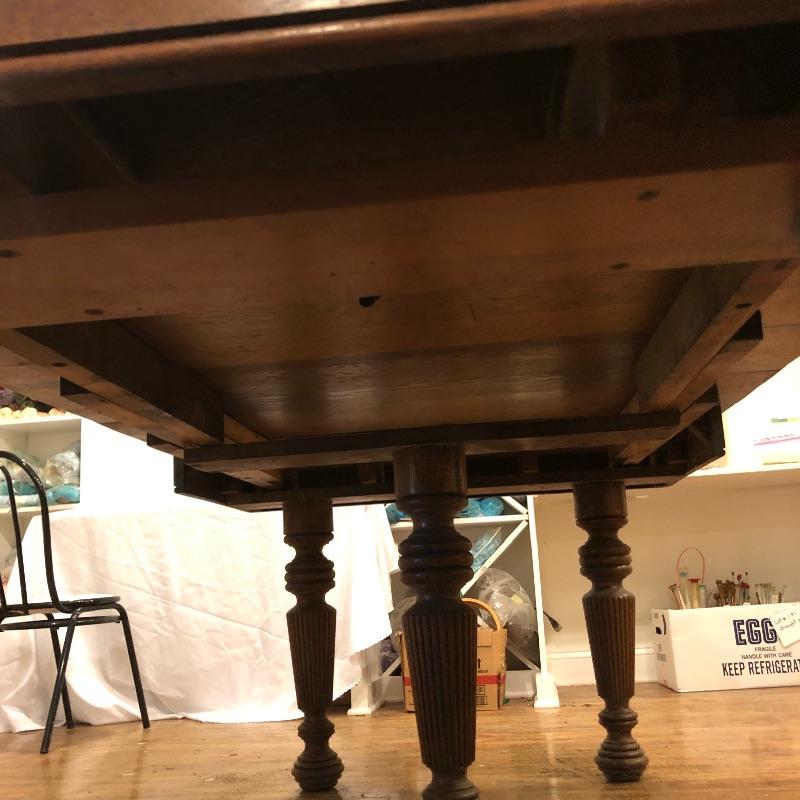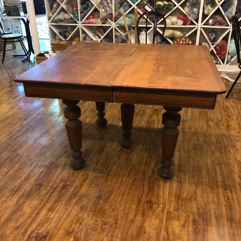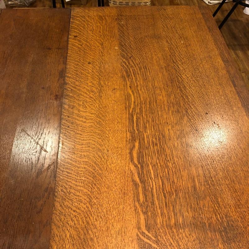 This is a sturdy and attractive antique table with 3 leaves. It appears to be oak and features beautifully crafted carved legs. It does need some restoring on the table surface as there are some blemishes that are shown in an image; it would be well worth a little effort to restore this table to its former glory! The mechanics for adding and taking out the leaves are easy and work well. The chairs in lot 162 go very well with this table.