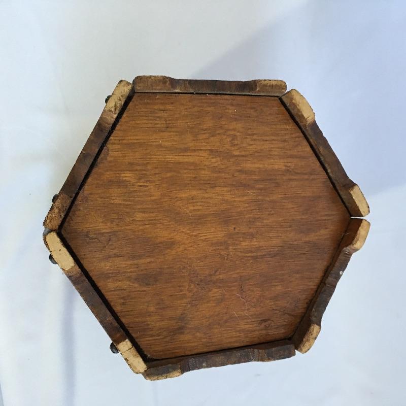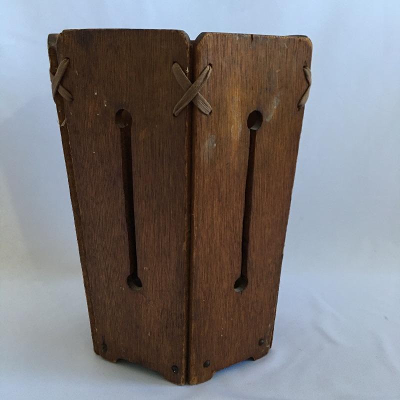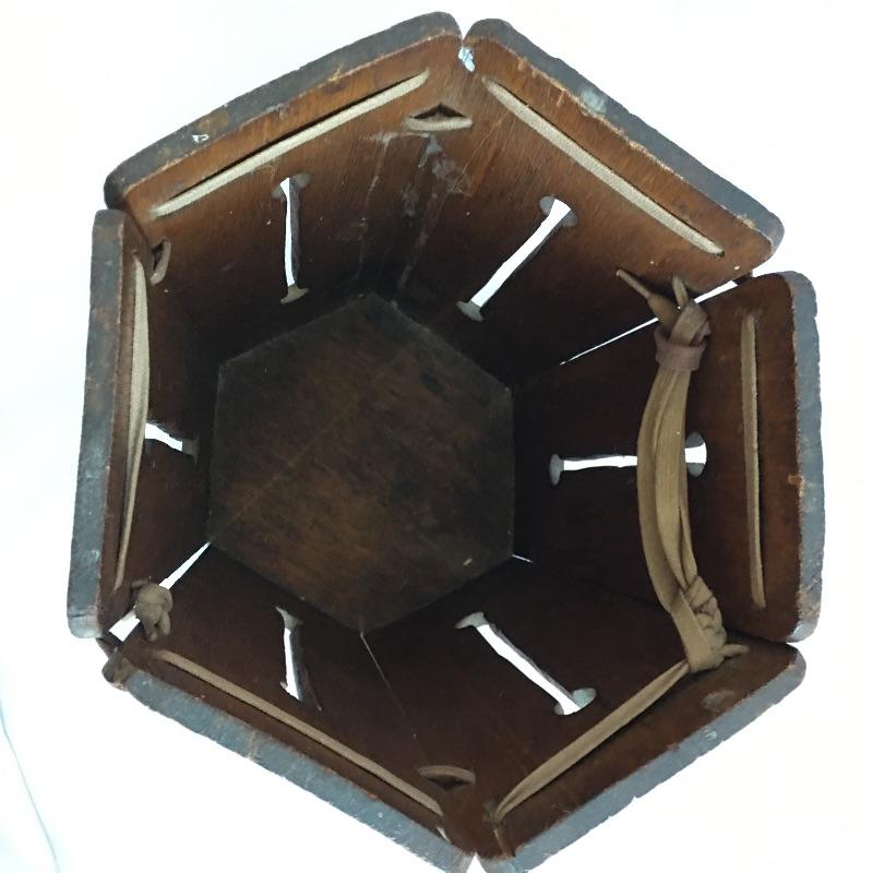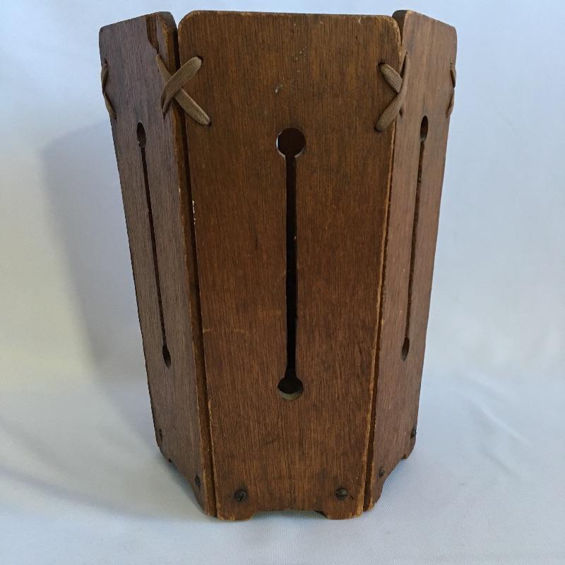 Arts & Crafts hexagon shaped wooden wastebasket. A unique wastebasket with keyholes carved in the sides and laced together at the top.