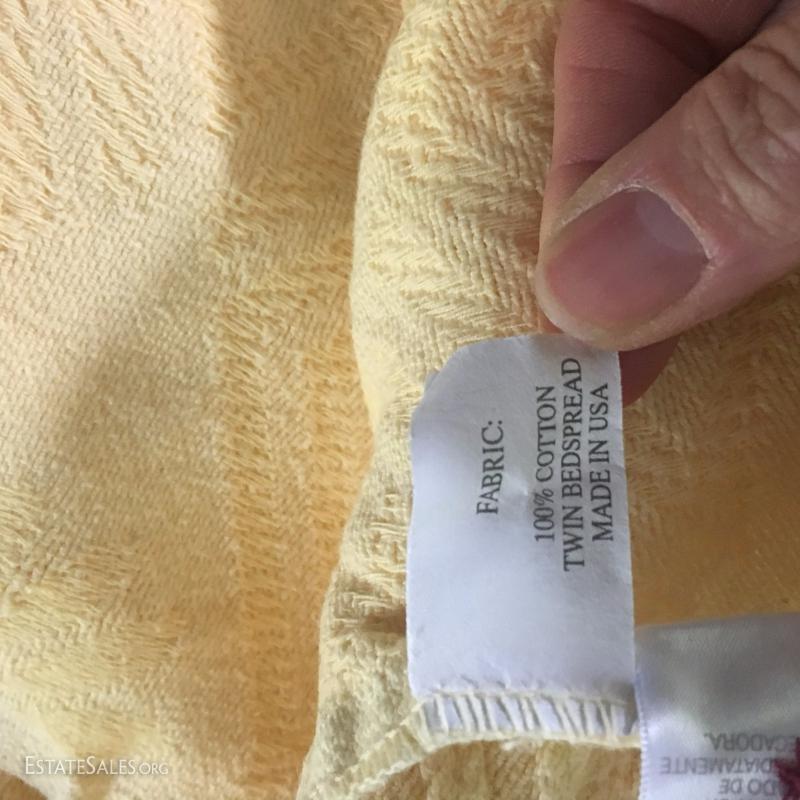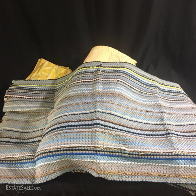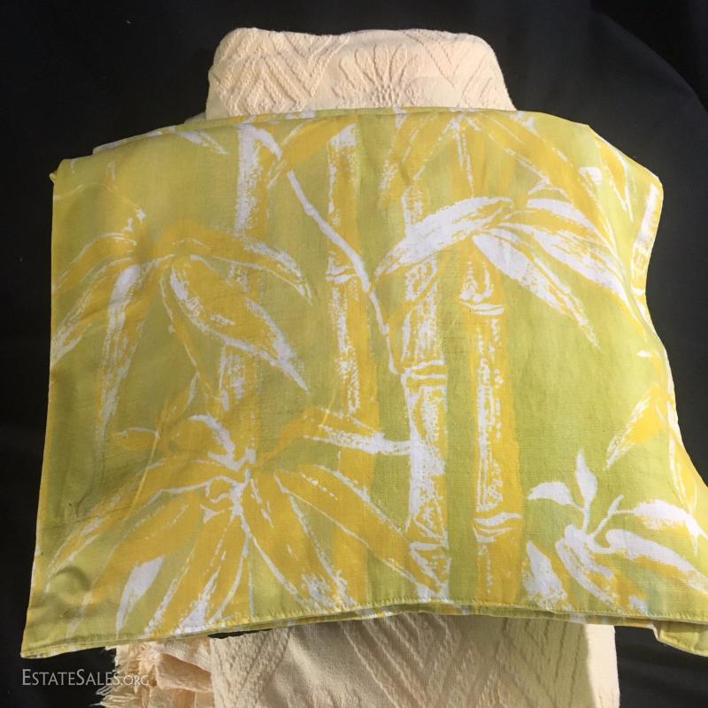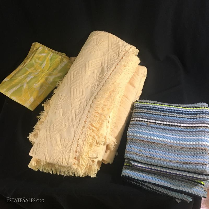 Two twin size Light yellow bed spreads. Two large Vintage Pillow Shams with bright yellow palm design. Three blue color woven rugs.