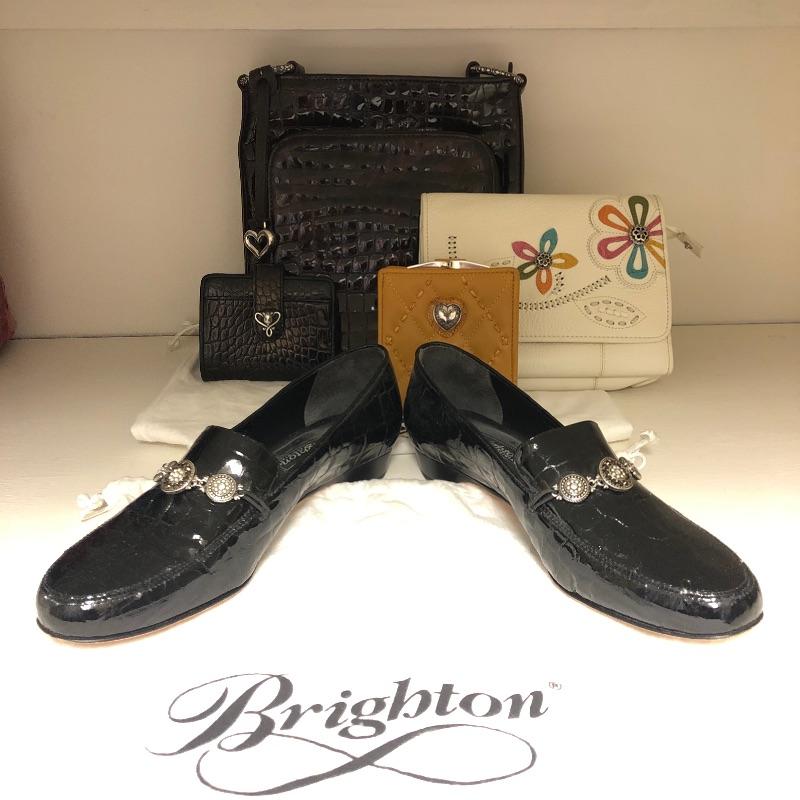 Brighton handbags, wallets, pair of ladies 8m shoes, and two Brighton storage bags.