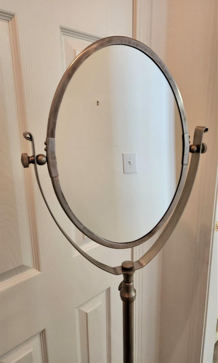 Just the thing for putting on your makeup - no more straining to lean over the sink! Nice (heavy) standing mirror with brushed nickel finish - 61" tall - two sided mirror. Good condition.