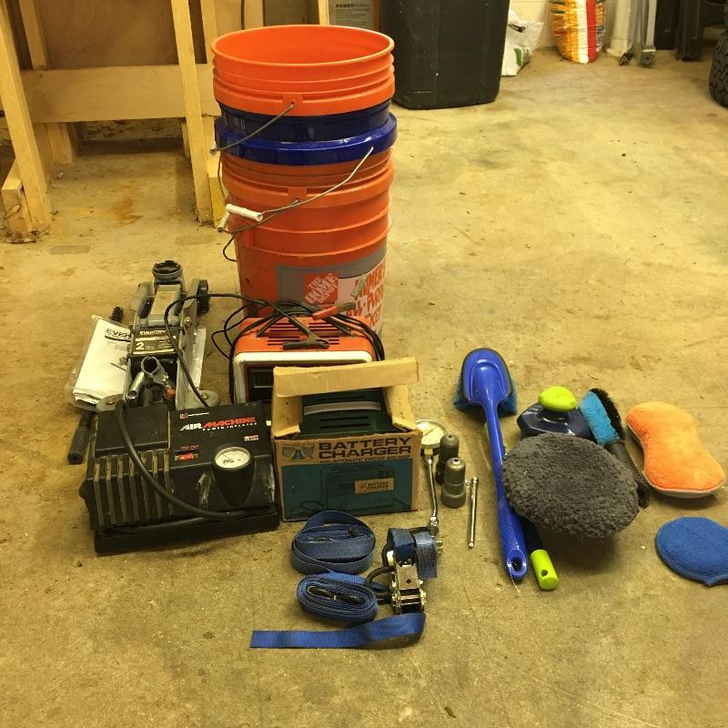 A great lot for the car lover. Lot includes Evercraft 2 ton trolley jack, Porto compression tester, 4 and 6 amp battery chargers, Air Machine Power inflator, two battery terminal cleaners and car wash accessories. Air Machine and jack worked when tested, chargers were not tested.