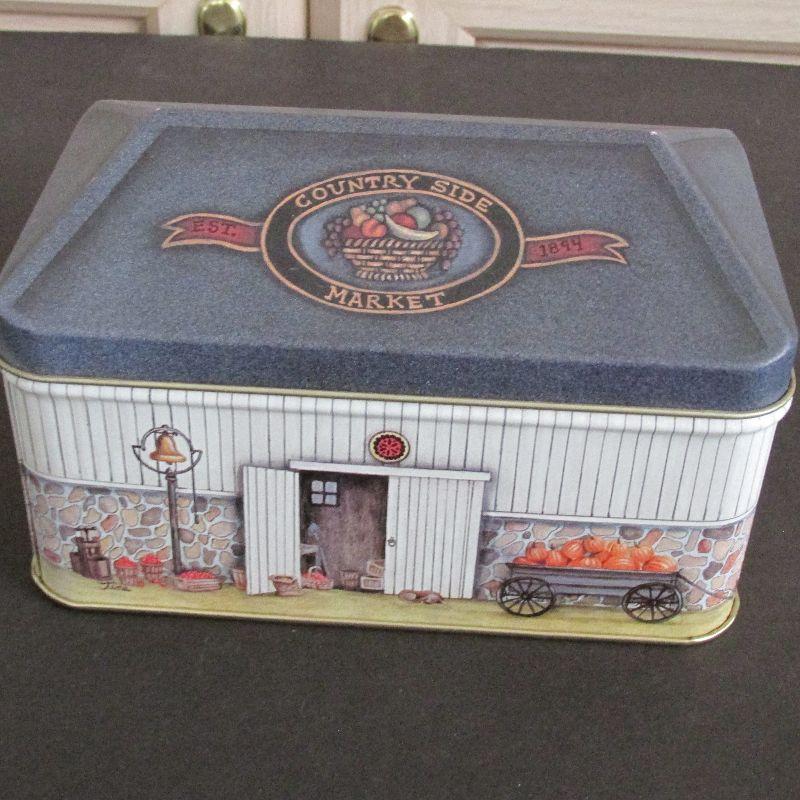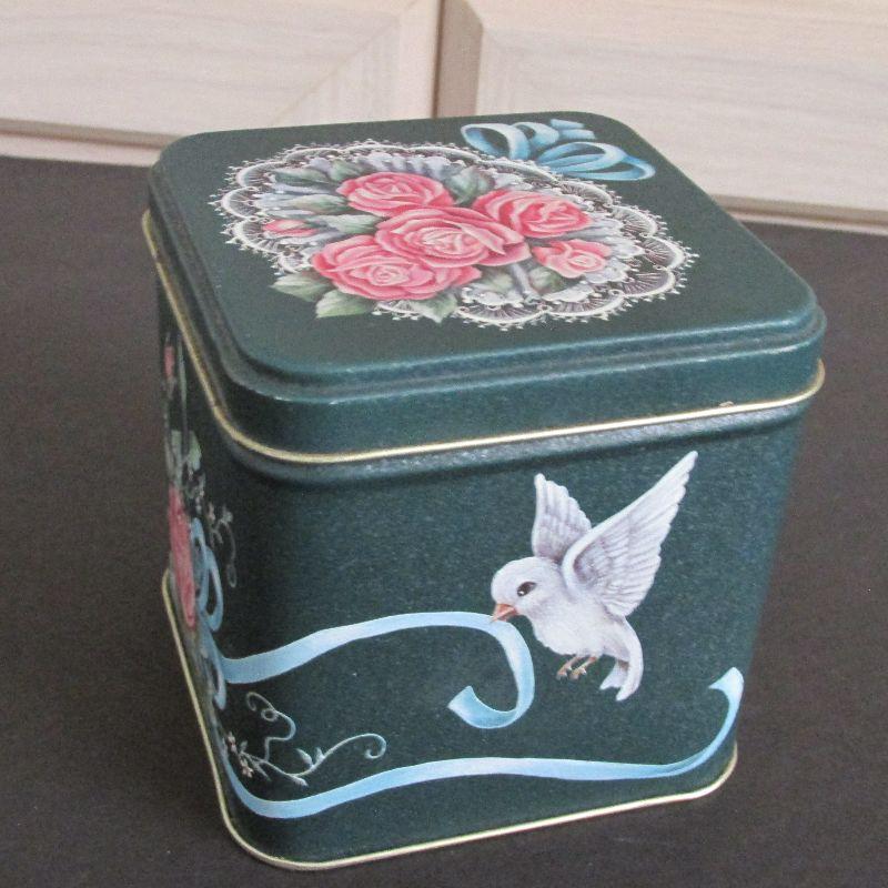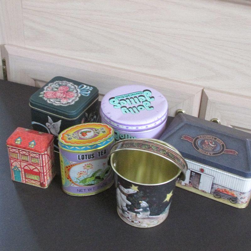 1 house tin from Lilian Veron 1984, 1 Basket Polar Bear tin, 1 Lotus Tea tin, 1 House décor tin from Century Resources Inc., 1 Jolly Jellies Tin, 1 Floral and Bird Décor tin.