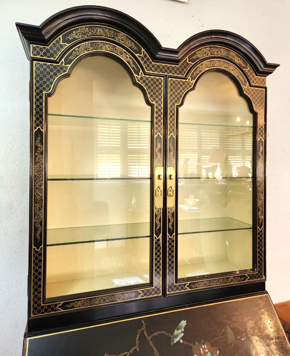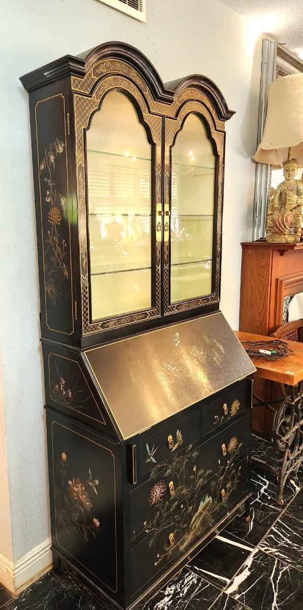 Contemporary Chinese style drop down desk/secretary, 4 drawers, 3 glass shelves. Lights up, no bulb. 3 feet across, 17" deep, 77" tall, Good looking, but needs some love, used condition.