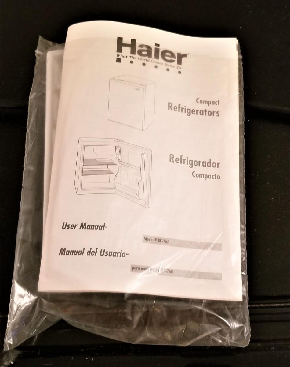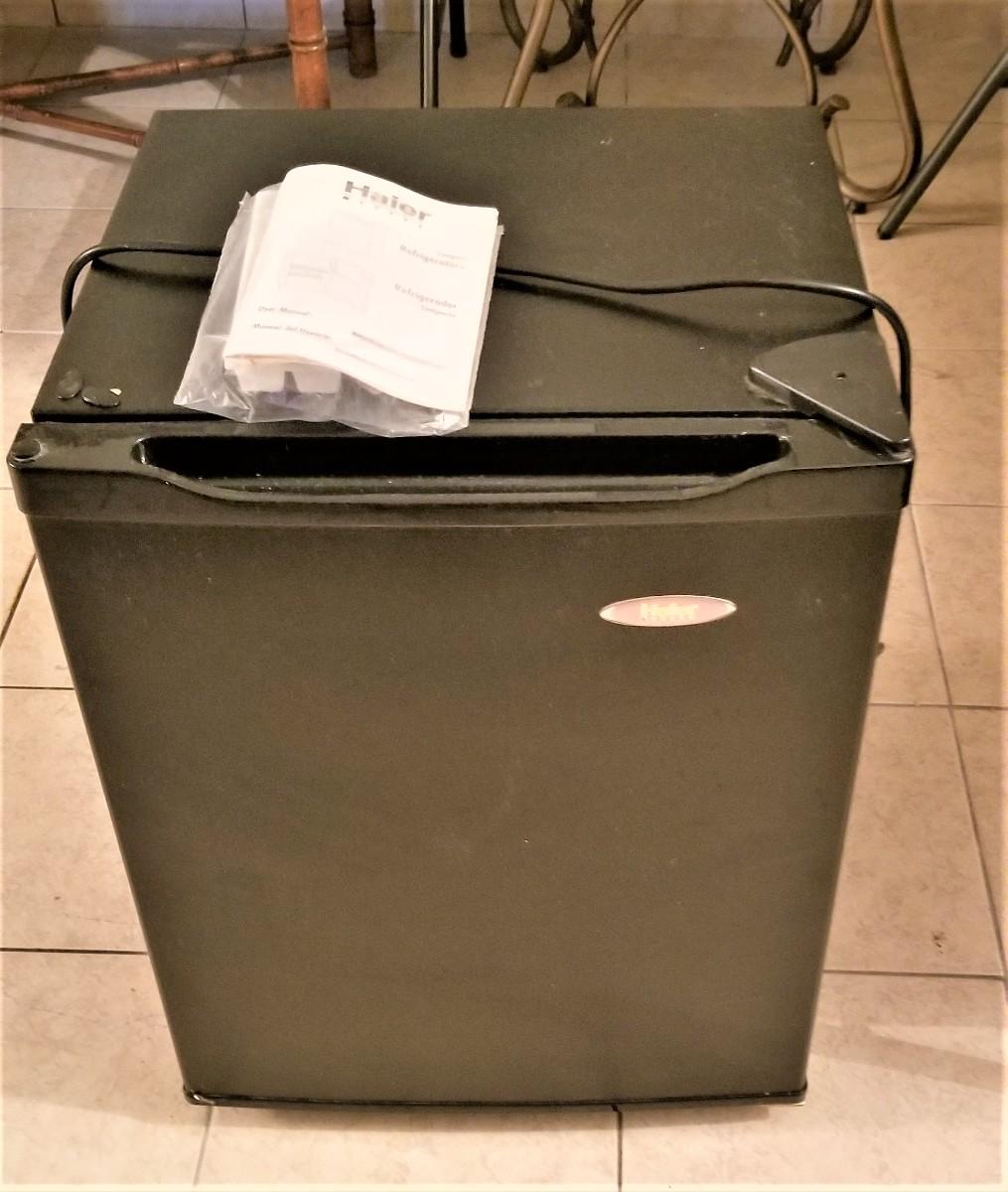 This dorm fridge is super clean - honestly looks unused. Works fine - has book and ice tray. HAIER Model BC-768. 19.5" across, 18" deep, about 26" tall. Black casing.