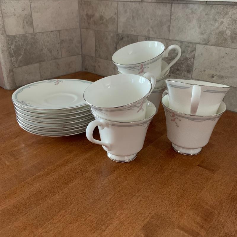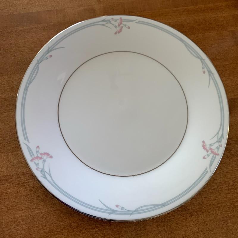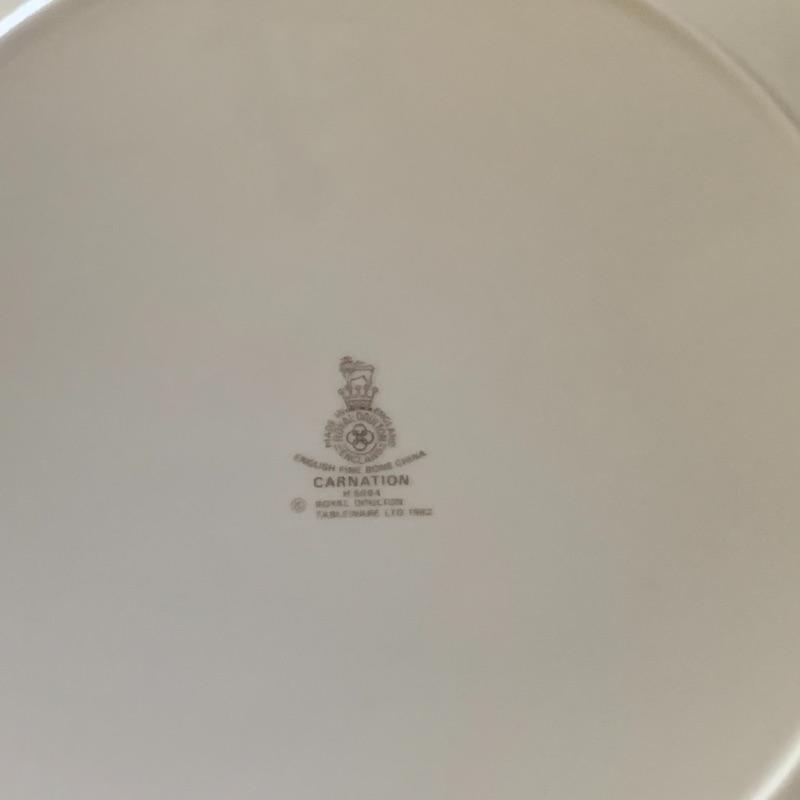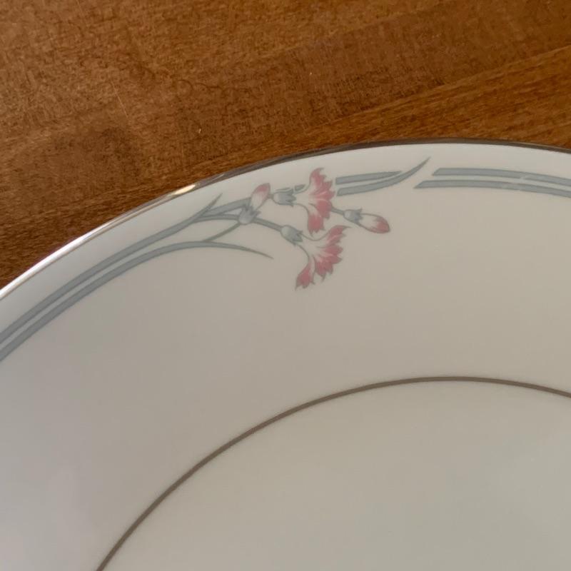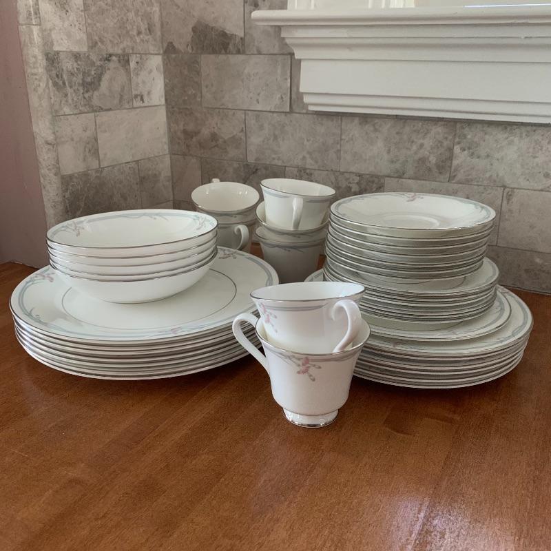 This is a beautiful set of China, in pristine condition. Each plate, bowl, and mug has a delicate carnation motif, and is lined with silver accents. The set was made in England by Royal Doulton. Included is a set of seven large dinner plates, six medium salad plates (and a single one slightly smaller), six small bread plates, five dessert bowls, and seven cups and saucers. Local pickup only.