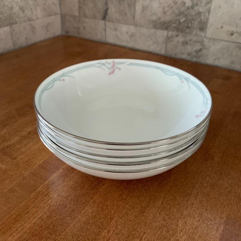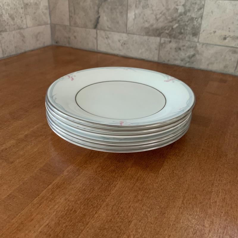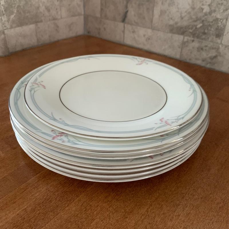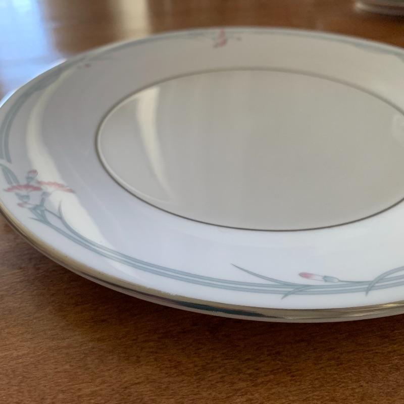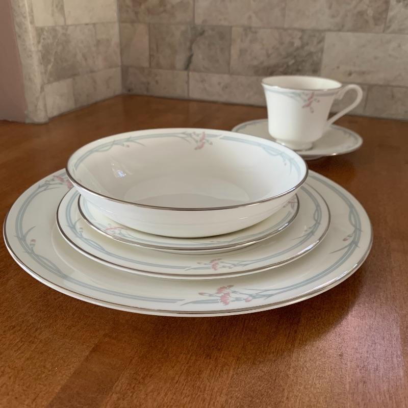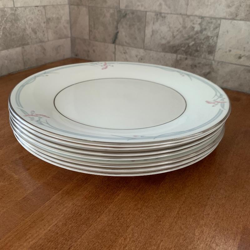 This is a beautiful set of China, in pristine condition. Each plate, bowl, and mug has a delicate carnation motif, and is lined with silver accents. The set was made in England by Royal Doulton. Included is a set of seven large dinner plates, six medium salad plates (and a single one slightly smaller), six small bread plates, five dessert bowls, and seven cups and saucers. Local pickup only.