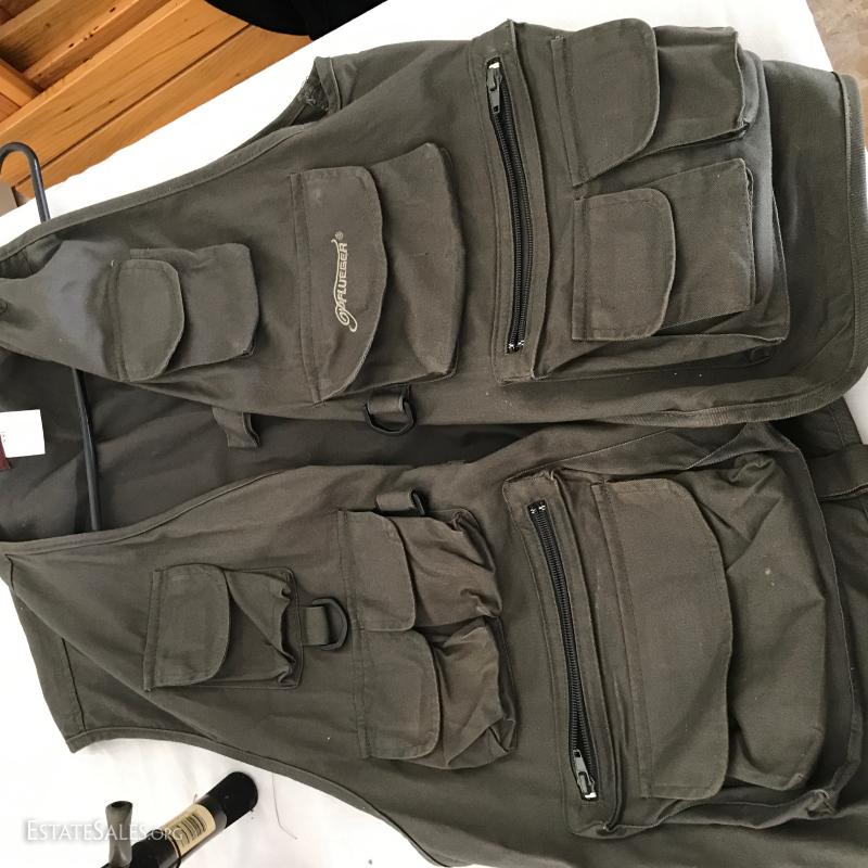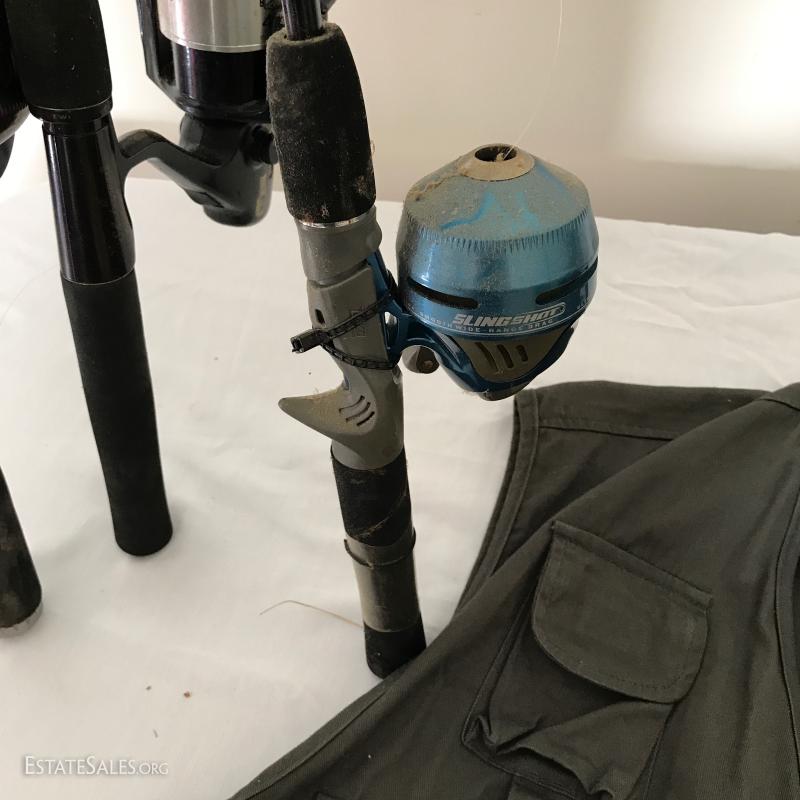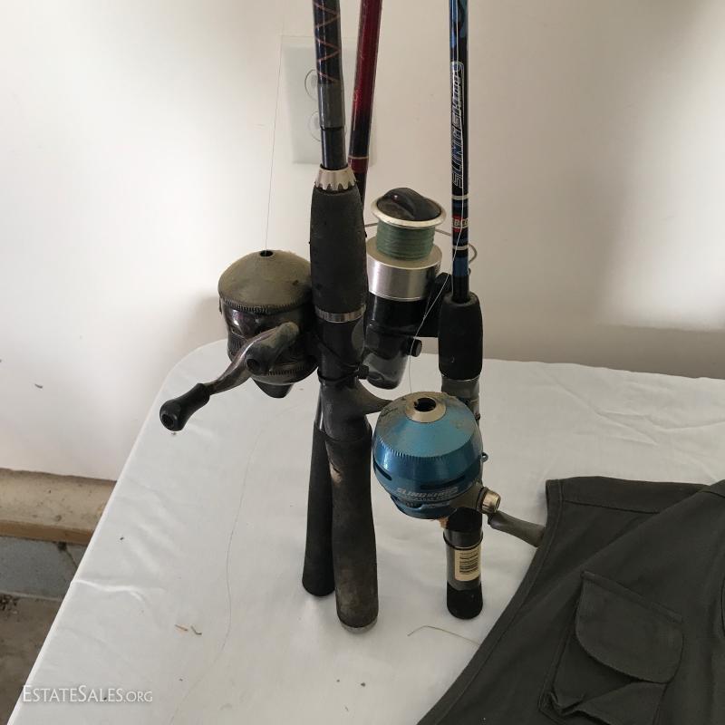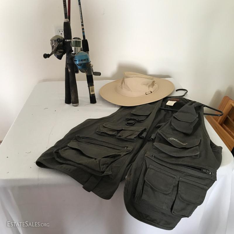 Add to your fishing gear without breaking the bank! Lot includes hat, vest, and three poles with reels. See pics for more details.