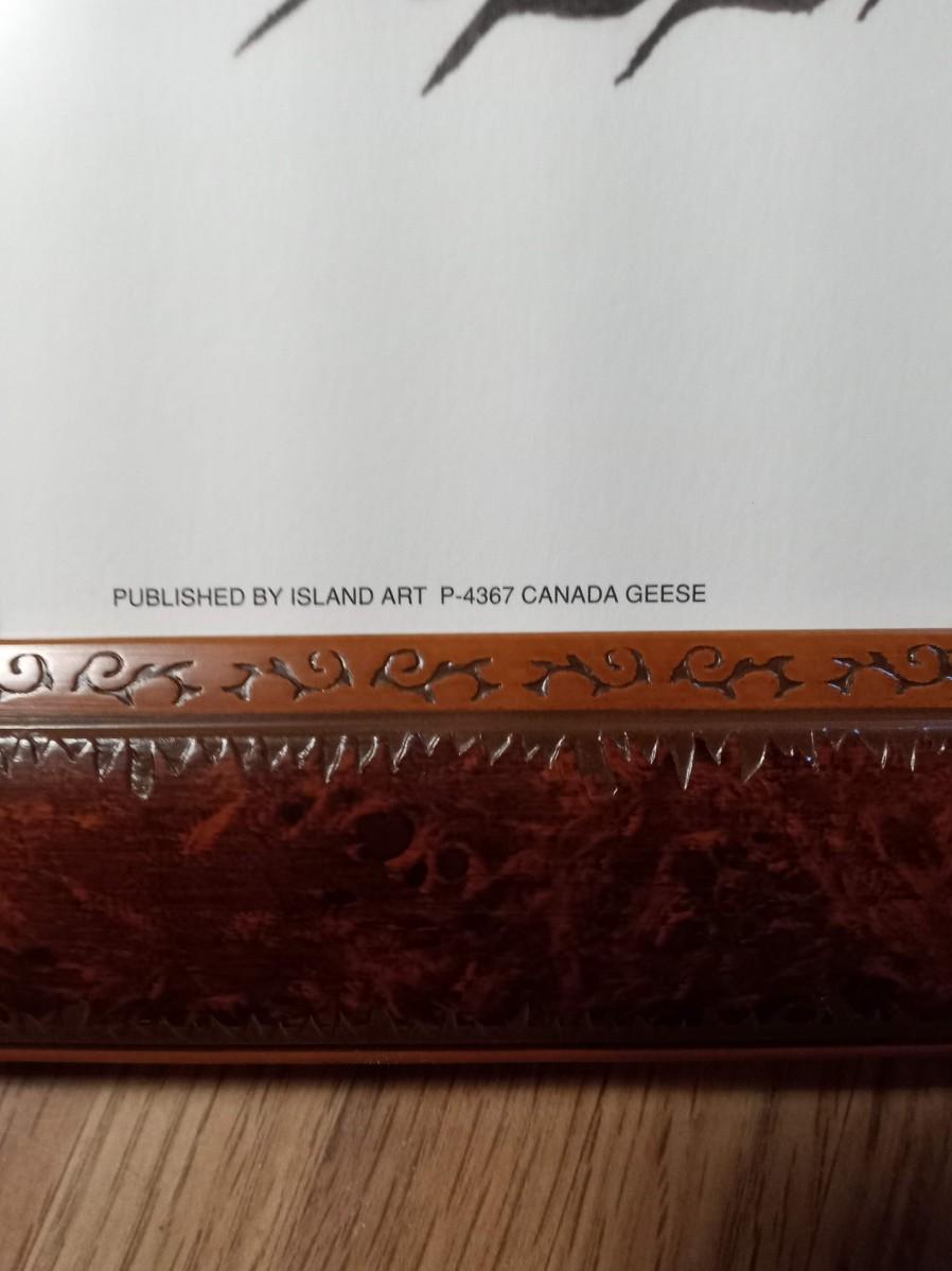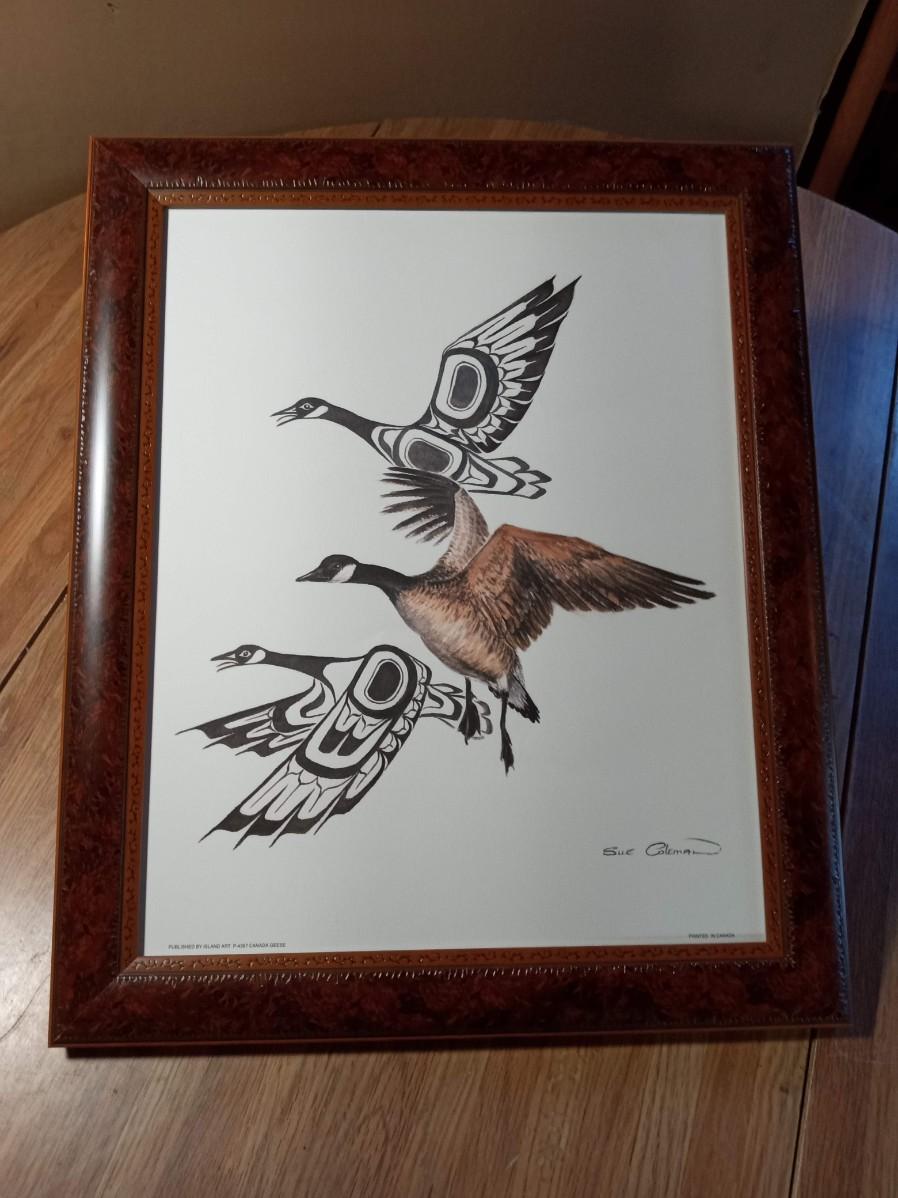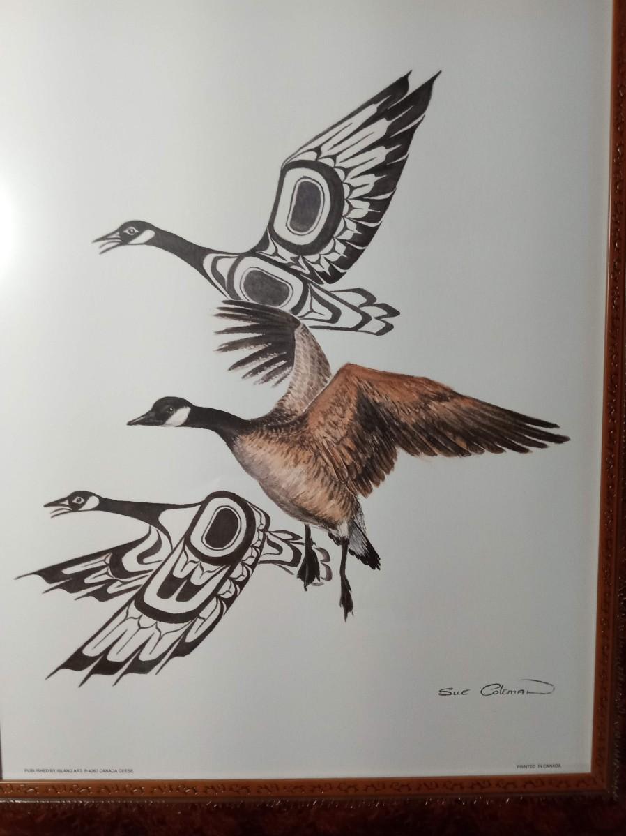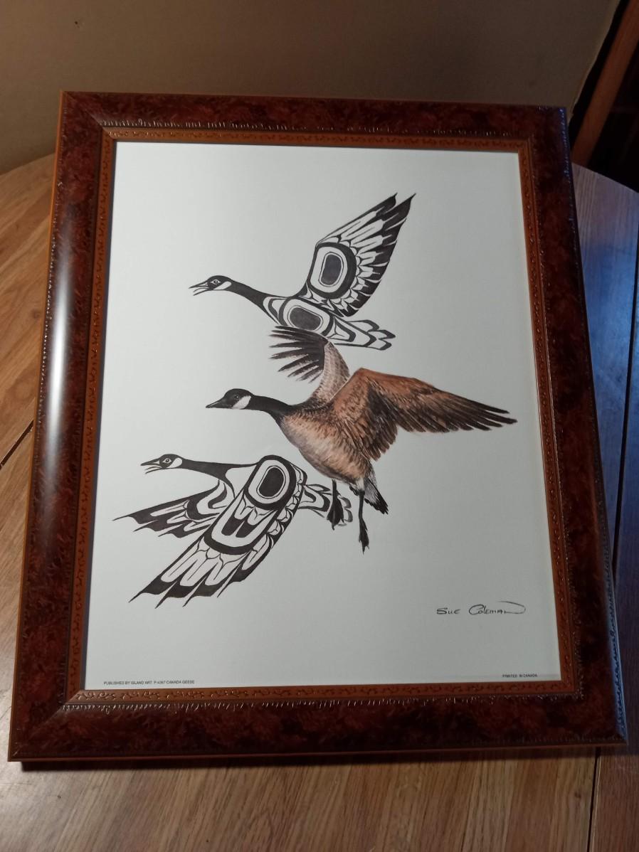 SUE COLEMAN TRIBAL FLOCK OF GEESE. SET IN A BEAUTIFUL WOODEN FRAME. PUBLISHED BY ISLAND ART.