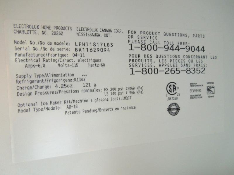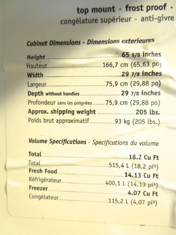 Model LFHT1817LB3. 66" H x 30" W x 30" D. Very clean and no dents or scratches! Top mounted freezer. Frost proof freezer. You will have to take this out sliding doors and around house up a 10% grade dirt hill. Please bring appliance dolly. Weighs 205 Lbs. Includes manual.